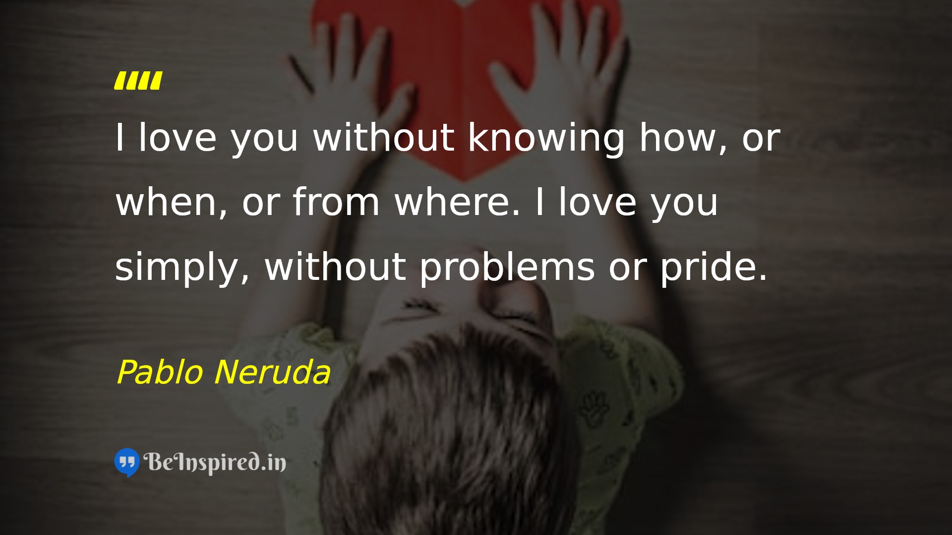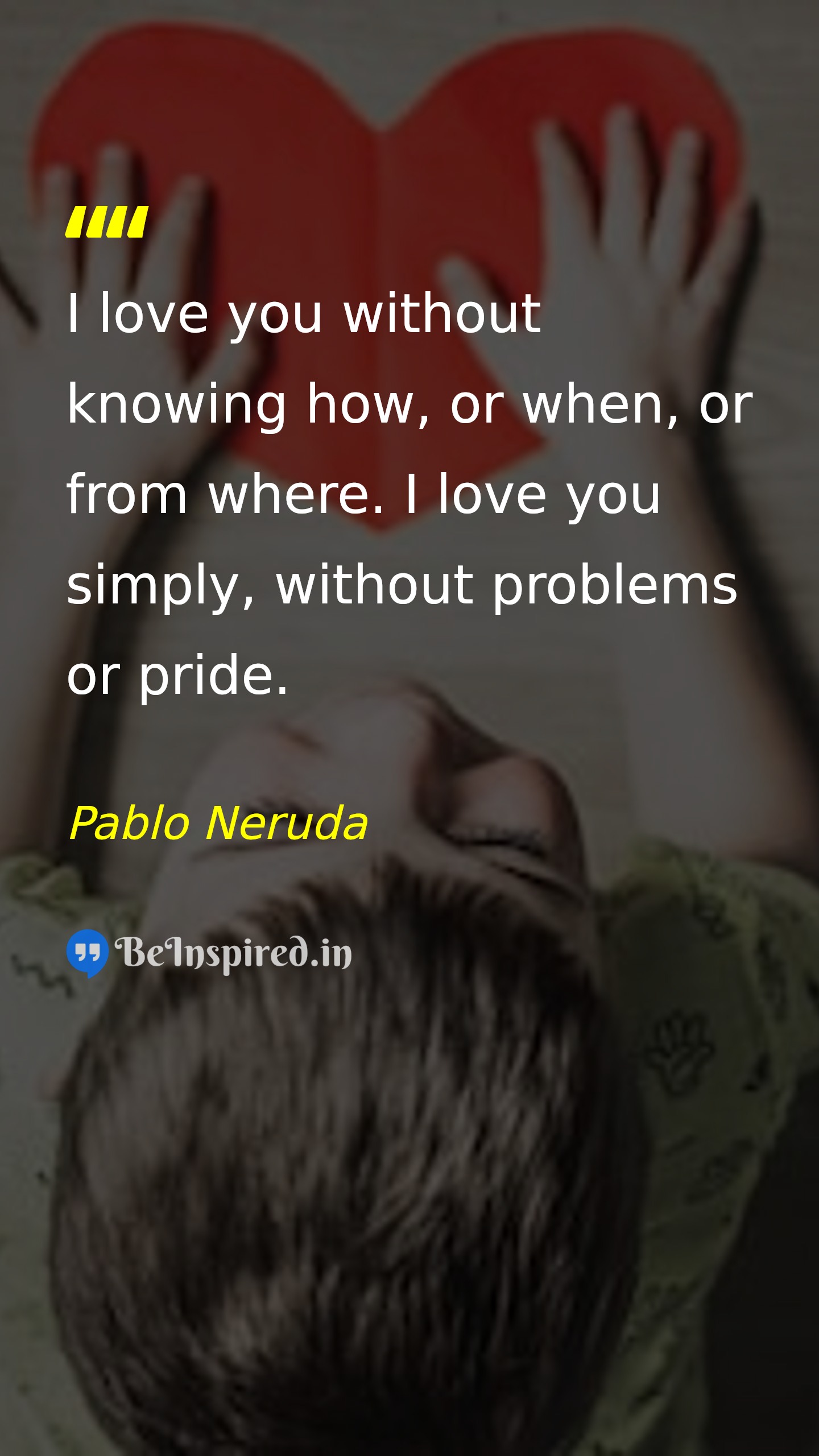 I love you without knowing how, or when, or from where. I love you simply, without problems or pride.