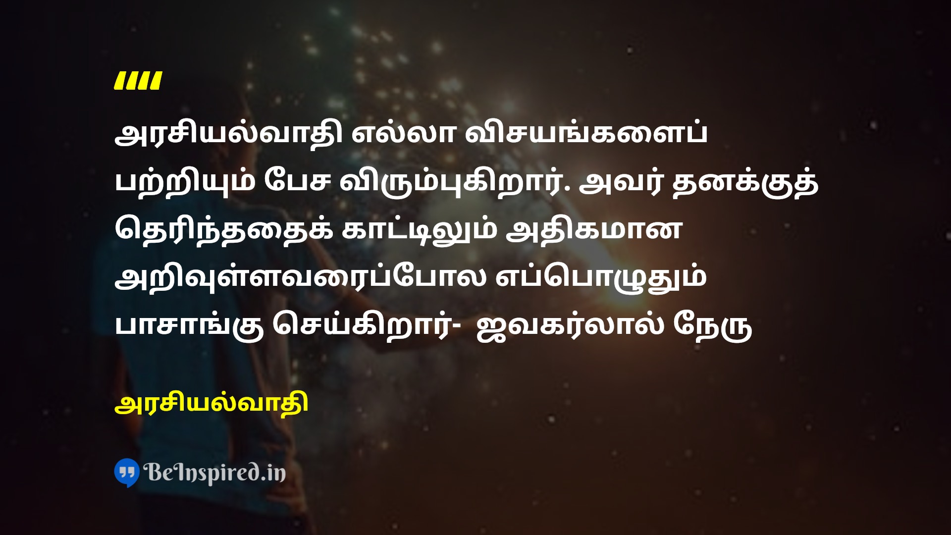 அரசியல்வாதி எல்லா விசயங்களைப் பற்றியும் பேச விரும்புகிறார். அவர் தனக்குத் தெரிந்ததைக் காட்டிலும் அதிகமான அறிவுள்ளவரைப்போல எப்பொழுதும் பாசாங்கு செய்கிறார்- ஜவகர்லால் நேரு