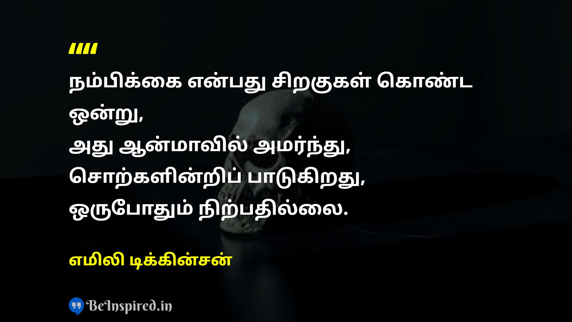 நம்பிக்கை என்பது சிறகுகள் கொண்ட ஒன்று, அது ஆன்மாவில் அமர்ந்து, சொற்களின்றிப் பாடுகிறது, ஒருபோதும் நிற்பதில்லை.