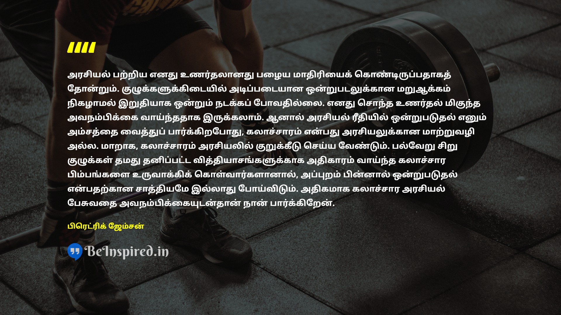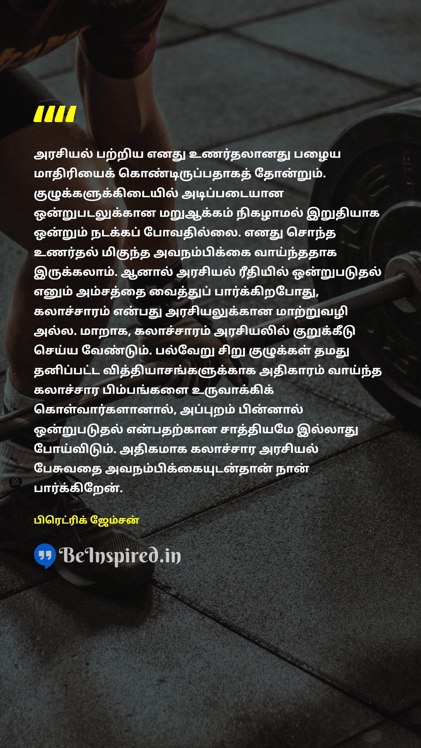 அரசியல் பற்றிய எனது உணர்தலானது பழைய மாதிரியைக் கொண்டிருப்பதாகத் தோன்றும். குழுக்களுக்கிடையில் அடிப்படையான ஒன்றுபடலுக்கான மறுஆக்கம் நிகழாமல் இறுதியாக ஒன்றும் நடக்கப் போவதில்லை. எனது சொந்த உணர்தல் மிகுந்த அவநம்பிக்கை வாய்ந்ததாக இருக்கலாம். ஆனால் அரசியல் ரீதியில் ஒன்றுபடுதல் எனும் அம்சத்தை வைத்துப் பார்க்கிறபோது, கலாச்சாரம் என்பது அரசியலுக்கான மாற்றுவழி அல்ல. மாறாக, கலாச்சாரம் அரசியலில் குறுக்கீடு செய்ய வேண்டும். பல்வேறு சிறு குழுக்கள் தமது தனிப்பட்ட வித்தியாசங்களுக்காக அதிகாரம் வாய்ந்த கலாச்சார பிம்பங்களை உருவாக்கிக் கொள்வார்களானால், அப்புறம் பின்னால் ஒன்றுபடுதல் என்பதற்கான சாத்தியமே இல்லாது போய்விடும். அதிகமாக கலாச்சார அரசியல் பேசுவதை அவநம்பிக்கையுடன்தான் நான் பார்க்கிறேன்.