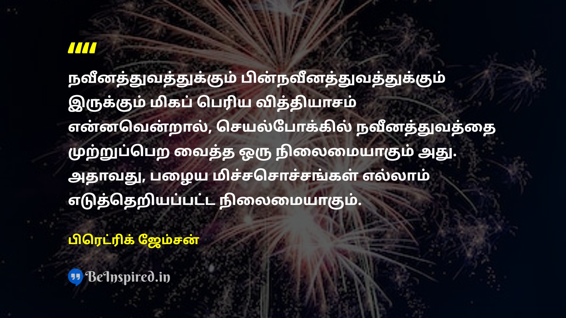 நவீனத்துவத்துக்கும் பின்நவீனத்துவத்துக்கும் இருக்கும் மிகப் பெரிய வித்தியாசம் என்னவென்றால், செயல்போக்கில் நவீனத்துவத்தை முற்றுப்பெற வைத்த ஒரு நிலைமையாகும் அது. அதாவது, பழைய மிச்சசொச்சங்கள் எல்லாம் எடுத்தெறியப்பட்ட நிலைமையாகும்.
