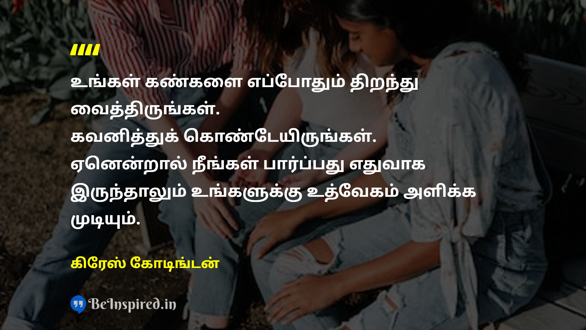 உங்கள் கண்களை எப்போதும் திறந்து வைத்திருங்கள். கவனித்துக் கொண்டேயிருங்கள். ஏனென்றால் நீங்கள் பார்ப்பது எதுவாக இருந்தாலும் உங்களுக்கு உத்வேகம் அளிக்க முடியும்.