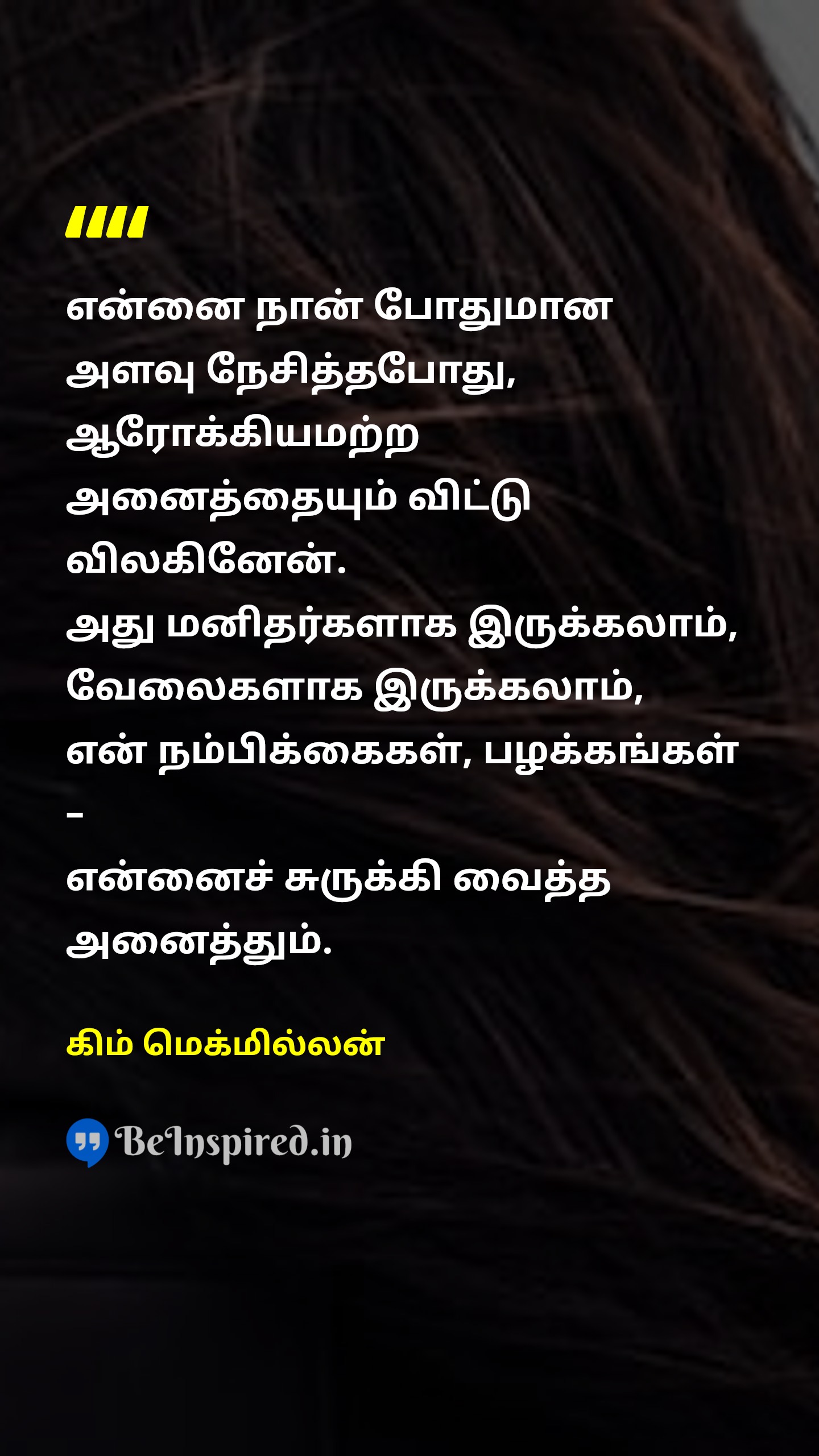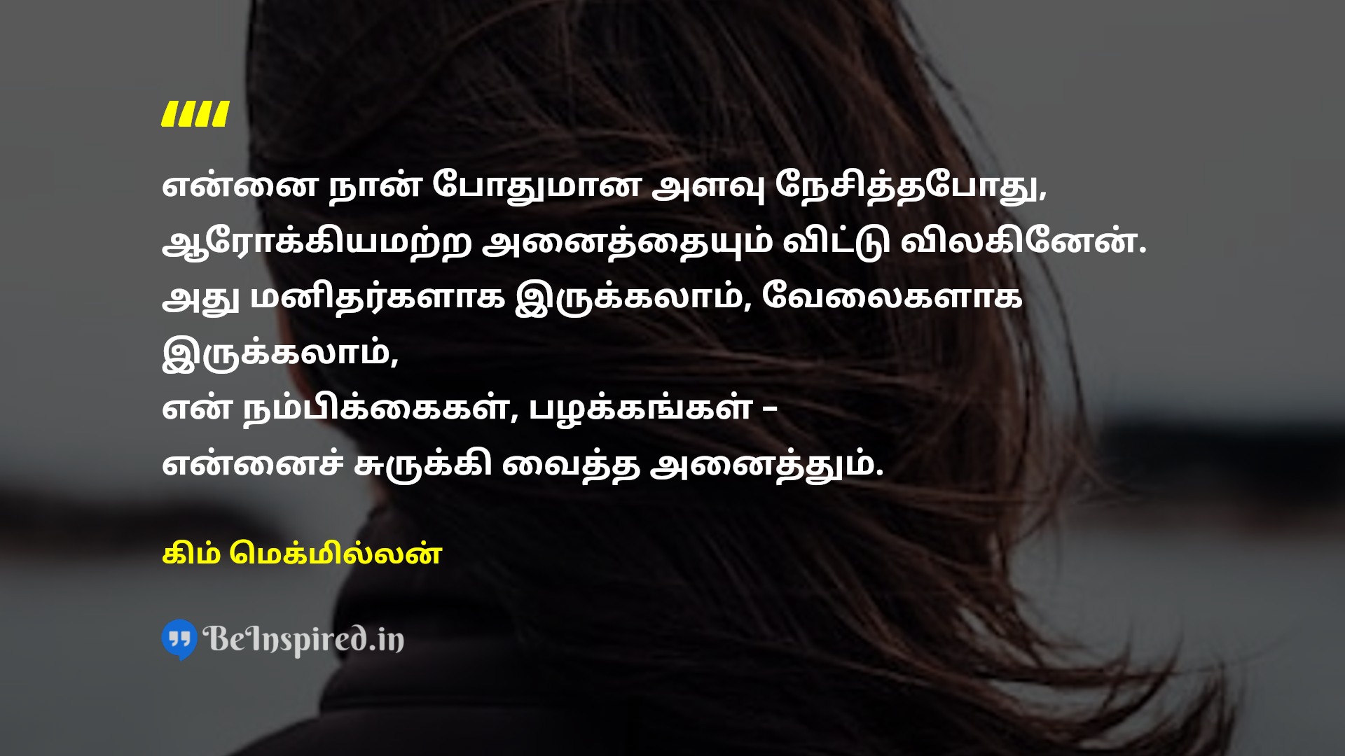 என்னை நான் போதுமான அளவு நேசித்தபோது, ஆரோக்கியமற்ற அனைத்தையும் விட்டு விலகினேன். அது மனிதர்களாக இருக்கலாம், வேலைகளாக இருக்கலாம், என் நம்பிக்கைகள், பழக்கங்கள் – என்னைச் சுருக்கி வைத்த அனைத்தும்.
