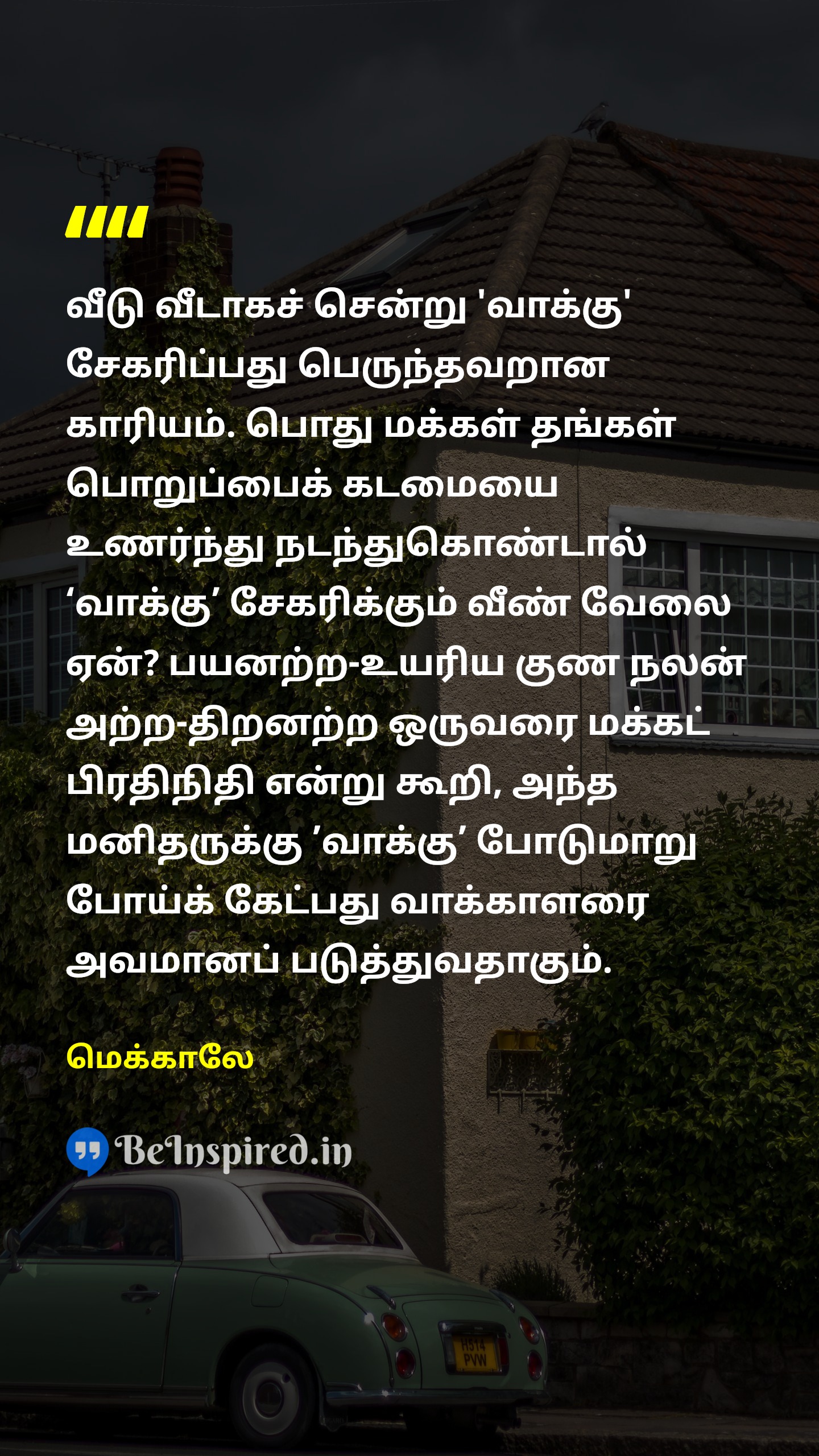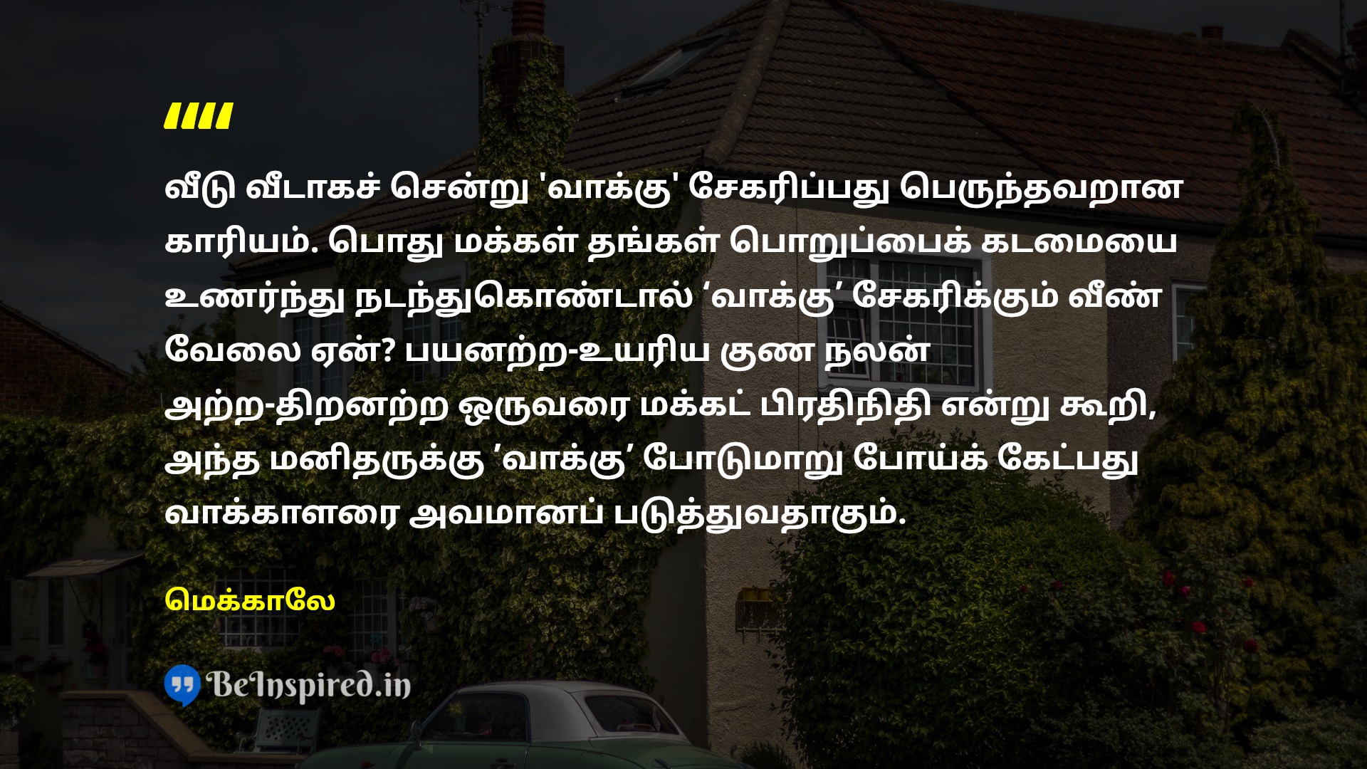 வீடு வீடாகச் சென்று 'வாக்கு' சேகரிப்பது பெருந்தவறான காரியம். பொது மக்கள் தங்கள் பொறுப்பைக் கடமையை உணர்ந்து நடந்துகொண்டால் ‘வாக்கு’ சேகரிக்கும் வீண் வேலை ஏன்? பயனற்ற-உயரிய குண நலன் அற்ற-திறனற்ற ஒருவரை மக்கட் பிரதிநிதி என்று கூறி, அந்த மனிதருக்கு ’வாக்கு’ போடுமாறு போய்க் கேட்பது வாக்காளரை அவமானப் படுத்துவதாகும்.