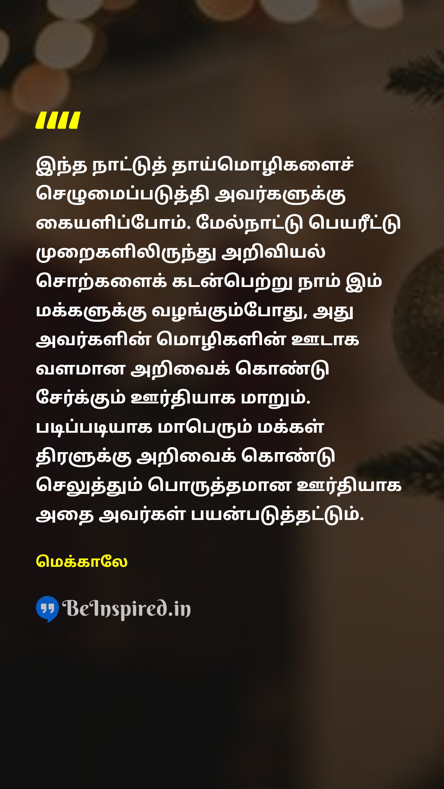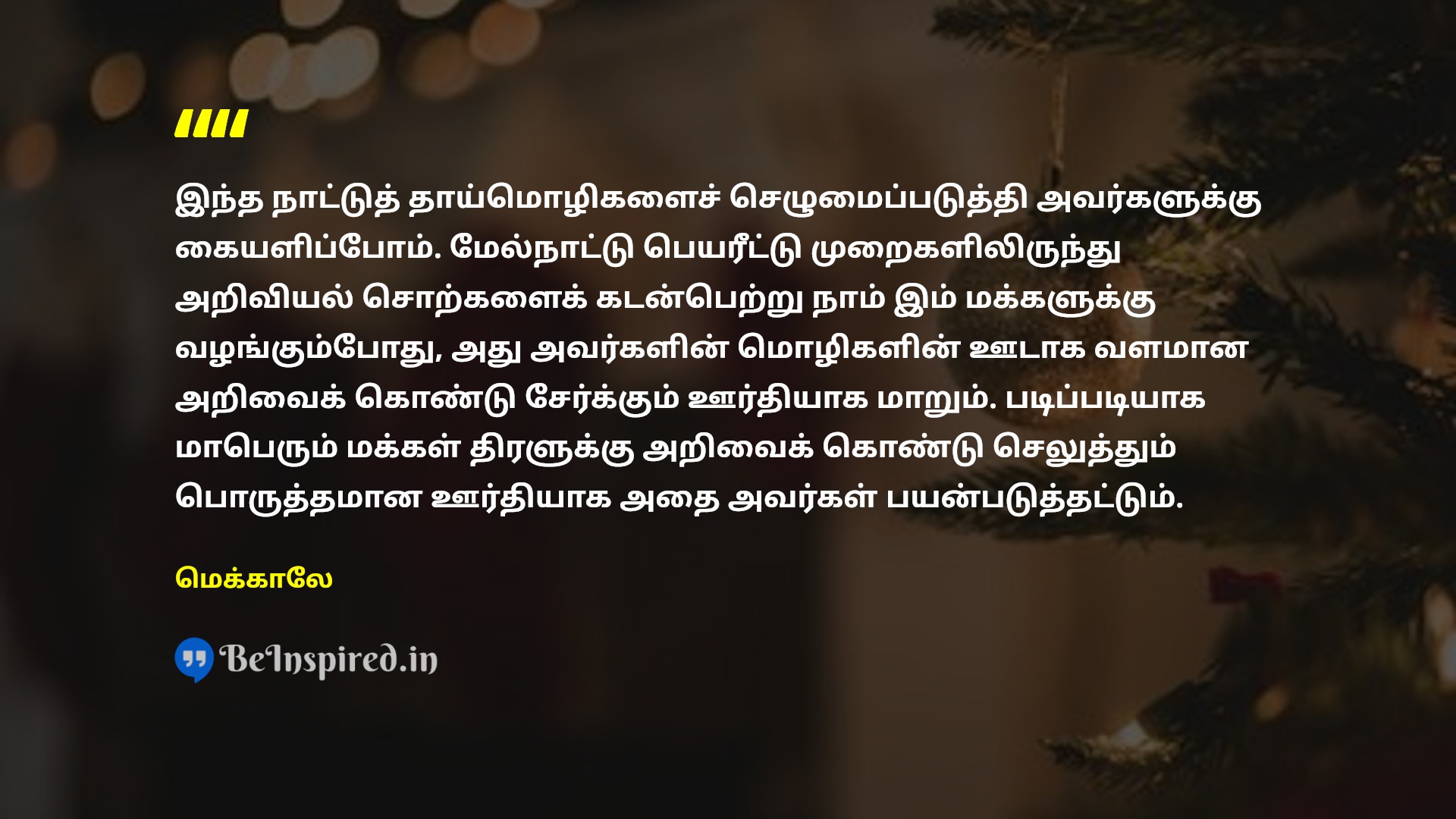 இந்த நாட்டுத் தாய்மொழிகளைச் செழுமைப்படுத்தி அவர்களுக்கு கையளிப்போம். மேல்நாட்டு பெயரீட்டு முறைகளிலிருந்து அறிவியல் சொற்களைக் கடன்பெற்று நாம் இம் மக்களுக்கு வழங்கும்போது, அது அவர்களின் மொழிகளின் ஊடாக வளமான அறிவைக் கொண்டு சேர்க்கும் ஊர்தியாக மாறும். படிப்படியாக மாபெரும் மக்கள் திரளுக்கு அறிவைக் கொண்டு செலுத்தும் பொருத்தமான ஊர்தியாக அதை அவர்கள் பயன்படுத்தட்டும்.