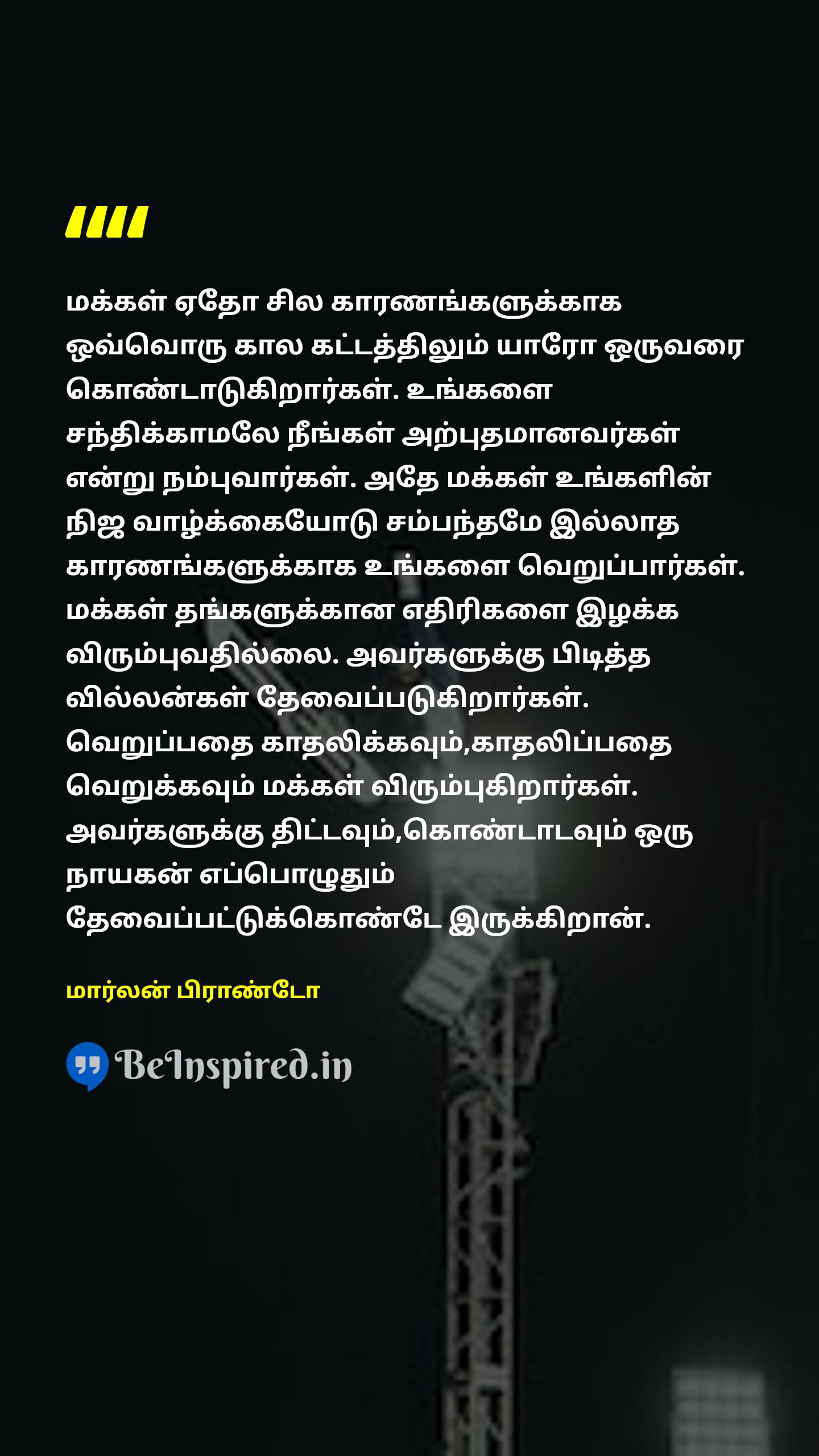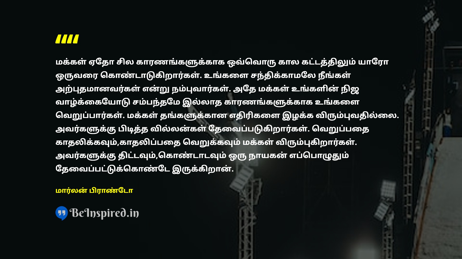 மக்கள் ஏதோ சில காரணங்களுக்காக ஒவ்வொரு கால கட்டத்திலும் யாரோ ஒருவரை கொண்டாடுகிறார்கள். உங்களை சந்திக்காமலே நீங்கள் அற்புதமானவர்கள் என்று நம்புவார்கள். அதே மக்கள் உங்களின் நிஜ வாழ்க்கையோடு சம்பந்தமே இல்லாத காரணங்களுக்காக உங்களை வெறுப்பார்கள். மக்கள் தங்களுக்கான எதிரிகளை இழக்க விரும்புவதில்லை. அவர்களுக்கு பிடித்த வில்லன்கள் தேவைப்படுகிறார்கள். வெறுப்பதை காதலிக்கவும்,காதலிப்பதை வெறுக்கவும் மக்கள் விரும்புகிறார்கள். அவர்களுக்கு திட்டவும்,கொண்டாடவும் ஒரு நாயகன் எப்பொழுதும் தேவைப்பட்டுக்கொண்டே இருக்கிறான்.