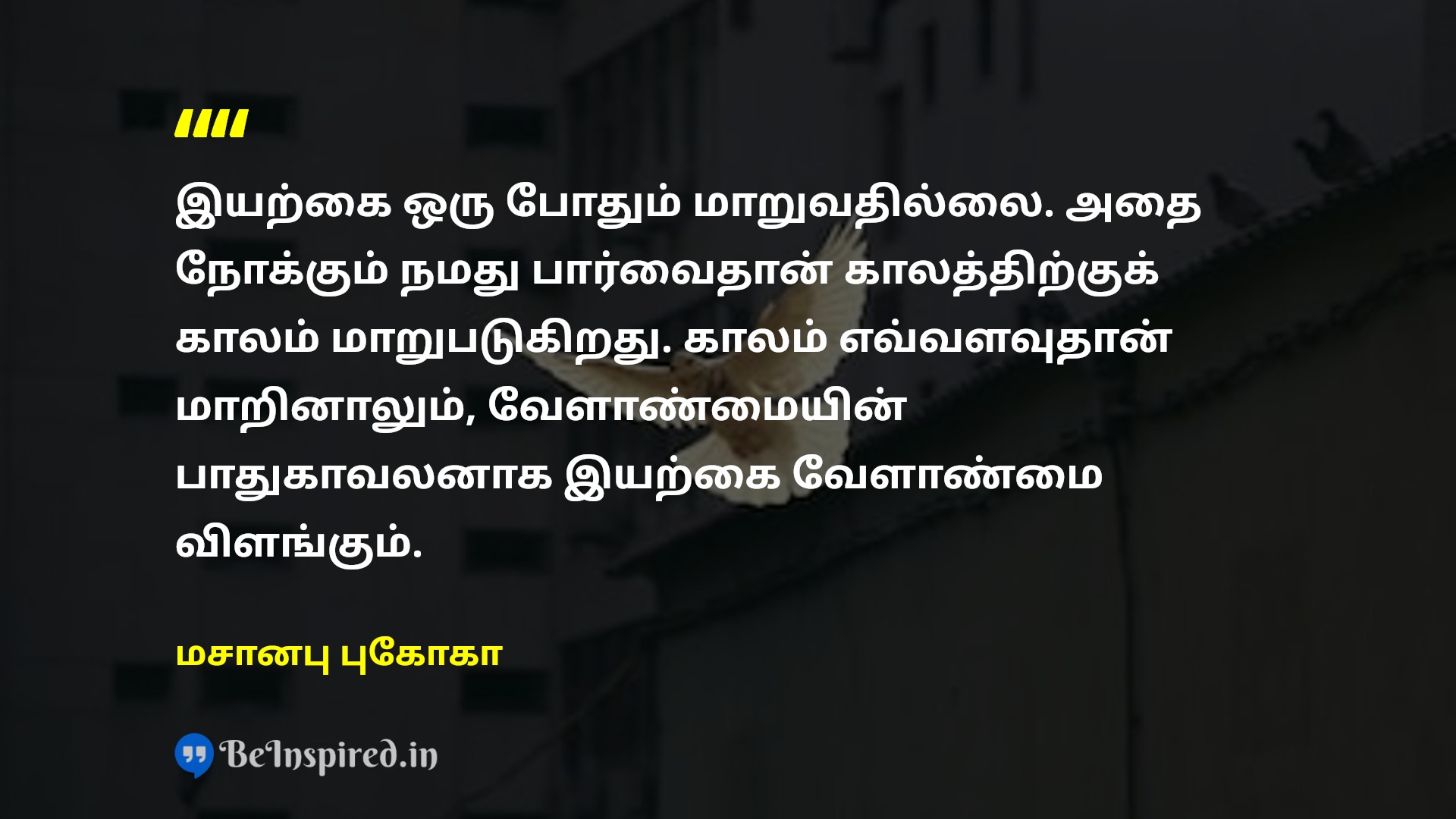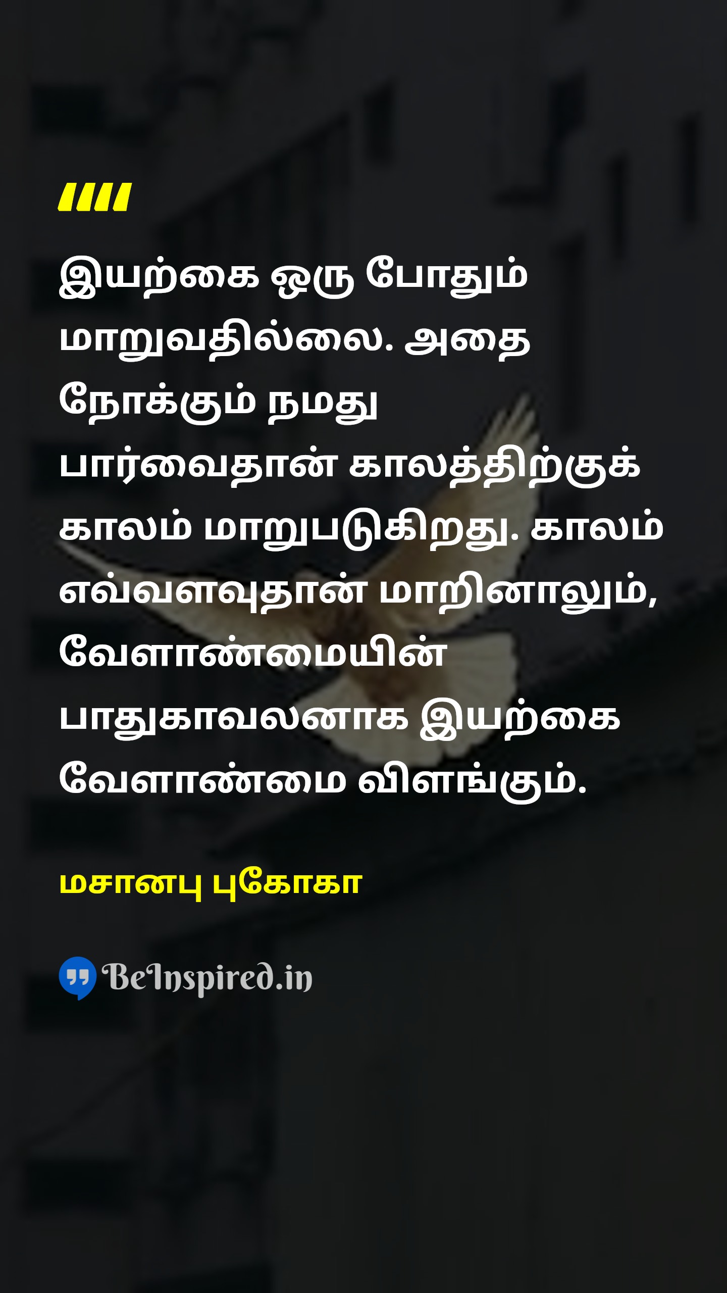 இயற்கை ஒரு போதும் மாறுவதில்லை. அதை நோக்கும் நமது பார்வைதான் காலத்திற்குக் காலம் மாறுபடுகிறது. காலம் எவ்வளவுதான் மாறினாலும், வேளாண்மையின் பாதுகாவலனாக இயற்கை வேளாண்மை விளங்கும்.