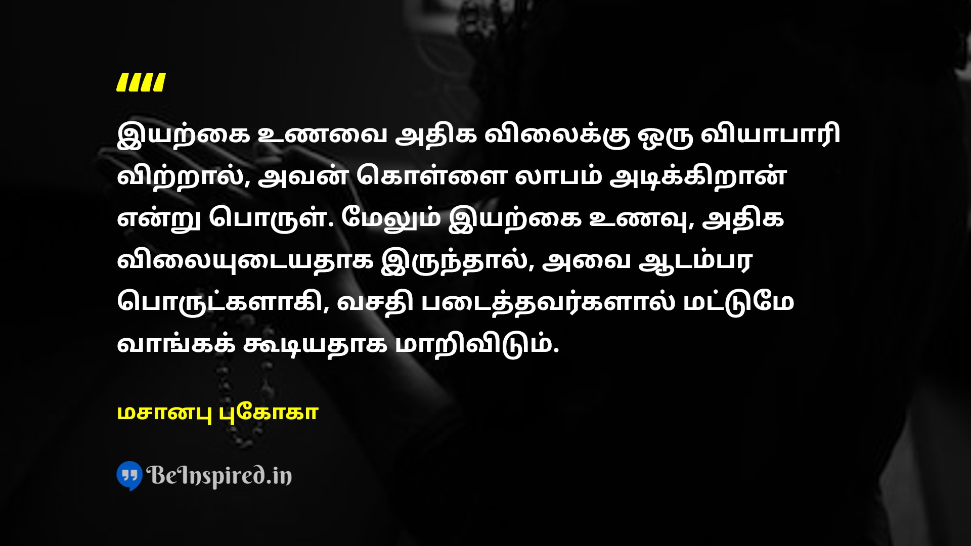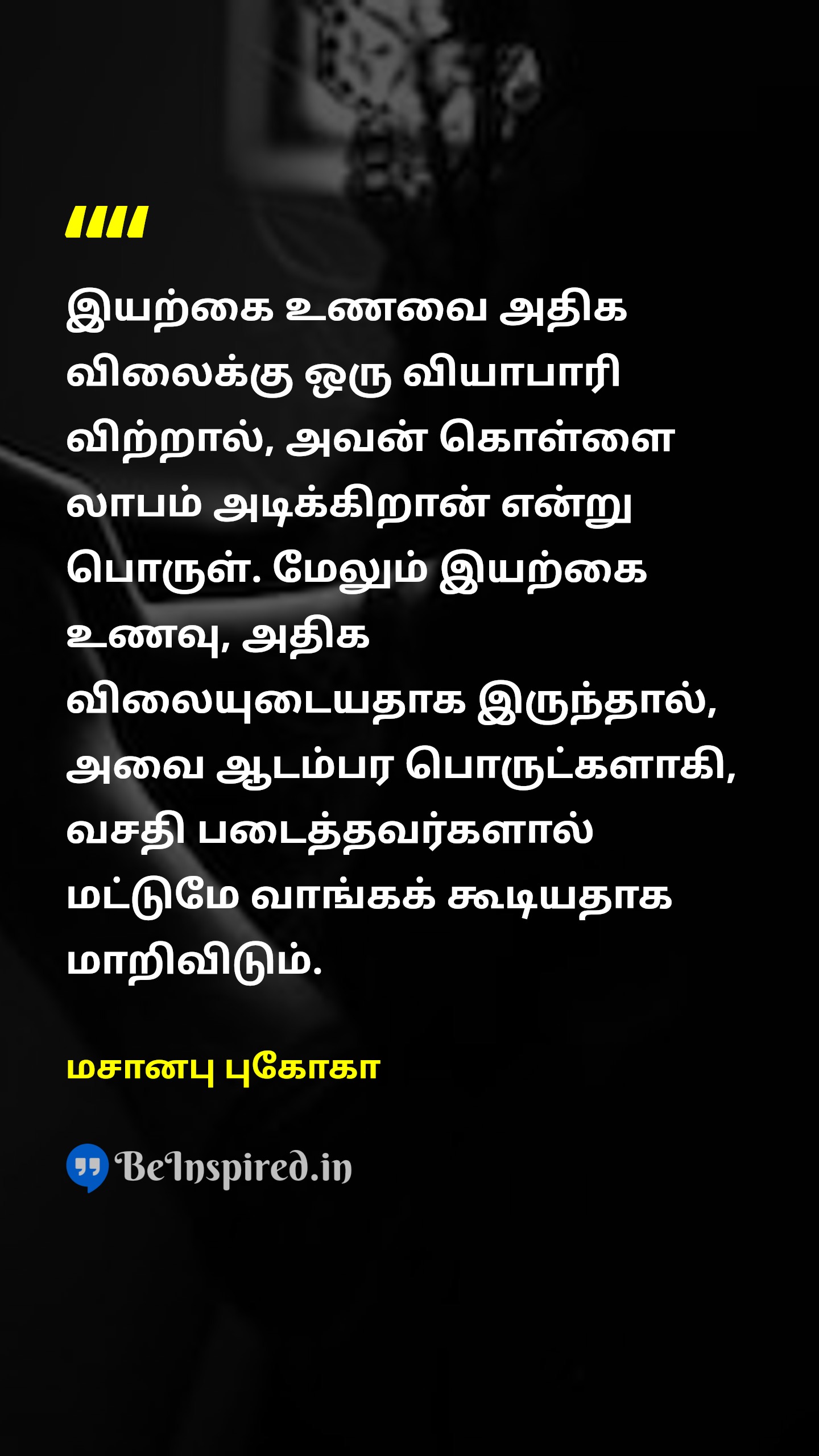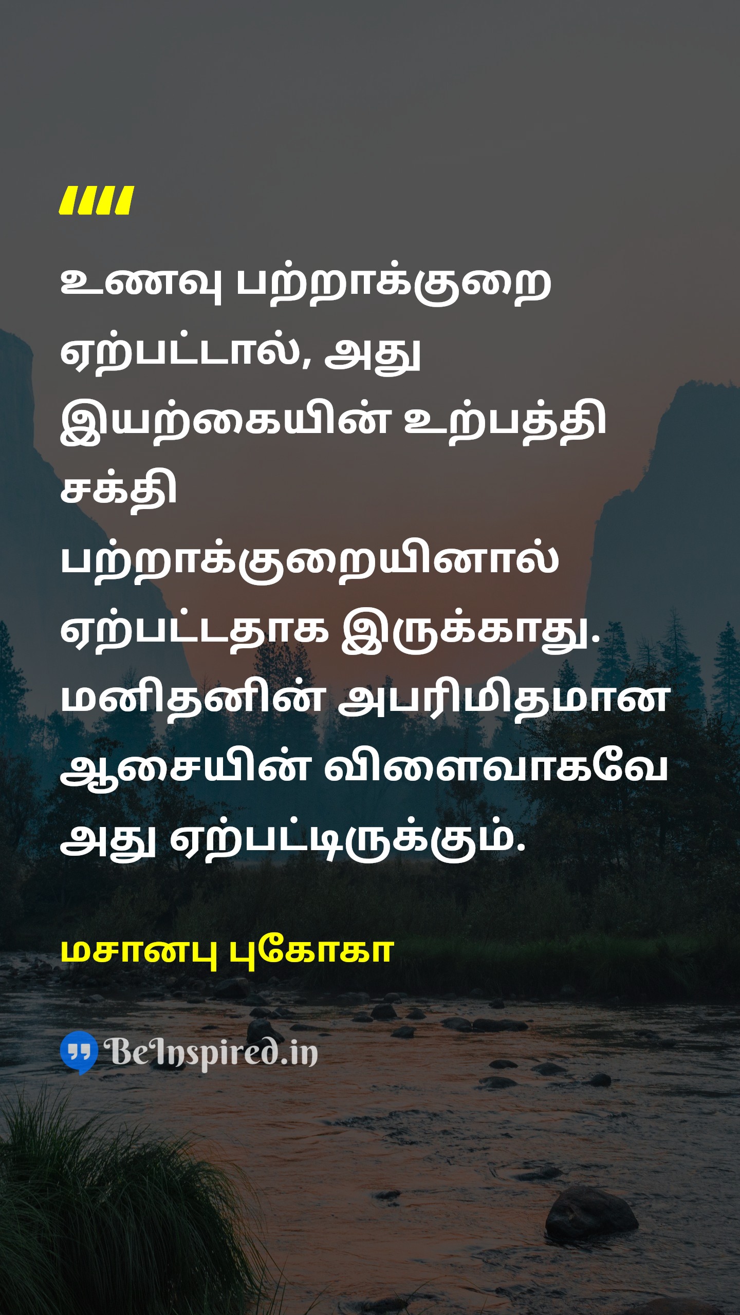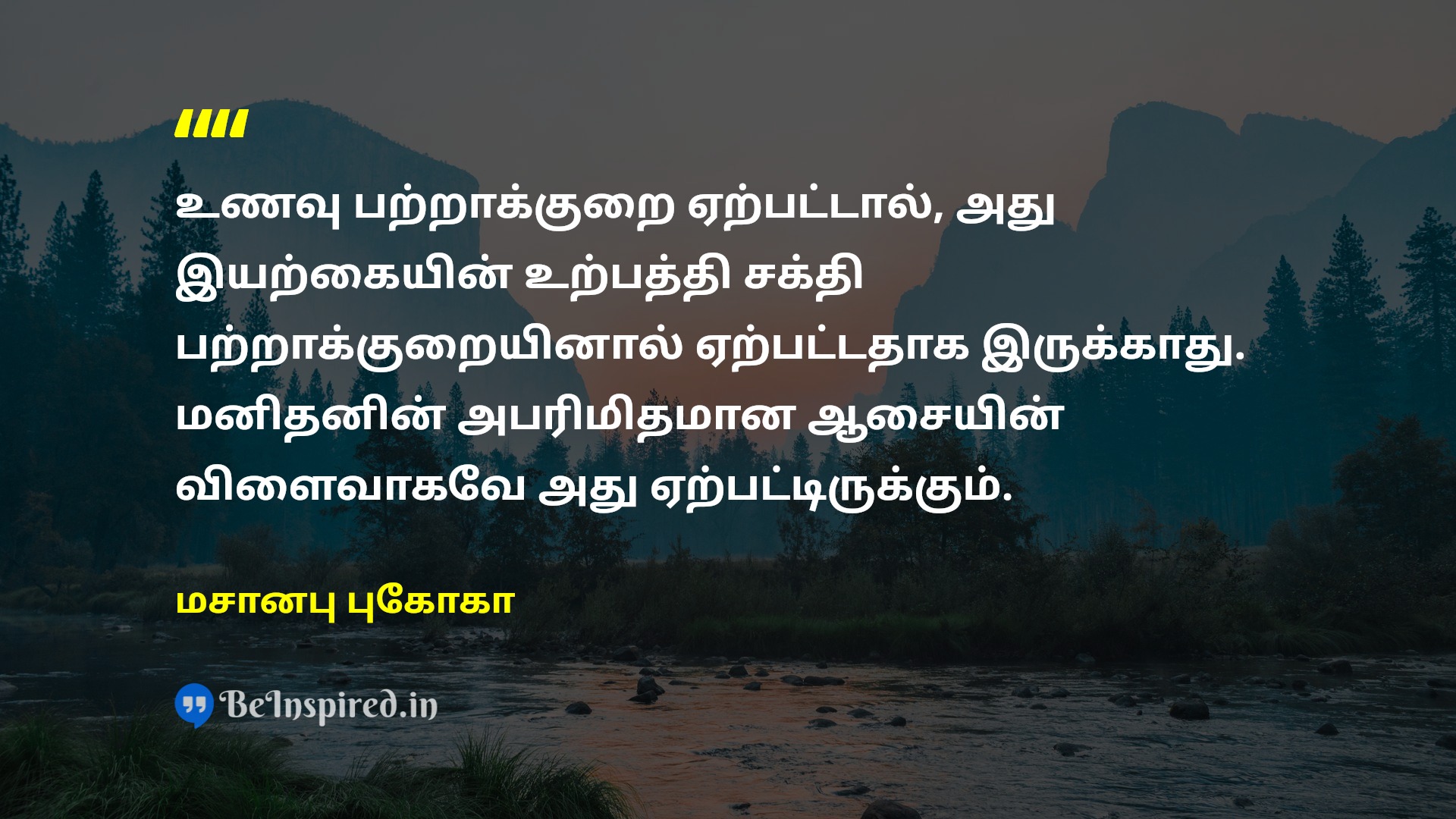 உணவு பற்றாக்குறை ஏற்பட்டால், அது இயற்கையின் உற்பத்தி சக்தி பற்றாக்குறையினால் ஏற்பட்டதாக இருக்காது. மனிதனின் அபரிமிதமான ஆசையின் விளைவாகவே அது ஏற்பட்டிருக்கும்.