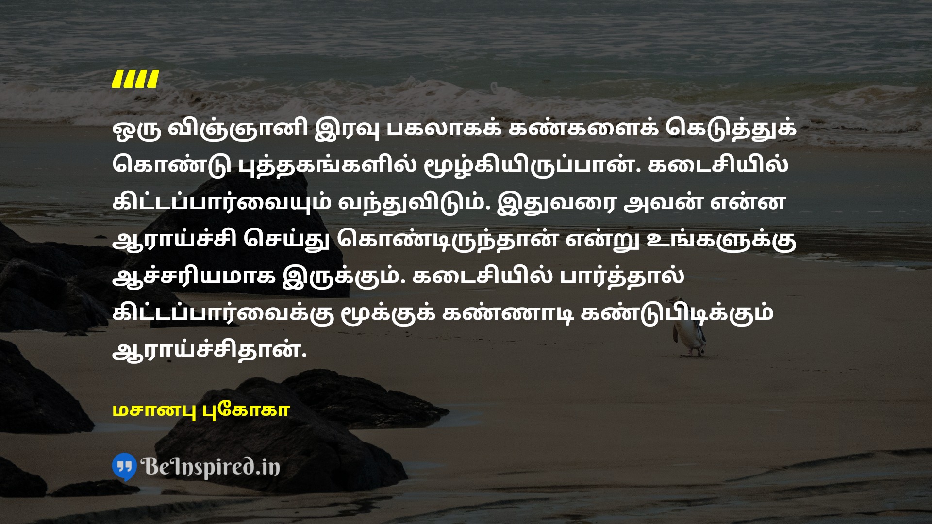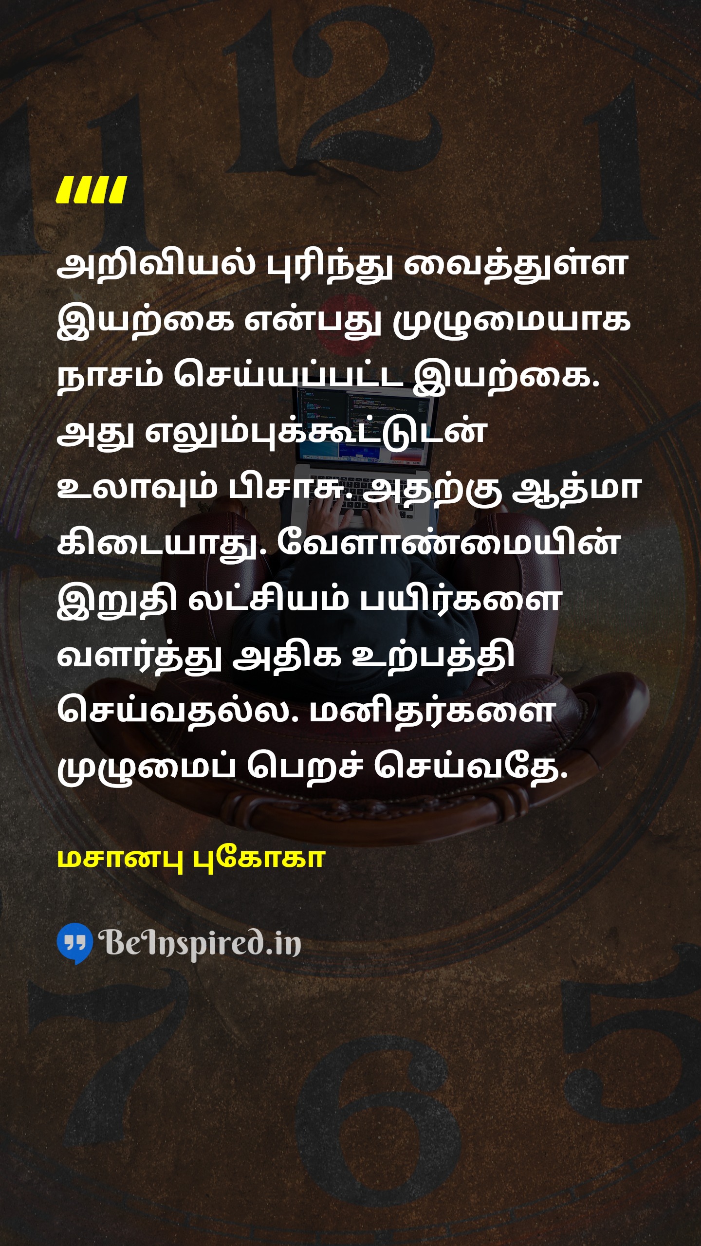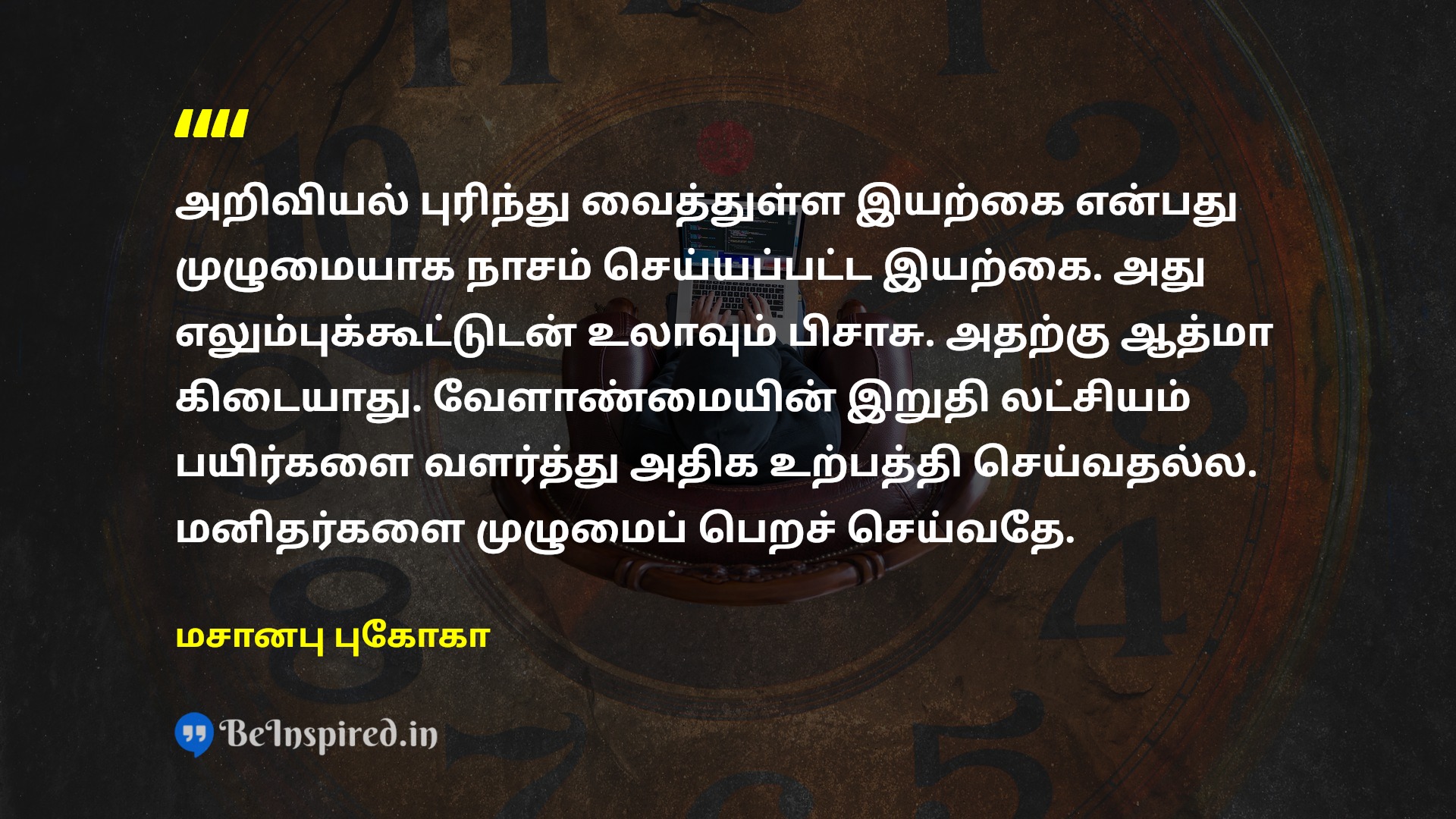 அறிவியல் புரிந்து வைத்துள்ள இயற்கை என்பது முழுமையாக நாசம் செய்யப்பட்ட இயற்கை. அது எலும்புக்கூட்டுடன் உலாவும் பிசாசு. அதற்கு ஆத்மா கிடையாது. வேளாண்மையின் இறுதி லட்சியம் பயிர்களை வளர்த்து அதிக உற்பத்தி செய்வதல்ல. மனிதர்களை முழுமைப் பெறச் செய்வதே.