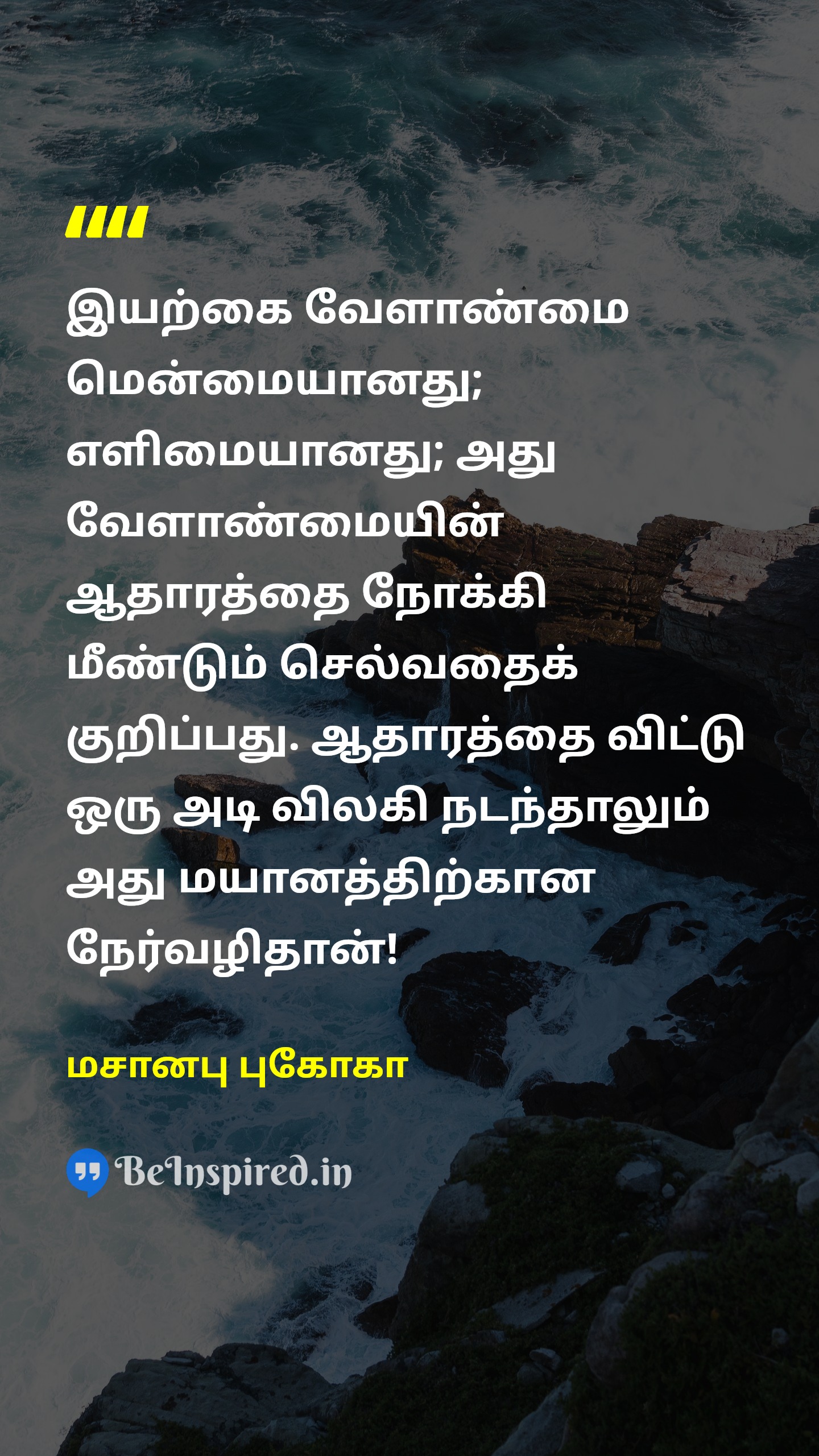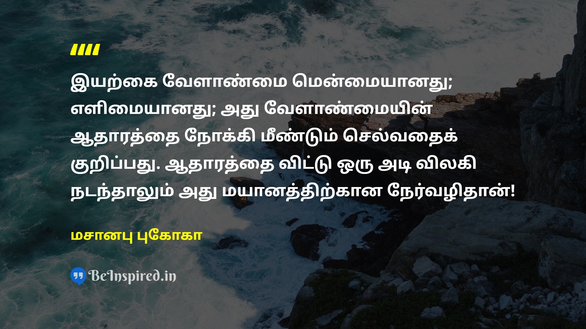 இயற்கை வேளாண்மை மென்மையானது; எளிமையானது; அது வேளாண்மையின் ஆதாரத்தை நோக்கி மீண்டும் செல்வதைக் குறிப்பது. ஆதாரத்தை விட்டு ஒரு அடி விலகி நடந்தாலும் அது மயானத்திற்கான நேர்வழிதான்!