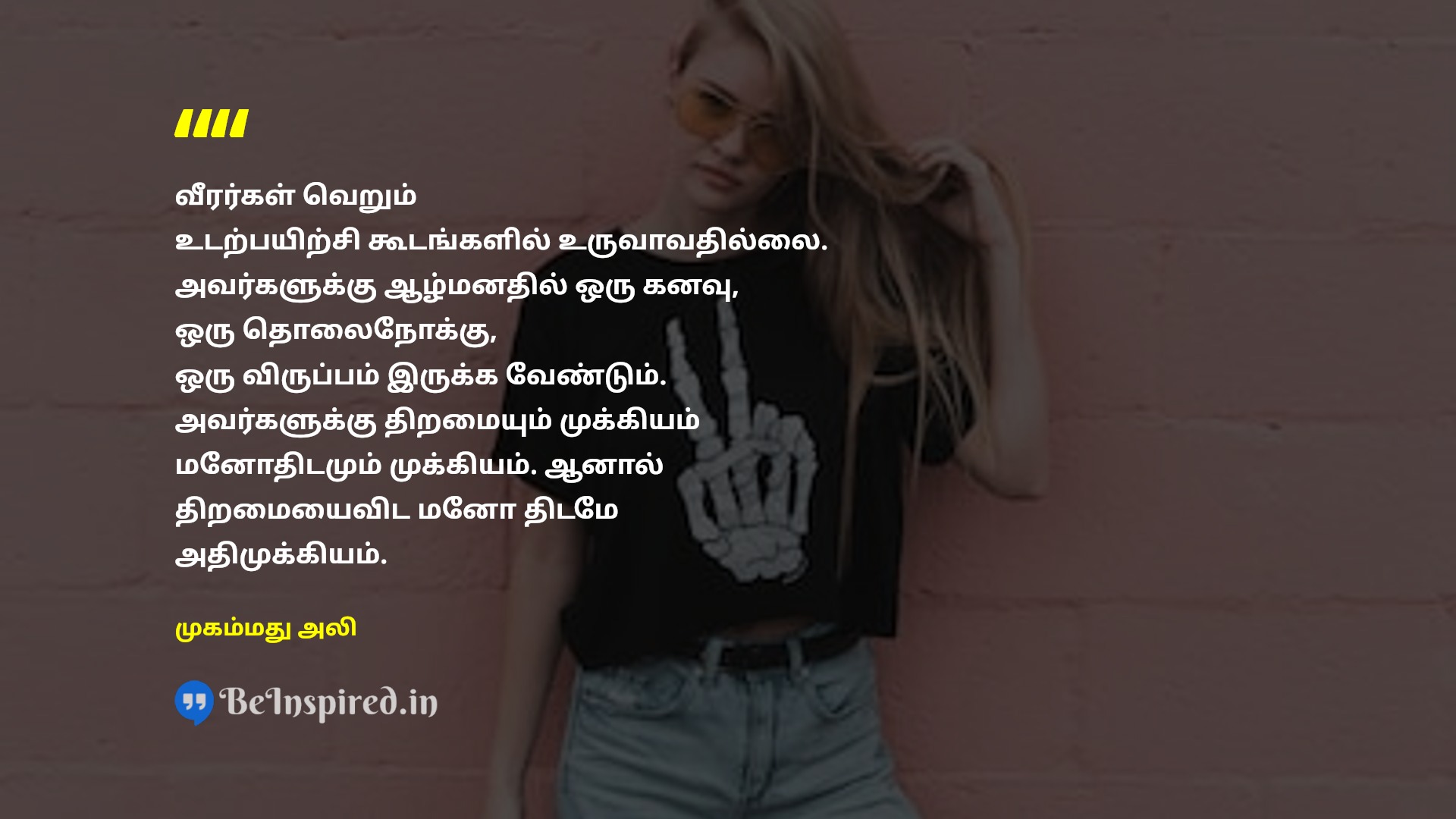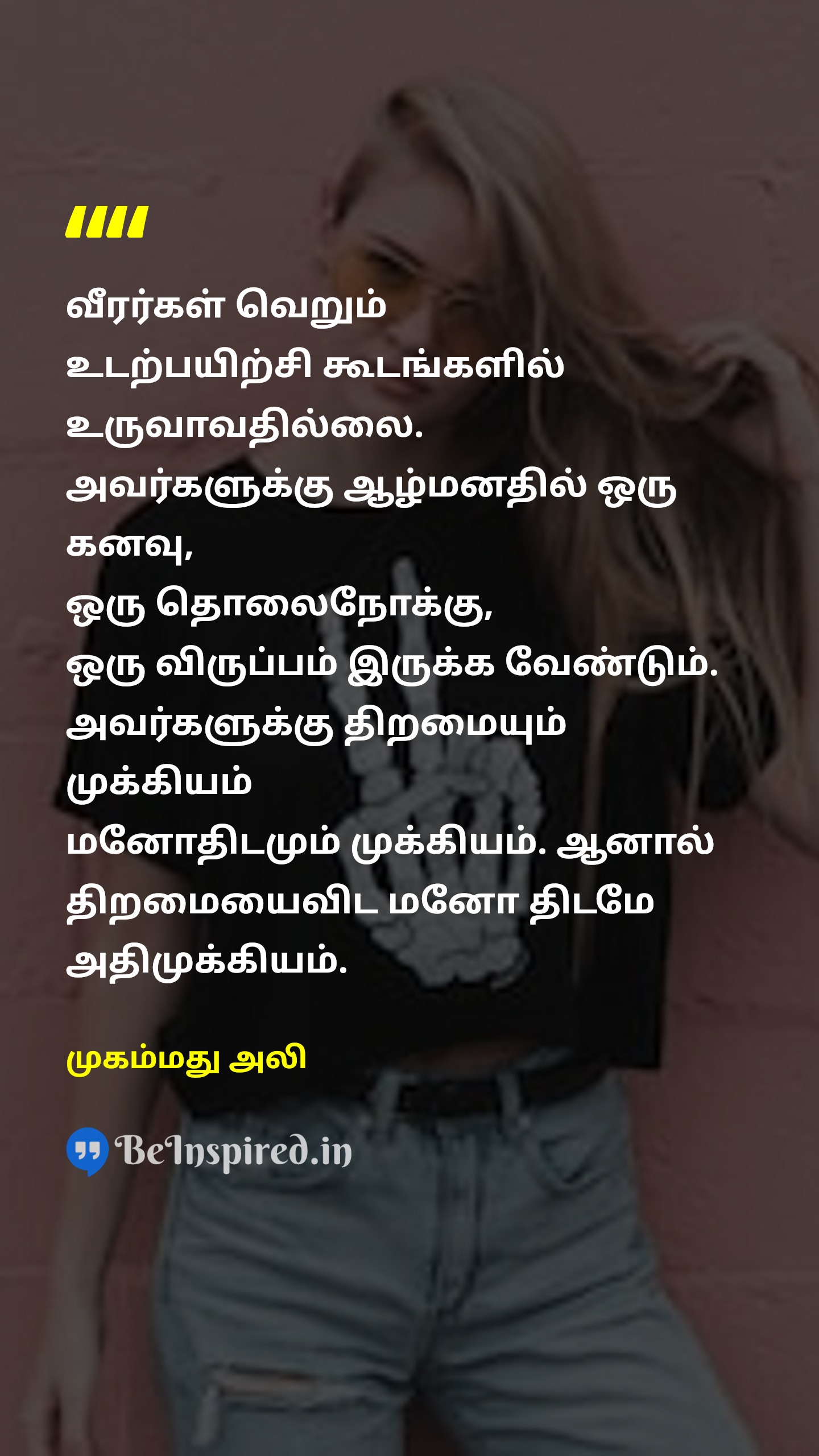 வீரர்கள் வெறும் உடற்பயிற்சி கூடங்களில் உருவாவதில்லை. அவர்களுக்கு ஆழ்மனதில் ஒரு கனவு, ஒரு தொலைநோக்கு, ஒரு விருப்பம் இருக்க வேண்டும். அவர்களுக்கு திறமையும் முக்கியம் மனோதிடமும் முக்கியம். ஆனால் திறமையைவிட மனோ திடமே அதிமுக்கியம்.