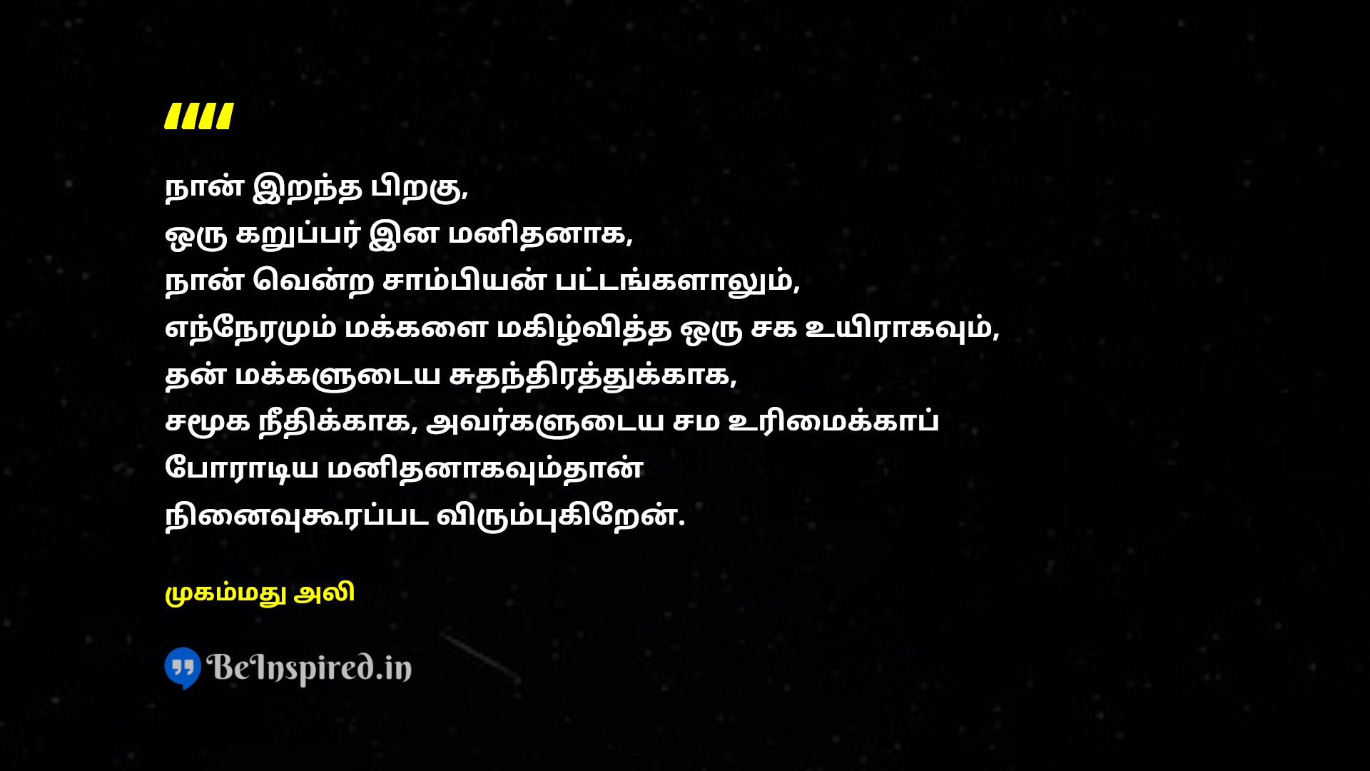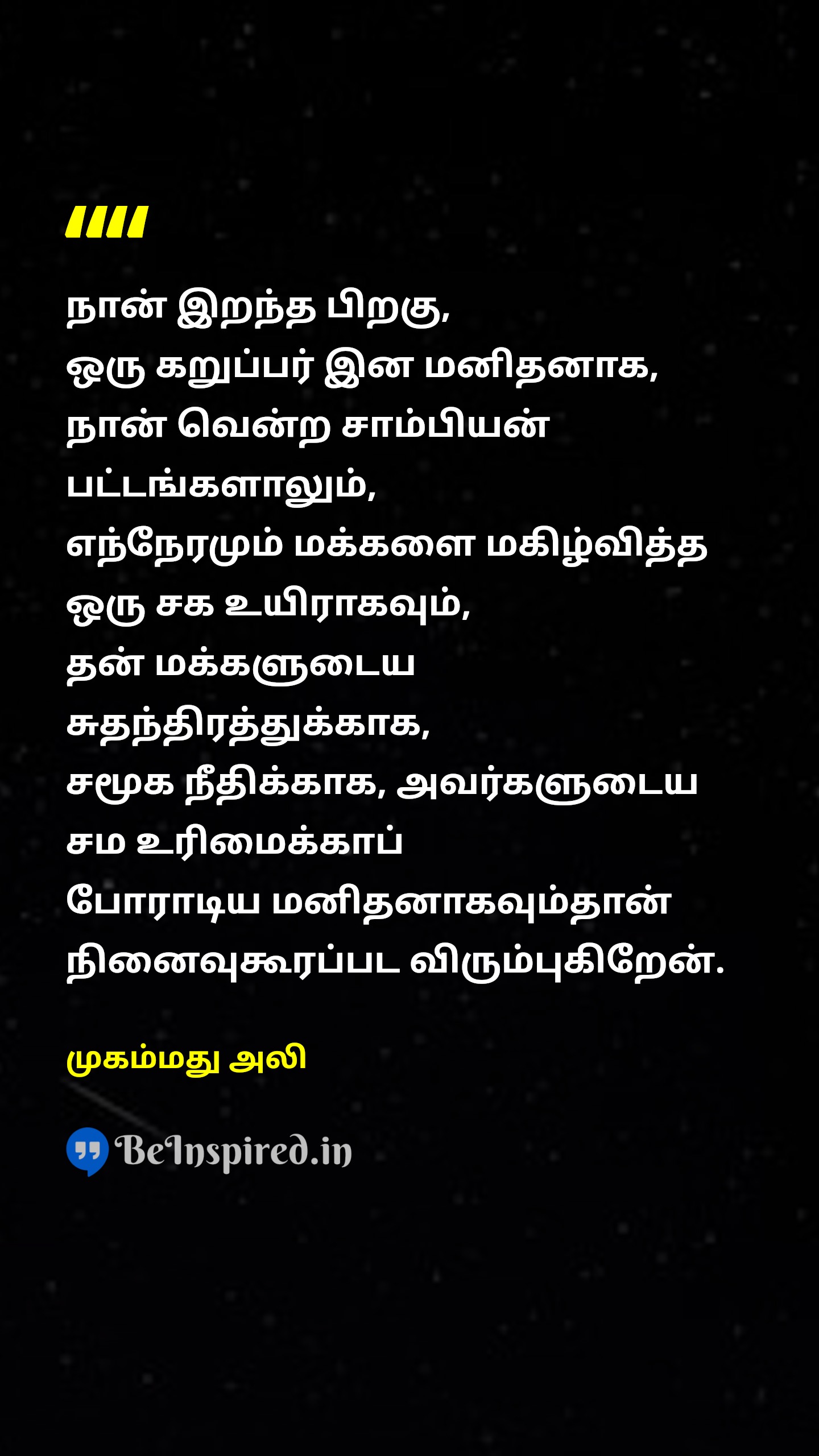 நான் இறந்த பிறகு, ஒரு கறுப்பர் இன மனிதனாக, நான் வென்ற சாம்பியன் பட்டங்களாலும், எந்நேரமும் மக்களை மகிழ்வித்த ஒரு சக உயிராகவும், தன் மக்களுடைய சுதந்திரத்துக்காக, சமூக நீதிக்காக, அவர்களுடைய சம உரிமைக்காப் போராடிய மனிதனாகவும்தான் நினைவுகூரப்பட விரும்புகிறேன்.