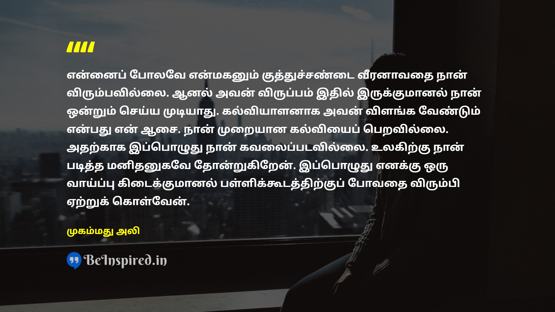 என்னைப் போலவே என்மகனும் குத்துச்சண்டை வீரனாவதை நான் விரும்பவில்லை. ஆனல் அவன் விருப்பம் இதில் இருக்குமானல் நான் ஒன்றும் செய்ய முடியாது. கல்வியாளனாக அவன் விளங்க வேண்டும் என்பது என் ஆசை. நான் முறையான கல்வியைப் பெறவில்லை. அதற்காக இப்பொழுது நான் கவலைப்படவில்லை. உலகிற்கு நான் படித்த மனிதனுகவே தோன்றுகிறேன். இப்பொழுது எனக்கு ஒரு வாய்ப்பு கிடைக்குமானல் பள்ளிக்கூடத்திற்குப் போவதை விரும்பி ஏற்றுக் கொள்வேன்.