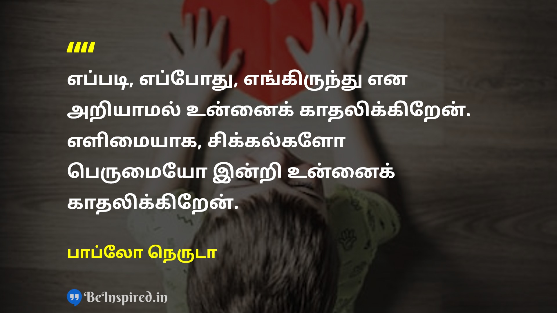 எப்படி, எப்போது, எங்கிருந்து என அறியாமல் உன்னைக் காதலிக்கிறேன். எளிமையாக, சிக்கல்களோ பெருமையோ இன்றி உன்னைக் காதலிக்கிறேன்.