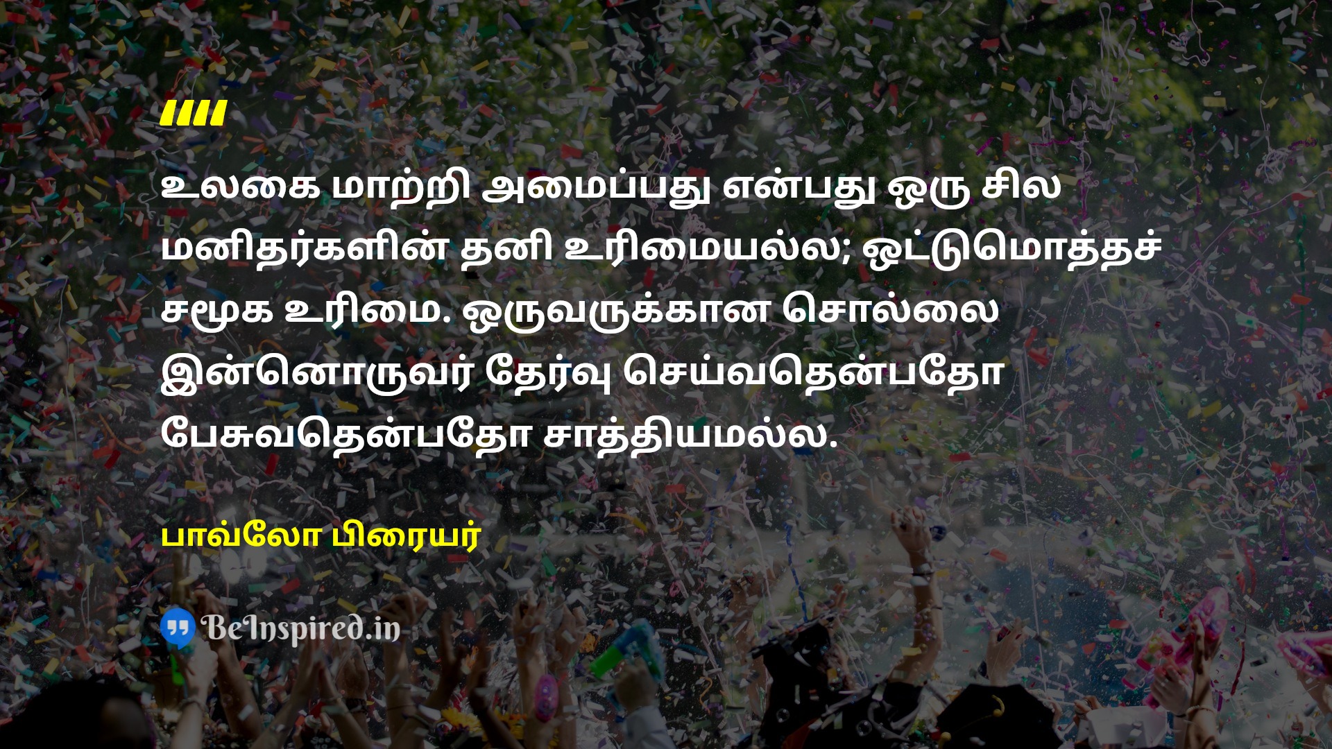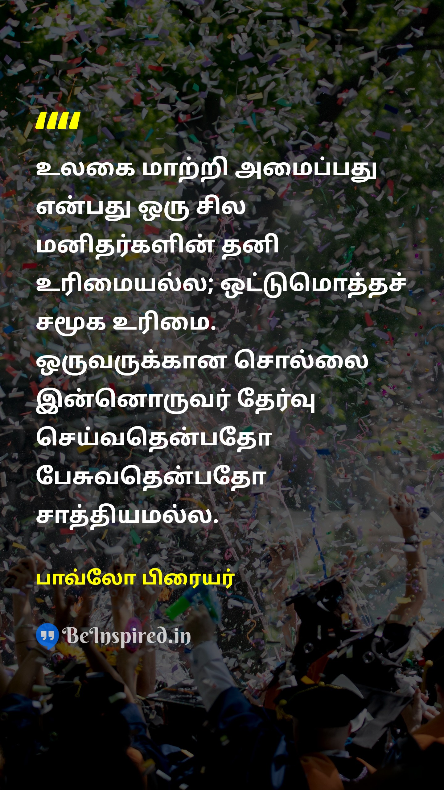 உலகை மாற்றி அமைப்பது என்பது ஒரு சில மனிதர்களின் தனி உரிமையல்ல; ஒட்டுமொத்தச் சமூக உரிமை. ஒருவருக்கான சொல்லை இன்னொருவர் தேர்வு செய்வதென்பதோ பேசுவதென்பதோ சாத்தியமல்ல.
