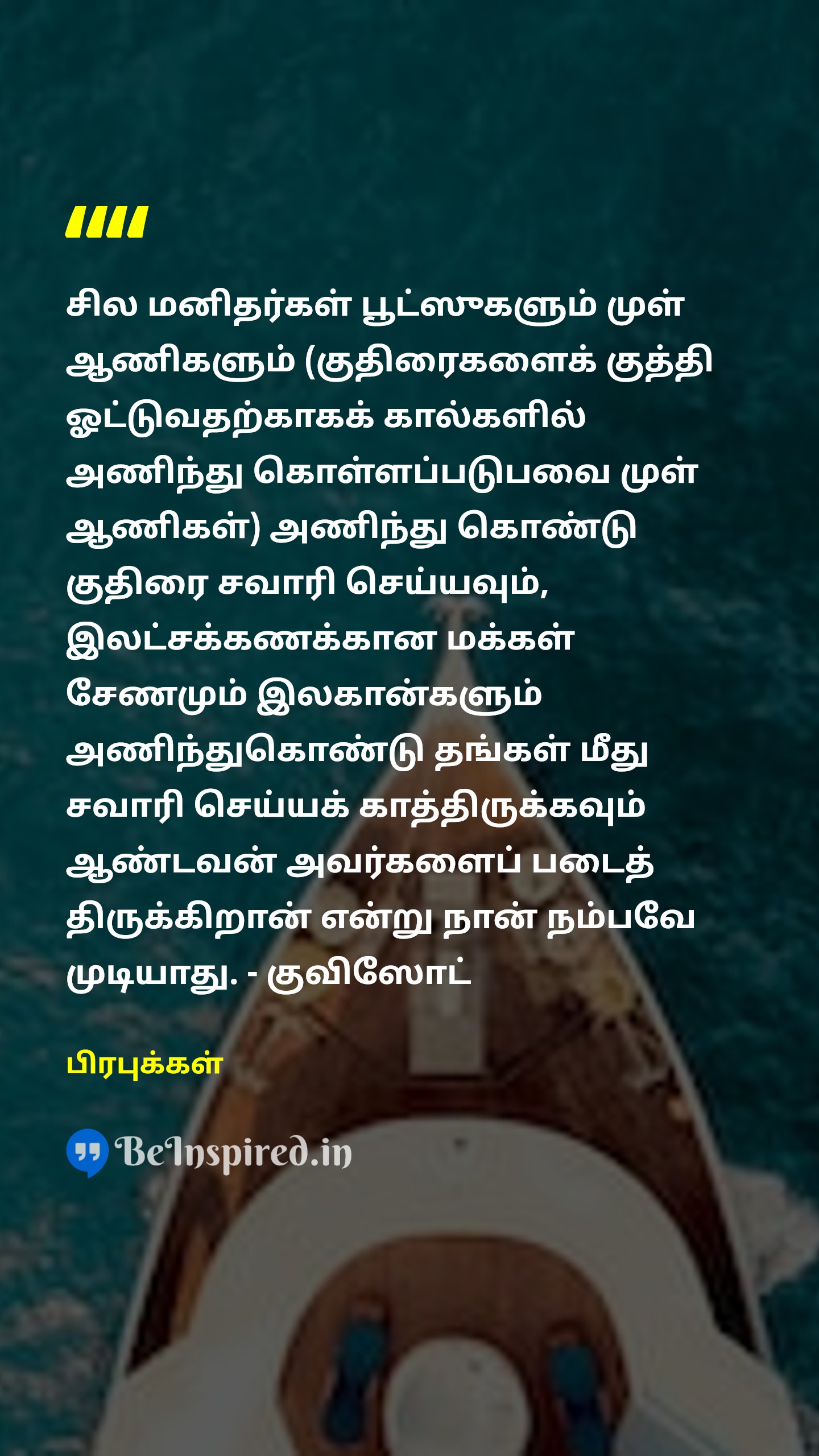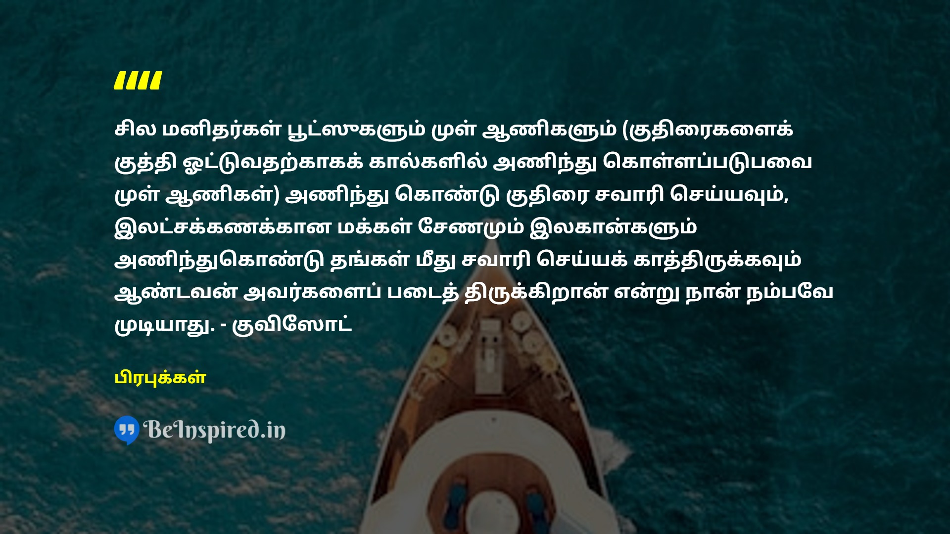 சில மனிதர்கள் பூட்ஸுகளும் முள் ஆணிகளும் (குதிரைகளைக் குத்தி ஓட்டுவதற்காகக் கால்களில் அணிந்து கொள்ளப்படுபவை முள் ஆணிகள்) அணிந்து கொண்டு குதிரை சவாரி செய்யவும், இலட்சக்கணக்கான மக்கள் சேணமும் இலகான்களும் அணிந்துகொண்டு தங்கள் மீது சவாரி செய்யக் காத்திருக்கவும் ஆண்டவன் அவர்களைப் படைத் திருக்கிறான் என்று நான் நம்பவே முடியாது. - குவிஸோட்