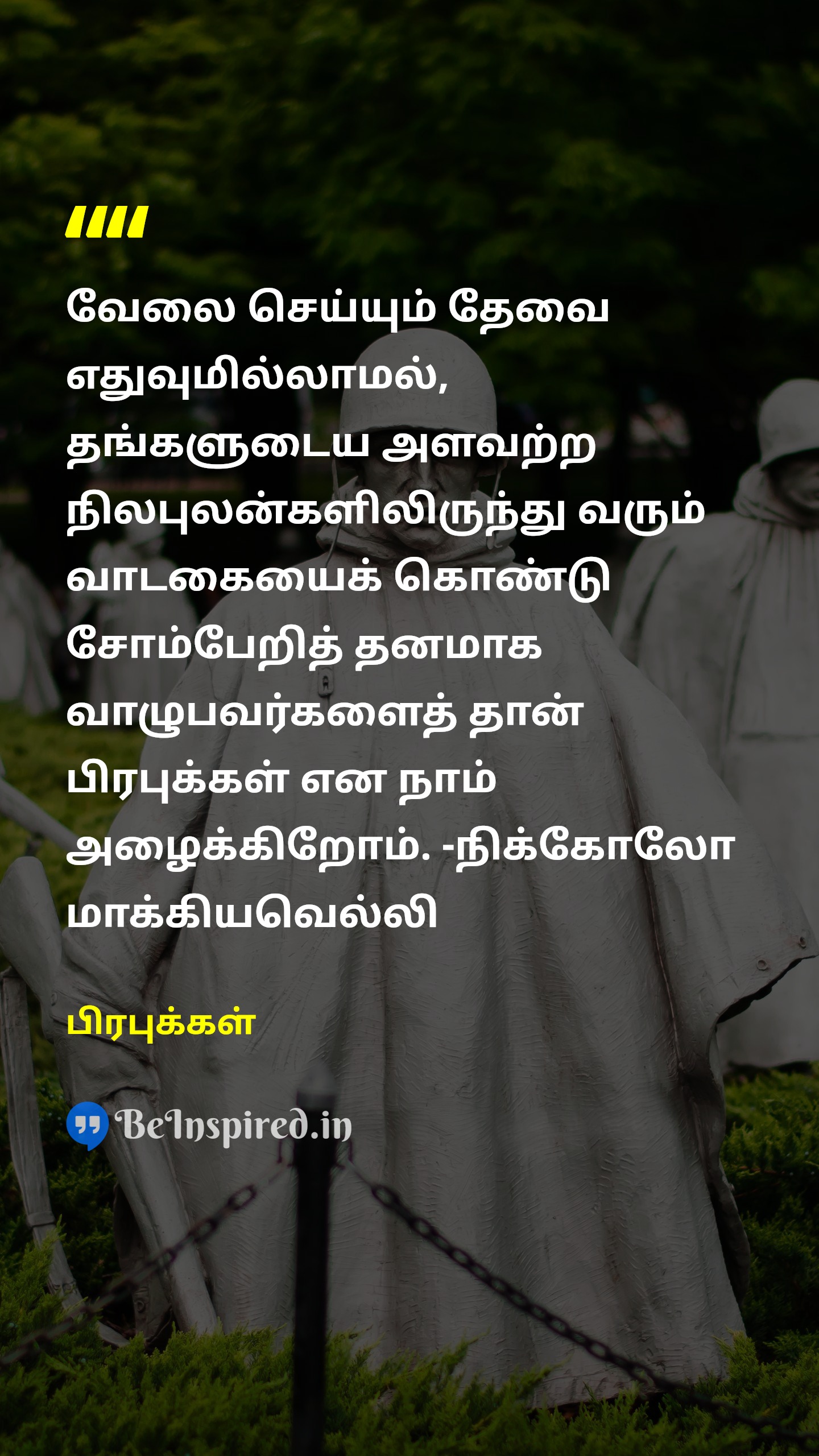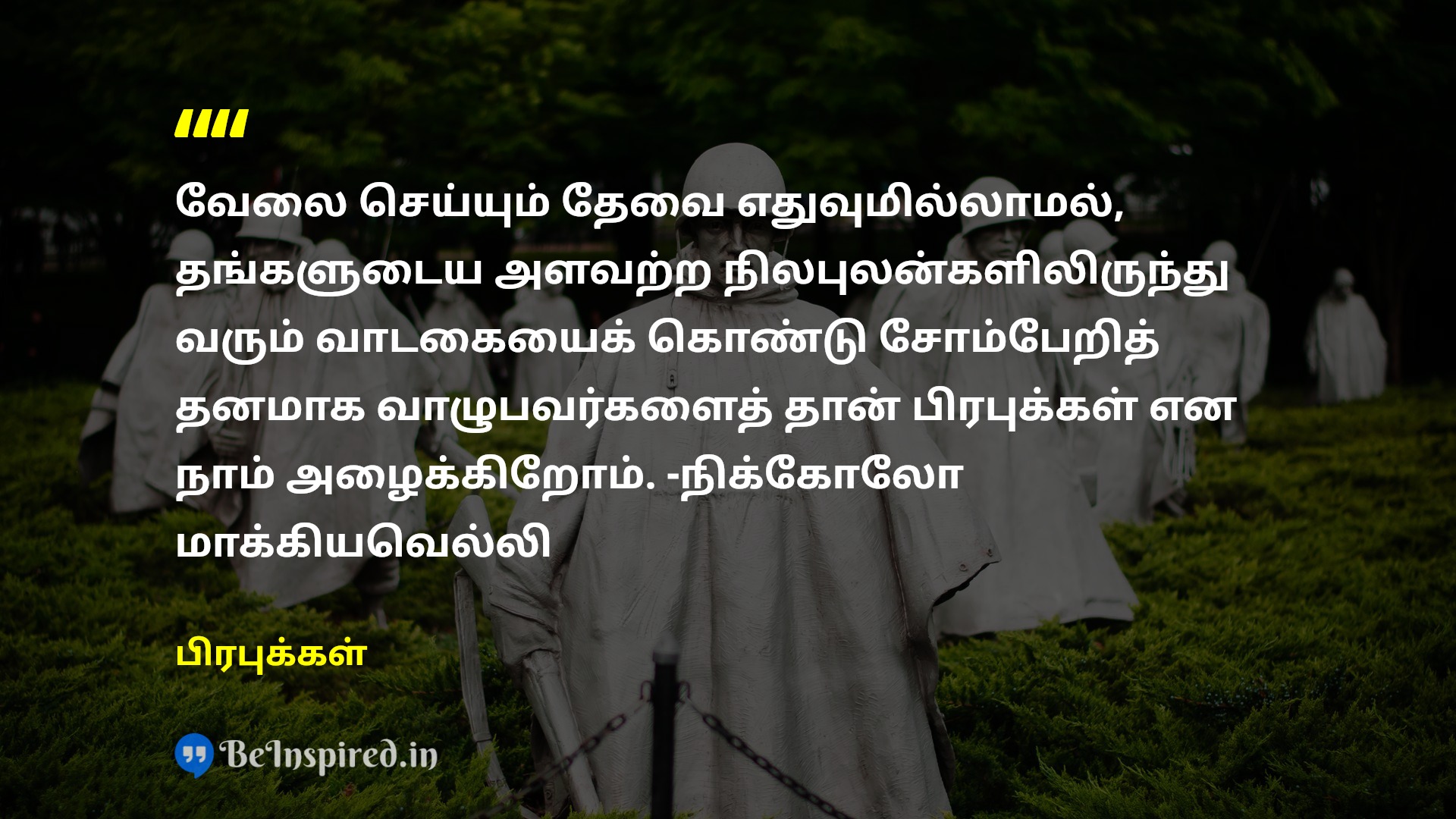 வேலை செய்யும் தேவை எதுவுமில்லாமல், தங்களுடைய அளவற்ற நிலபுலன்களிலிருந்து வரும் வாடகையைக் கொண்டு சோம்பேறித் தனமாக வாழுபவர்களைத் தான் பிரபுக்கள் என நாம் அழைக்கிறோம். -நிக்கோலோ மாக்கியவெல்லி