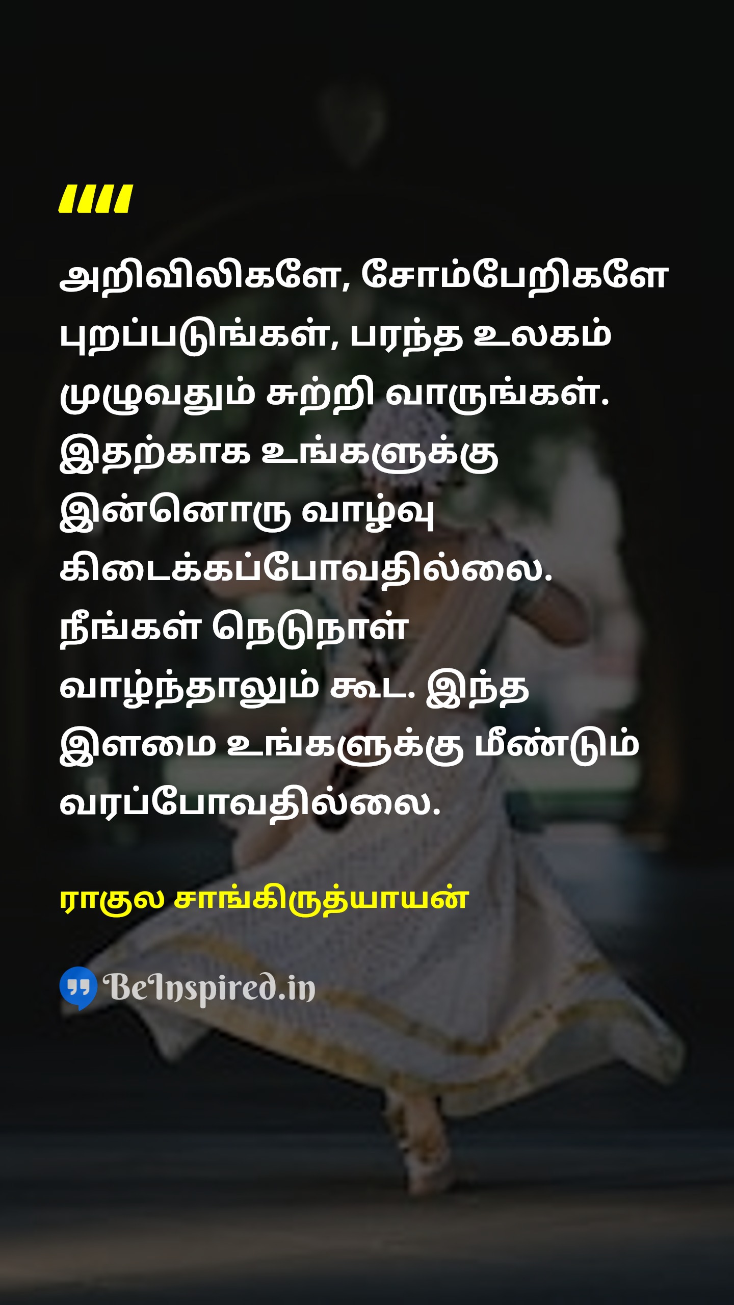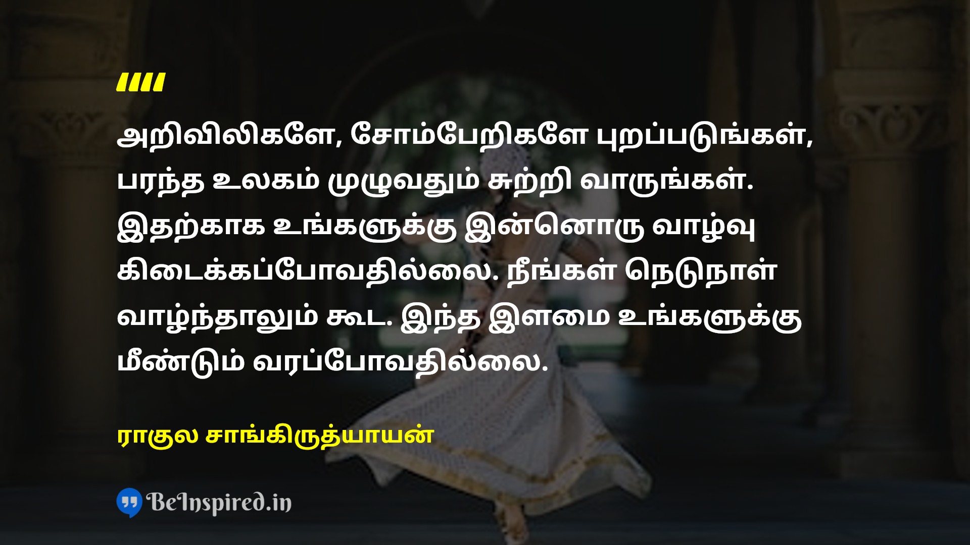 அறிவிலிகளே, சோம்பேறிகளே புறப்படுங்கள், பரந்த உலகம் முழுவதும் சுற்றி வாருங்கள். இதற்காக உங்களுக்கு இன்னொரு வாழ்வு கிடைக்கப்போவதில்லை. நீங்கள் நெடுநாள் வாழ்ந்தாலும் கூட. இந்த இளமை உங்களுக்கு மீண்டும் வரப்போவதில்லை.