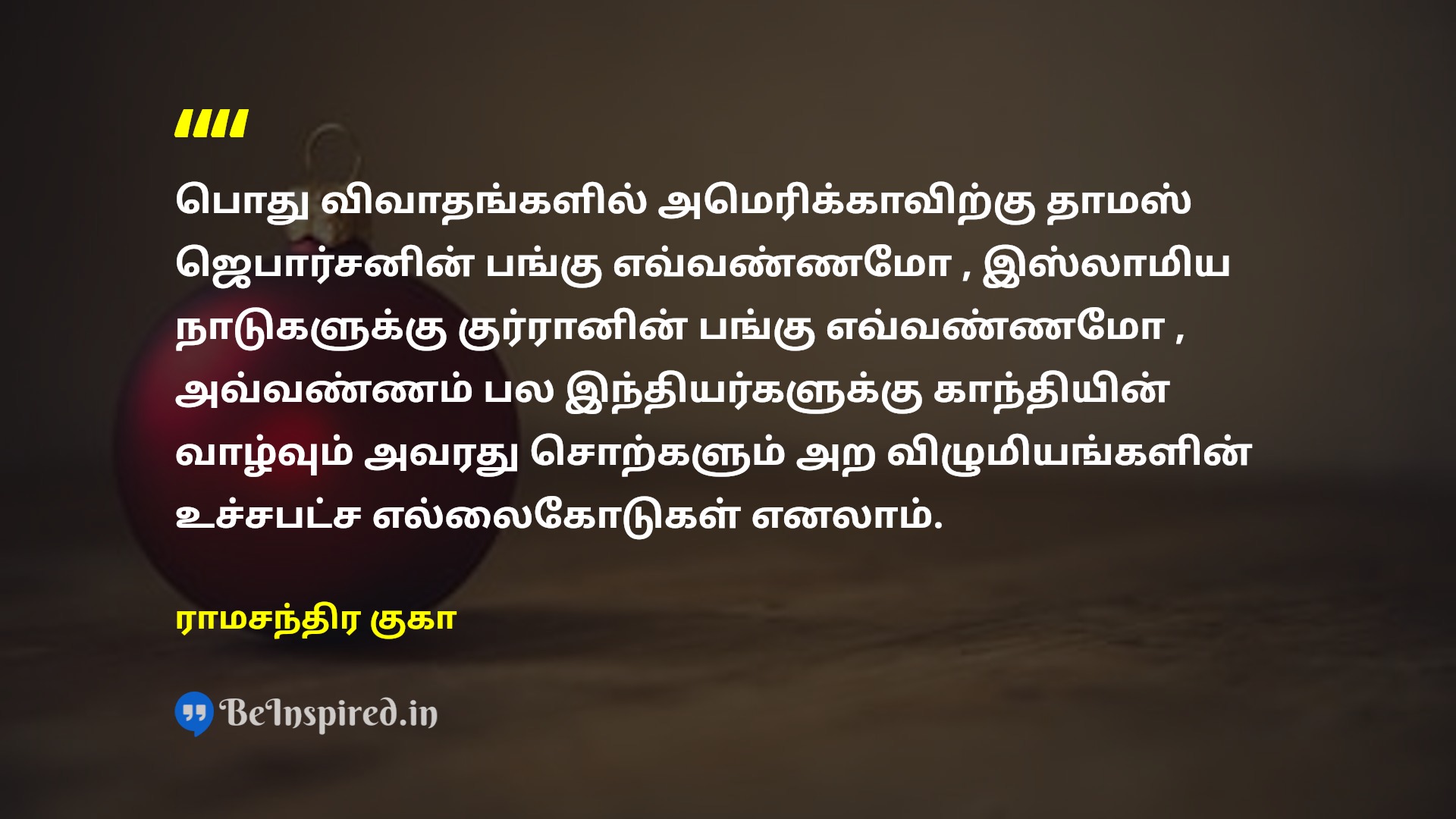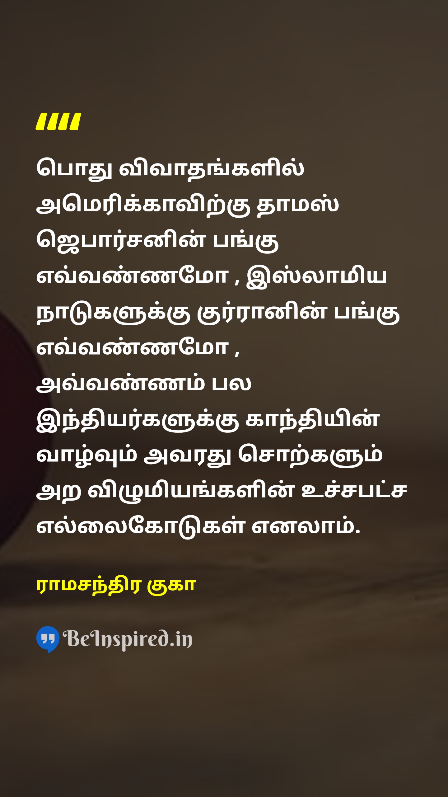 பொது விவாதங்களில் அமெரிக்காவிற்கு தாமஸ் ஜெபார்சனின் பங்கு எவ்வண்ணமோ , இஸ்லாமிய நாடுகளுக்கு குர்ரானின் பங்கு எவ்வண்ணமோ , அவ்வண்ணம் பல இந்தியர்களுக்கு காந்தியின் வாழ்வும் அவரது சொற்களும் அற விழுமியங்களின் உச்சபட்ச எல்லைகோடுகள் எனலாம்.