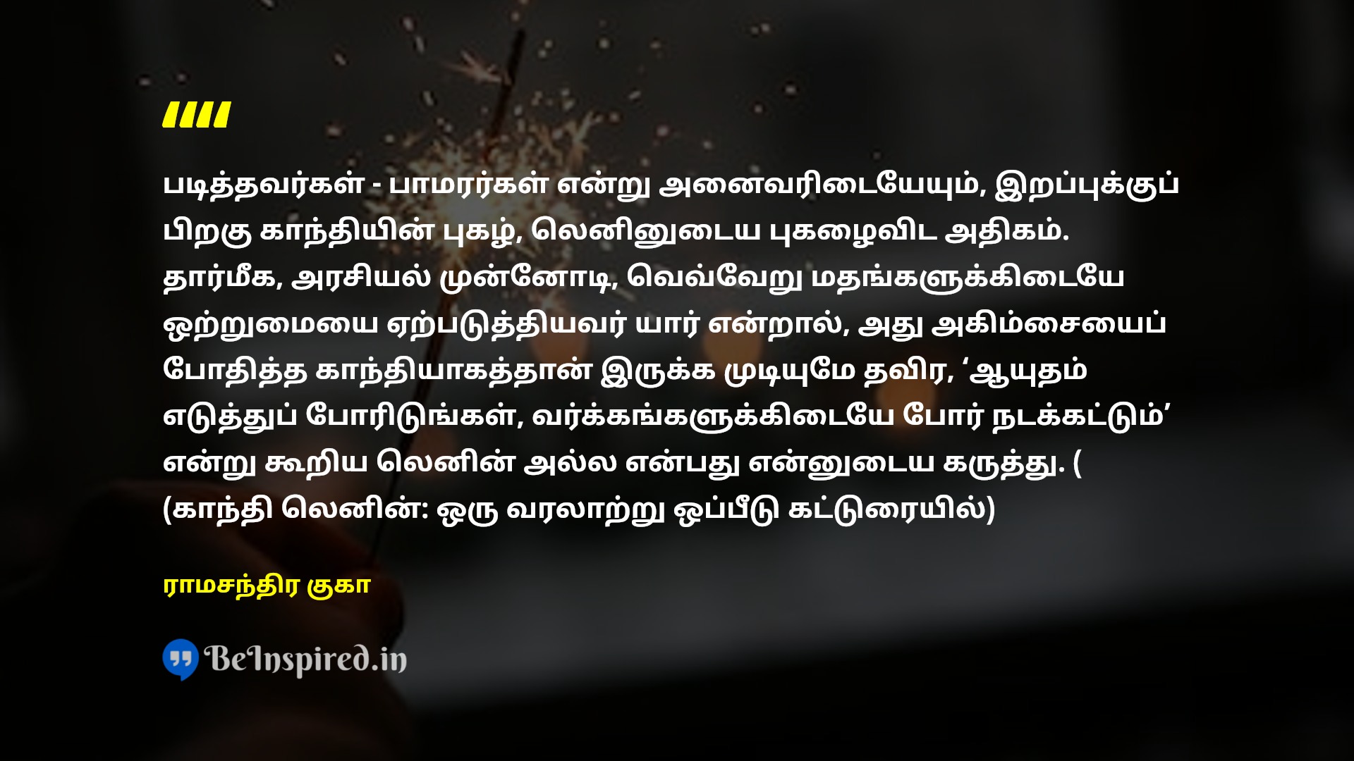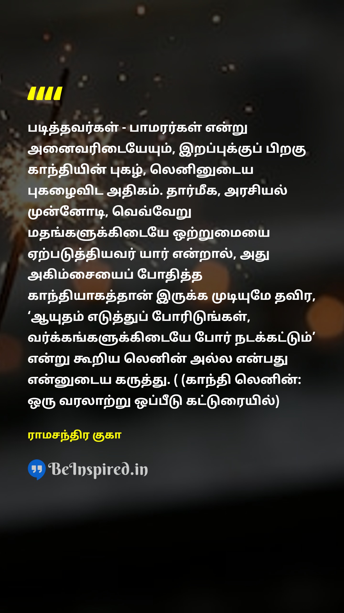 படித்தவர்கள் - பாமரர்கள் என்று அனைவரிடையேயும், இறப்புக்குப் பிறகு காந்தியின் புகழ், லெனினுடைய புகழைவிட அதிகம். தார்மீக, அரசியல் முன்னோடி, வெவ்வேறு மதங்களுக்கிடையே ஒற்றுமையை ஏற்படுத்தியவர் யார் என்றால், அது அகிம்சையைப் போதித்த காந்தியாகத்தான் இருக்க முடியுமே தவிர, ‘ஆயுதம் எடுத்துப் போரிடுங்கள், வர்க்கங்களுக்கிடையே போர் நடக்கட்டும்’ என்று கூறிய லெனின் அல்ல என்பது என்னுடைய கருத்து. ( (காந்தி லெனின்: ஒரு வரலாற்று ஒப்பீடு கட்டுரையில்)