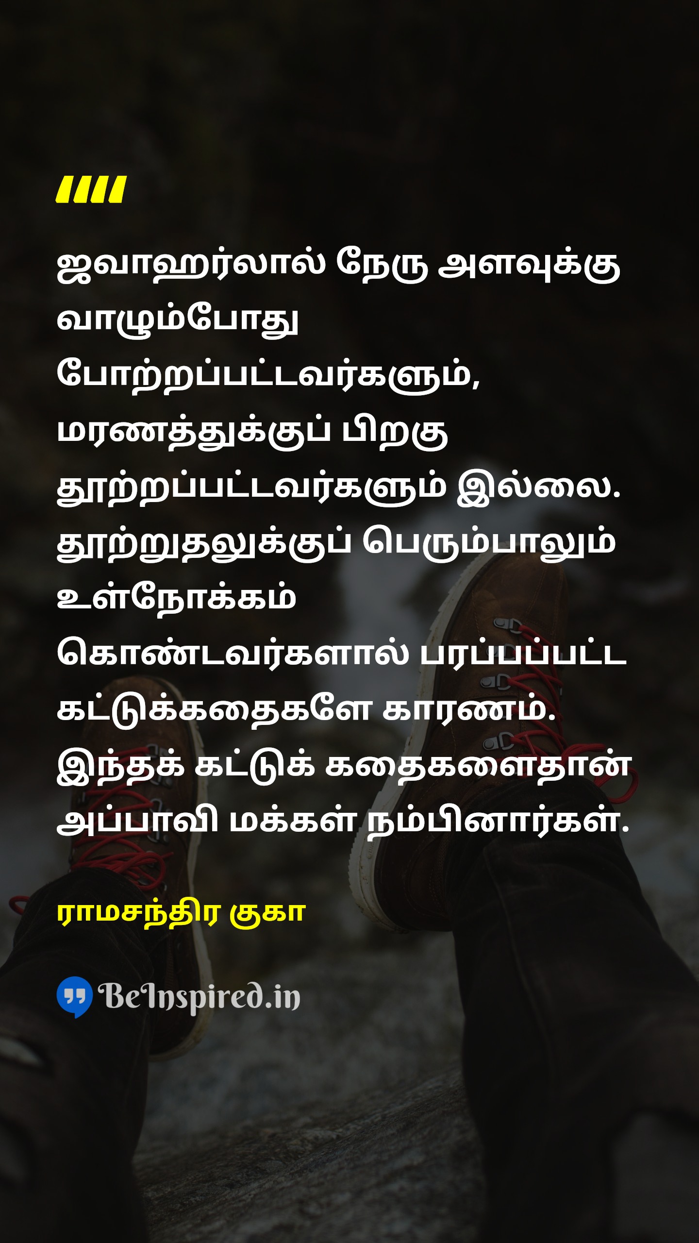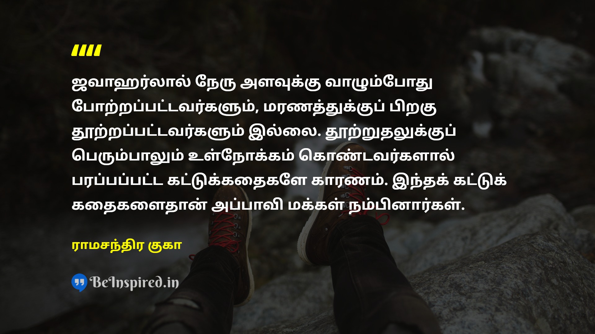 ஜவாஹர்லால் நேரு அளவுக்கு வாழும்போது போற்றப்பட்டவர்களும், மரணத்துக்குப் பிறகு தூற்றப்பட்டவர்களும் இல்லை. தூற்றுதலுக்குப் பெரும்பாலும் உள்நோக்கம் கொண்டவர்களால் பரப்பப்பட்ட கட்டுக்கதைகளே காரணம். இந்தக் கட்டுக் கதைகளைதான் அப்பாவி மக்கள் நம்பினார்கள்.