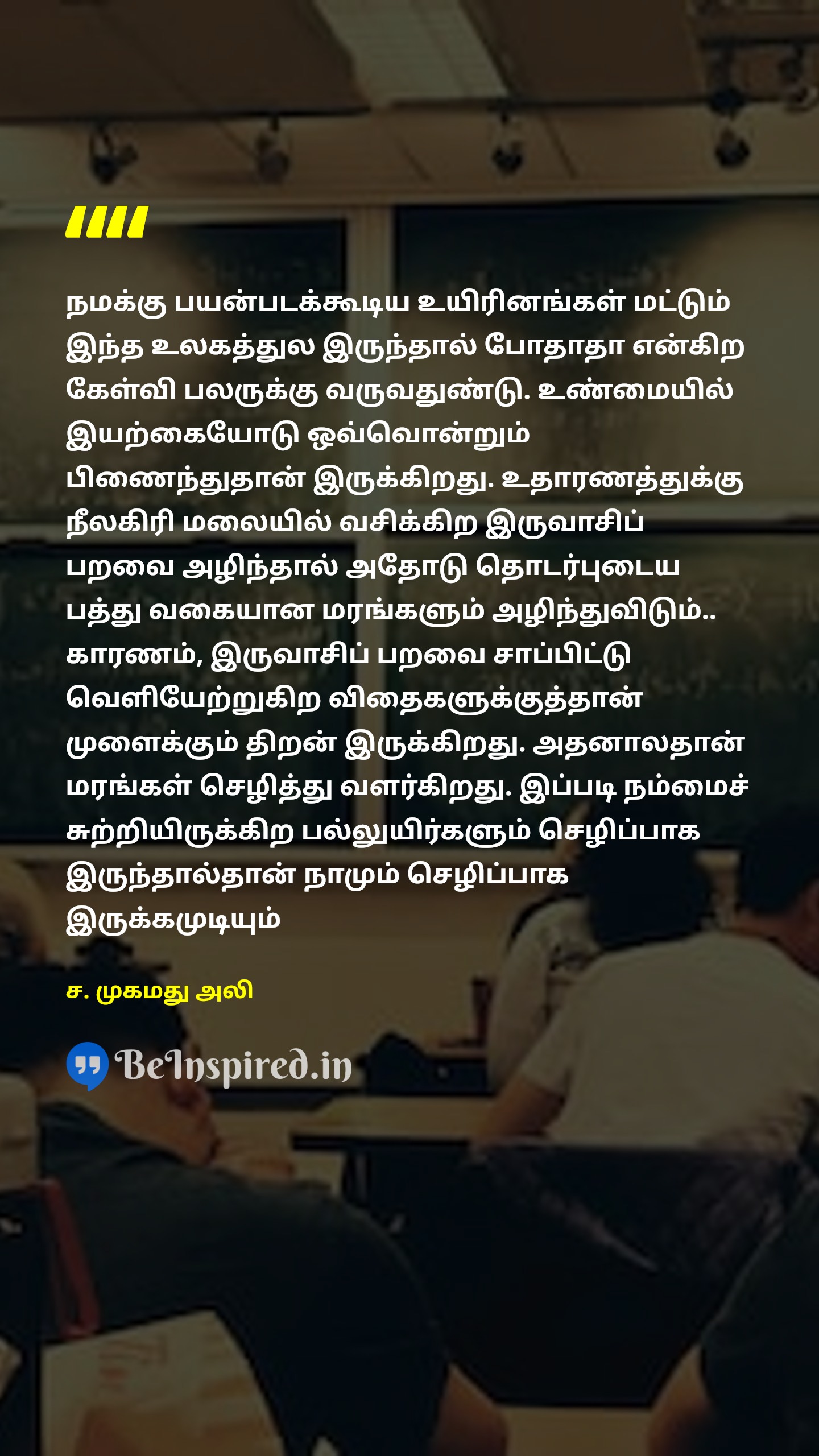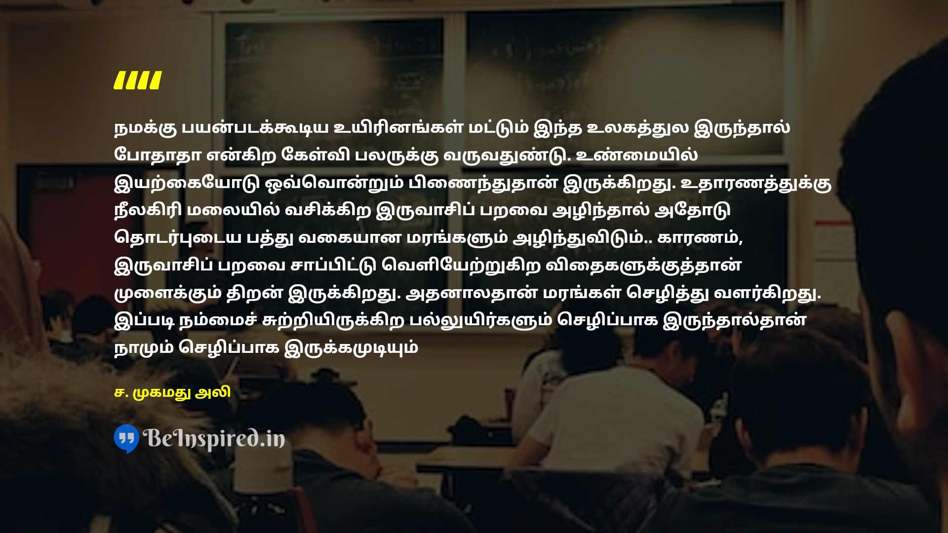 நமக்கு பயன்படக்கூடிய உயிரினங்கள் மட்டும் இந்த உலகத்துல இருந்தால் போதாதா என்கிற கேள்வி பலருக்கு வருவதுண்டு. உண்மையில் இயற்கையோடு ஒவ்வொன்றும் பிணைந்துதான் இருக்கிறது. உதாரணத்துக்கு நீலகிரி மலையில் வசிக்கிற இருவாசிப் பறவை அழிந்தால் அதோடு தொடர்புடைய பத்து வகையான மரங்களும் அழிந்துவிடும்.. காரணம், இருவாசிப் பறவை சாப்பிட்டு வெளியேற்றுகிற விதைகளுக்குத்தான் முளைக்கும் திறன் இருக்கிறது. அதனாலதான் மரங்கள் செழித்து வளர்கிறது. இப்படி நம்மைச் சுற்றியிருக்கிற பல்லுயிர்களும் செழிப்பாக இருந்தால்தான் நாமும் செழிப்பாக இருக்கமுடியும்
