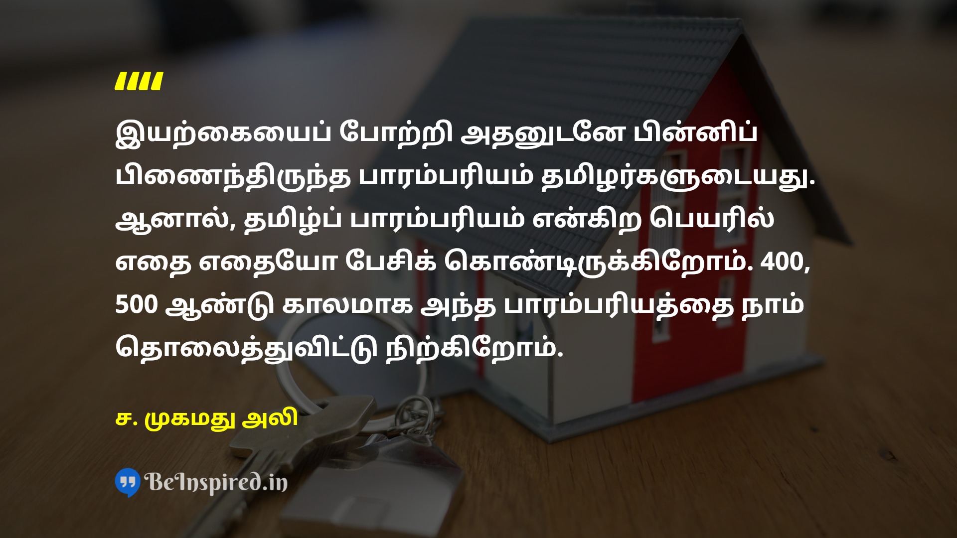 இயற்கையைப் போற்றி அதனுடனே பின்னிப் பிணைந்திருந்த பாரம்பரியம் தமிழர்களுடையது. ஆனால், தமிழ்ப் பாரம்பரியம் என்கிற பெயரில் எதை எதையோ பேசிக் கொண்டிருக்கிறோம். 400, 500 ஆண்டு காலமாக அந்த பாரம்பரியத்தை நாம் தொலைத்துவிட்டு நிற்கிறோம்.