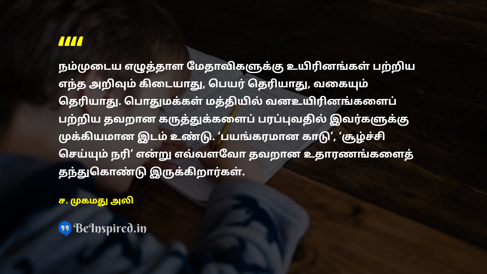 நம்முடைய எழுத்தாள மேதாவிகளுக்கு உயிரினங்கள் பற்றிய எந்த அறிவும் கிடையாது, பெயர் தெரியாது, வகையும் தெரியாது. பொதுமக்கள் மத்தியில் வனஉயிரினங்களைப் பற்றிய தவறான கருத்துக்களைப் பரப்புவதில் இவர்களுக்கு முக்கியமான இடம் உண்டு. ‘பயங்கரமான காடு’, ‘சூழ்ச்சி செய்யும் நரி’ என்று எவ்வளவோ தவறான உதாரணங்களைத் தந்துகொண்டு இருக்கிறார்கள்.