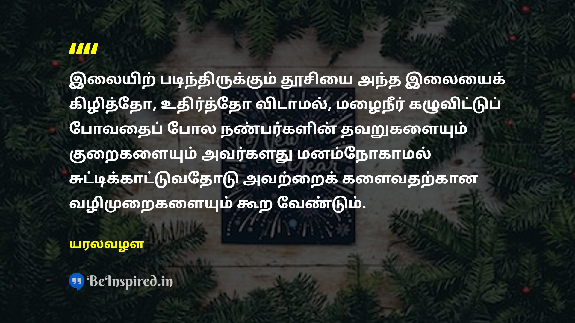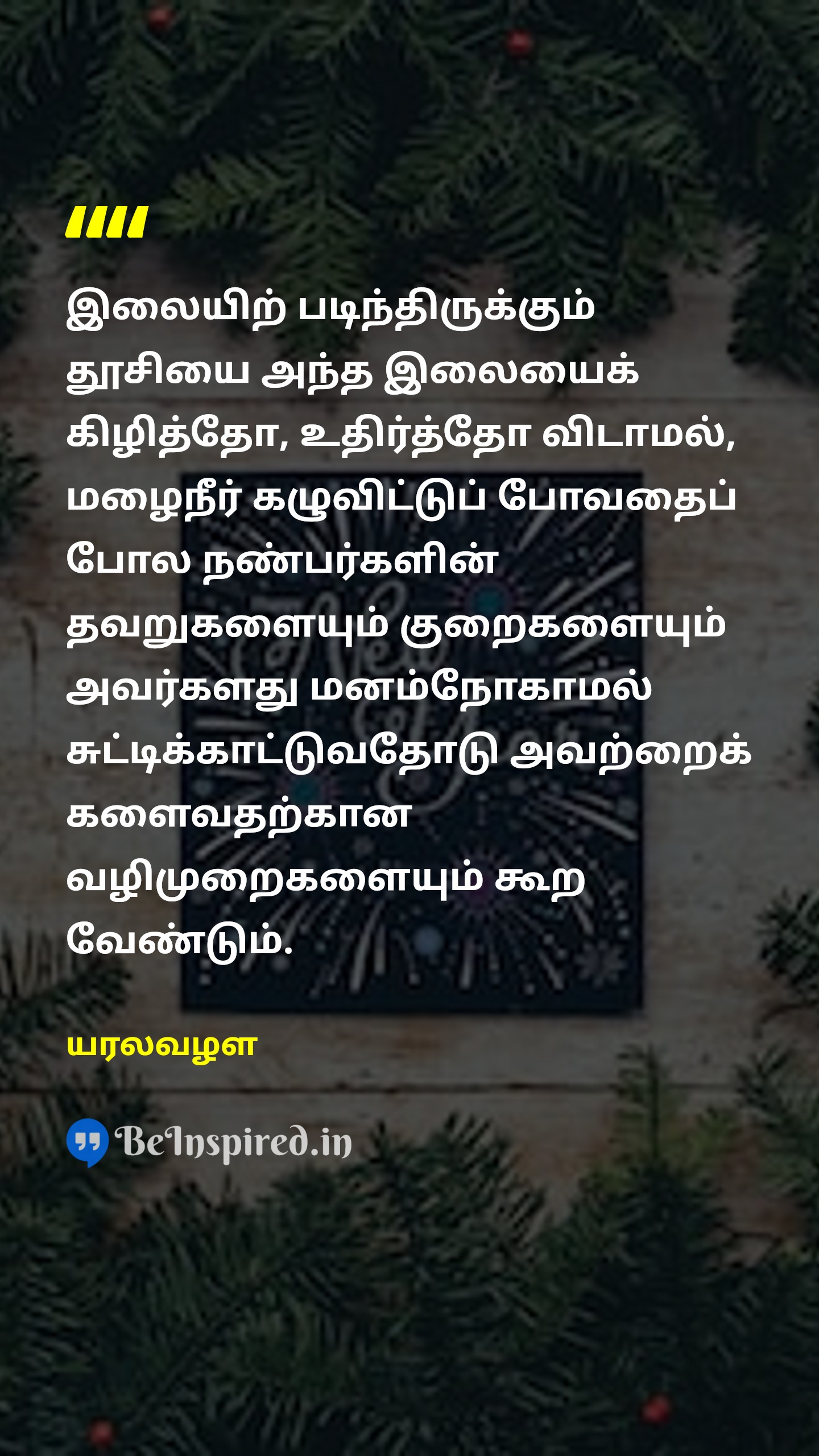 இலையிற் படிந்திருக்கும் தூசியை அந்த இலையைக் கிழித்தோ, உதிர்த்தோ விடாமல், மழைநீர் கழுவிட்டுப் போவதைப் போல நண்பர்களின் தவறுகளையும் குறைகளையும் அவர்களது மனம்நோகாமல் சுட்டிக்காட்டுவதோடு அவற்றைக் களைவதற்கான வழிமுறைகளையும் கூற வேண்டும்.