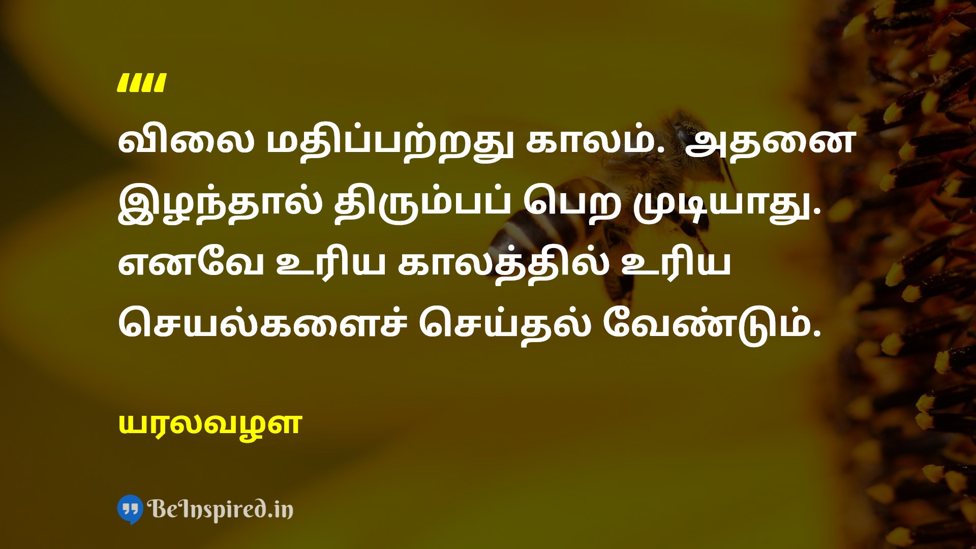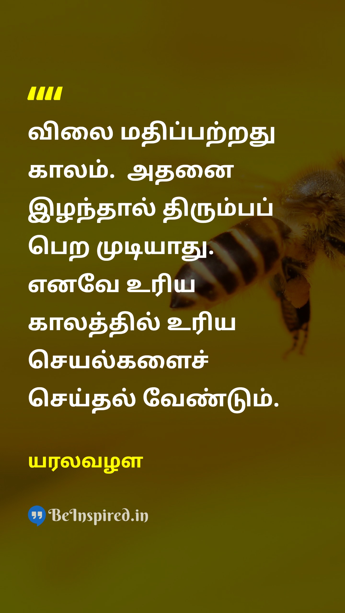 விலை மதிப்பற்றது காலம். அதனை இழந்தால் திரும்பப் பெற முடியாது. எனவே உரிய காலத்தில் உரிய செயல்களைச் செய்தல் வேண்டும்.