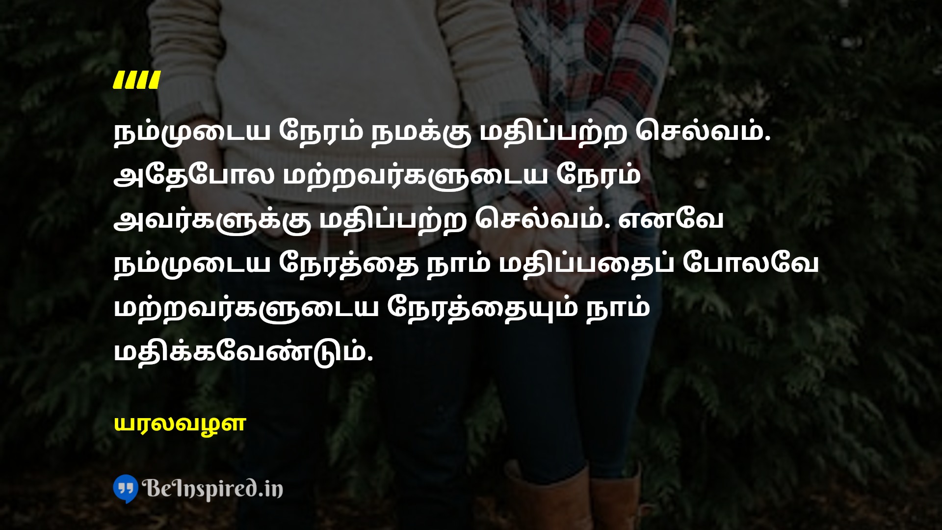 நம்முடைய நேரம் நமக்கு மதிப்பற்ற செல்வம். அதேபோல மற்றவர்களுடைய நேரம் அவர்களுக்கு மதிப்பற்ற செல்வம். எனவே நம்முடைய நேரத்தை நாம் மதிப்பதைப் போலவே மற்றவர்களுடைய நேரத்தையும் நாம் மதிக்கவேண்டும்.