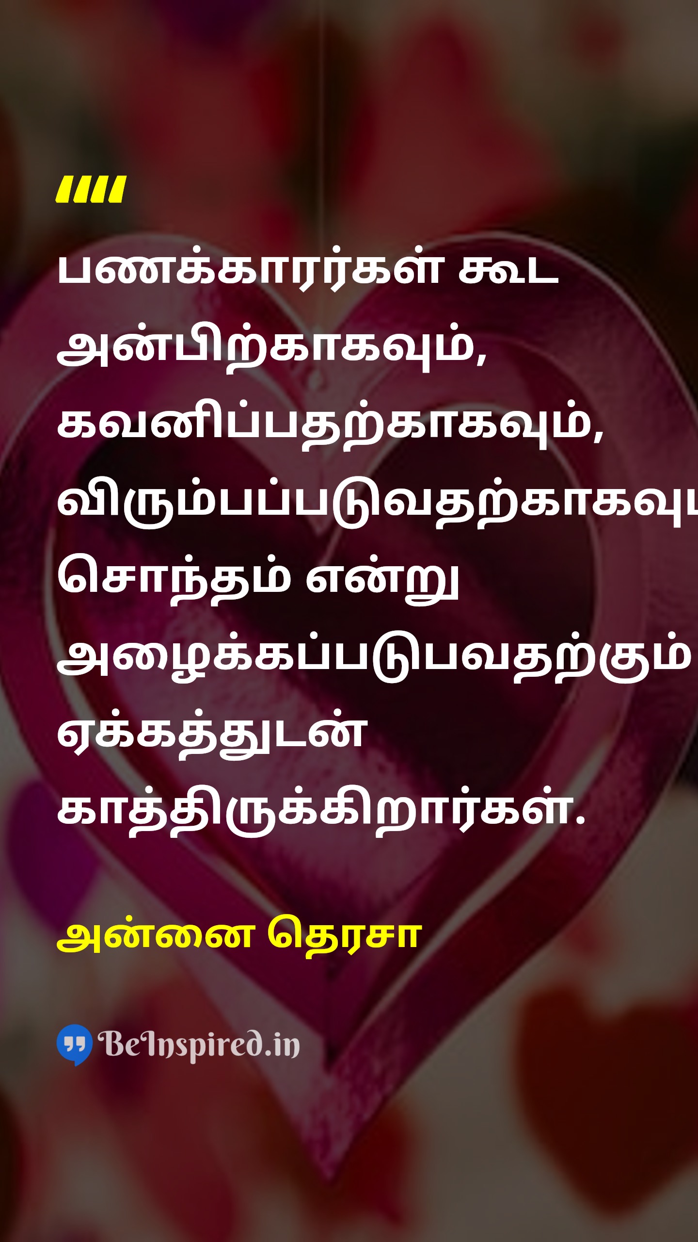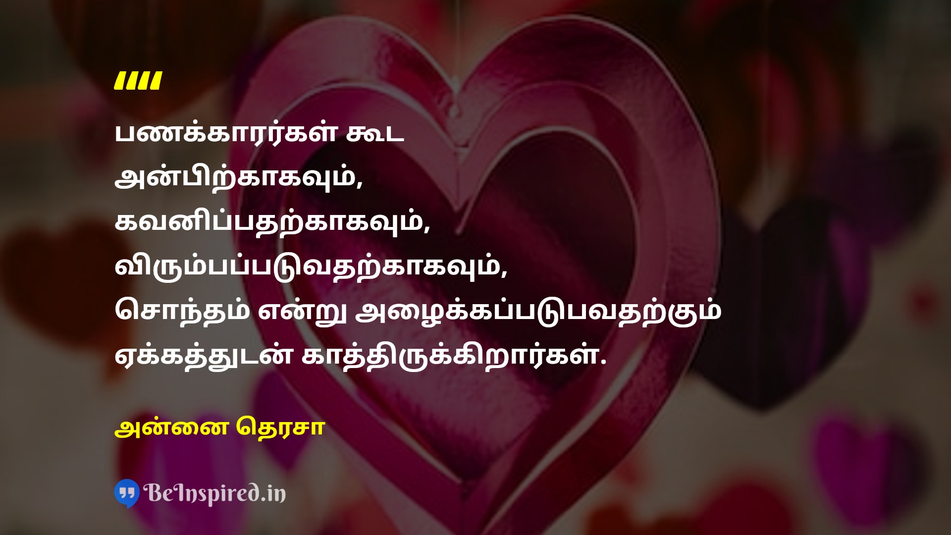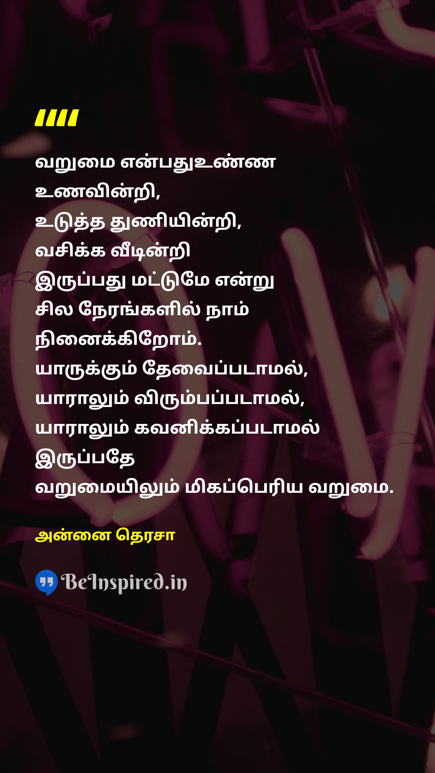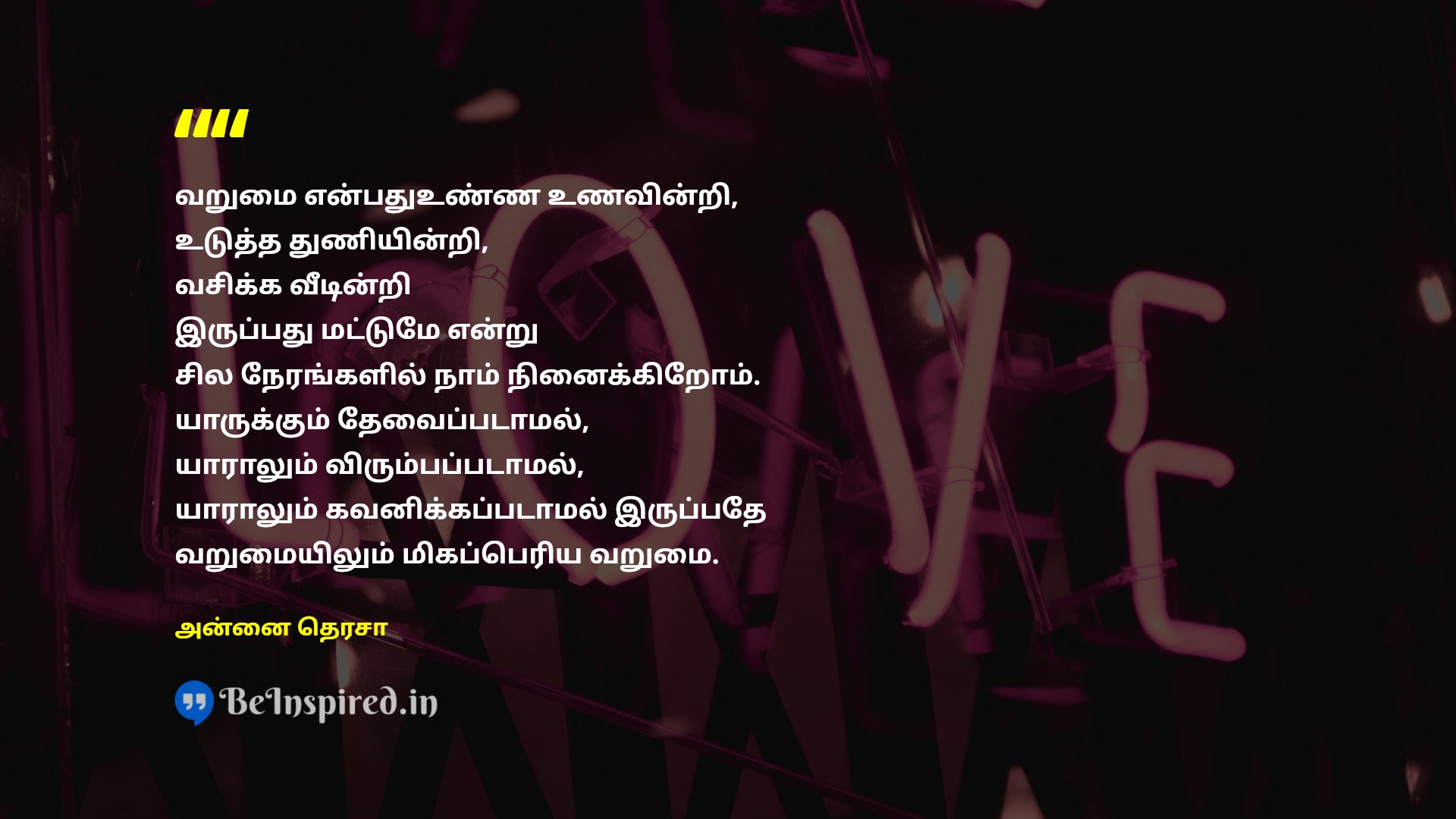 வறுமை என்பதுஉண்ண உணவின்றி, உடுத்த துணியின்றி, வசிக்க வீடின்றி இருப்பது மட்டுமே என்று சில நேரங்களில் நாம் நினைக்கிறோம். யாருக்கும் தேவைப்படாமல், யாராலும் விரும்பப்படாமல், யாராலும் கவனிக்கப்படாமல் இருப்பதே வறுமையிலும் மிகப்பெரிய வறுமை.