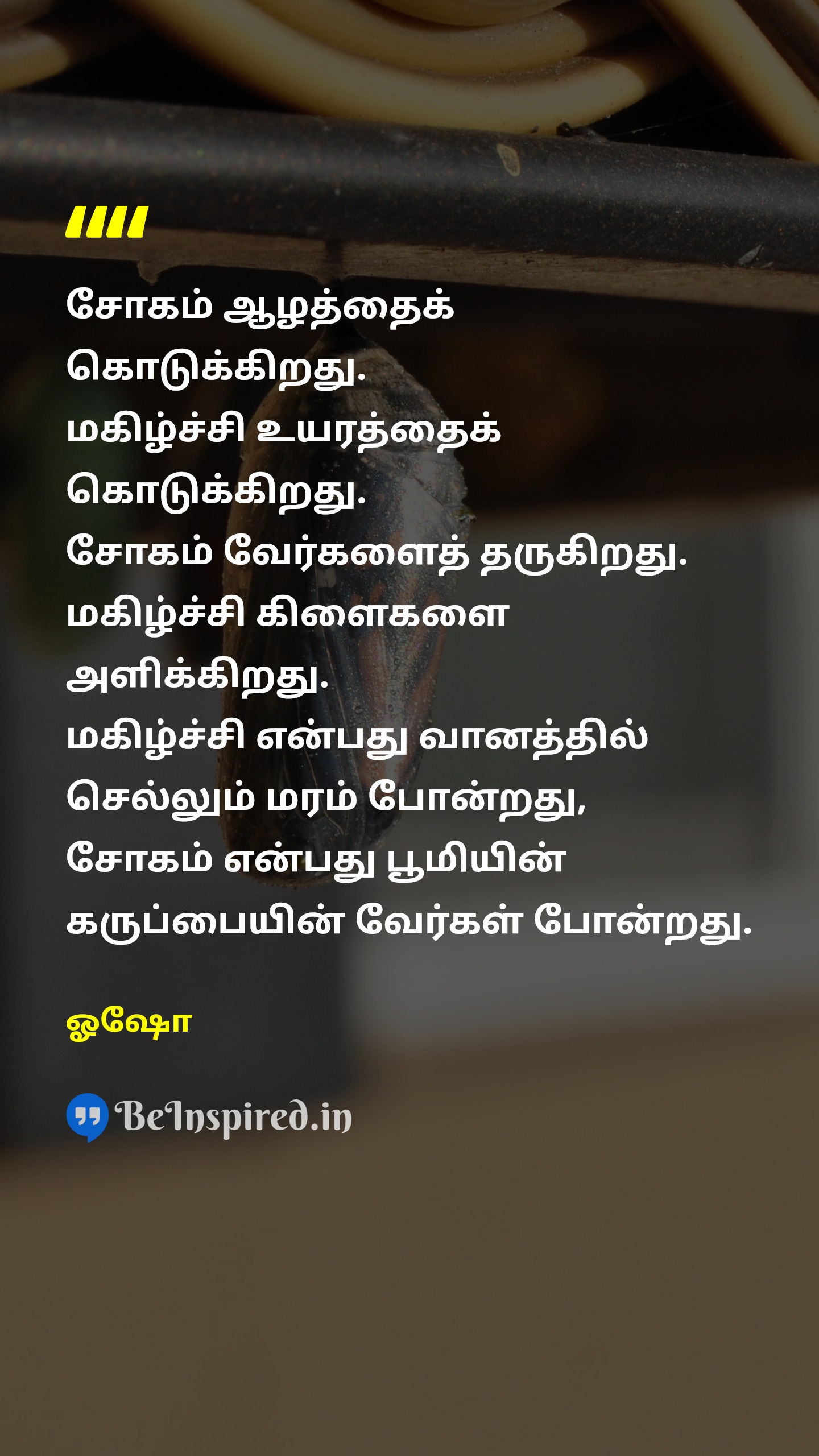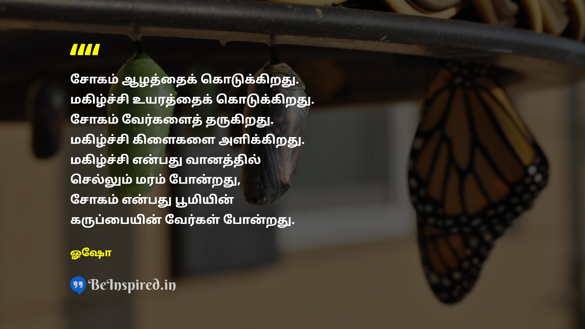 சோகம் ஆழத்தைக் கொடுக்கிறது. மகிழ்ச்சி உயரத்தைக் கொடுக்கிறது. சோகம் வேர்களைத் தருகிறது. மகிழ்ச்சி கிளைகளை அளிக்கிறது. மகிழ்ச்சி என்பது வானத்தில் செல்லும் மரம் போன்றது, சோகம் என்பது பூமியின் கருப்பையின் வேர்கள் போன்றது.