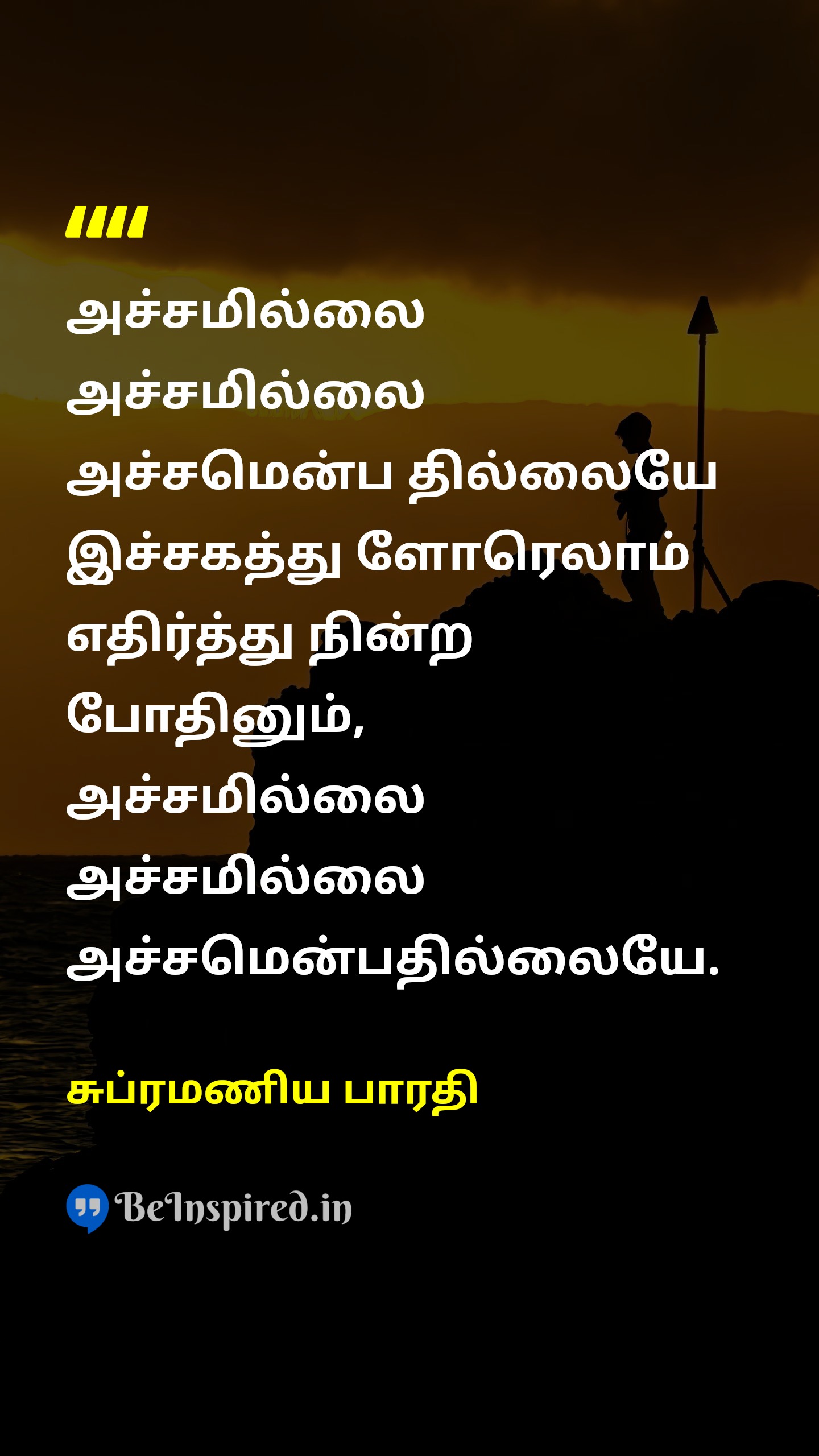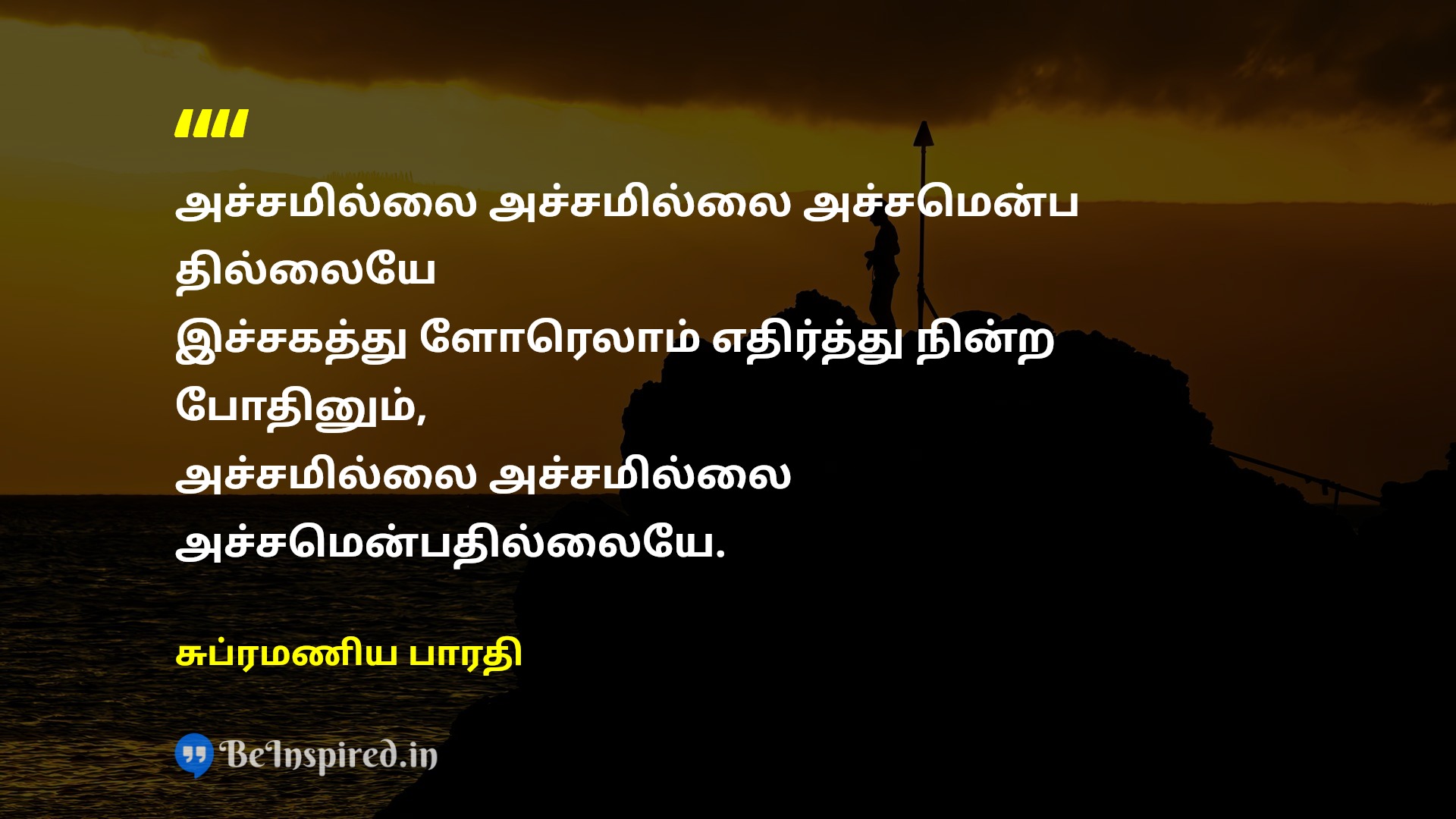 அச்சமில்லை அச்சமில்லை அச்சமென்ப தில்லையே இச்சகத்து ளோரெலாம் எதிர்த்து நின்ற போதினும், அச்சமில்லை அச்சமில்லை அச்சமென்பதில்லையே.