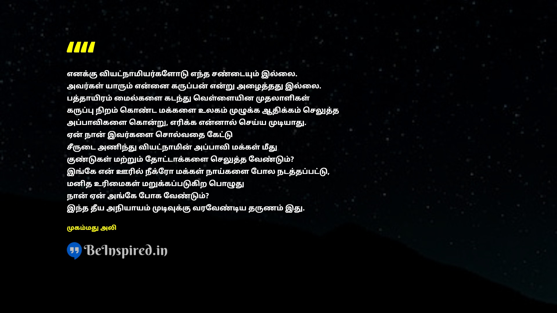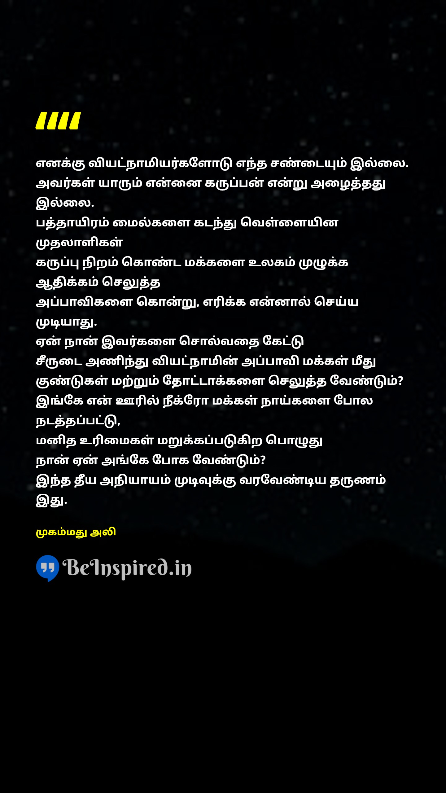 எனக்கு வியட்நாமியர்களோடு எந்த சண்டையும் இல்லை. அவர்கள் யாரும் என்னை கருப்பன் என்று அழைத்தது இல்லை. பத்தாயிரம் மைல்களை கடந்து வெள்ளையின முதலாளிகள் கருப்பு நிறம் கொண்ட மக்களை உலகம் முழுக்க ஆதிக்கம் செலுத்த அப்பாவிகளை கொன்று, எரிக்க என்னால் செய்ய முடியாது. ஏன் நான் இவர்களை சொல்வதை கேட்டு சீருடை அணிந்து வியட்நாமின் அப்பாவி மக்கள் மீது குண்டுகள் மற்றும் தோட்டாக்களை செலுத்த வேண்டும்? இங்கே என் ஊரில் நீக்ரோ மக்கள் நாய்களை போல நடத்தப்பட்டு, மனித உரிமைகள் மறுக்கப்படுகிற பொழுது நான் ஏன் அங்கே போக வேண்டும்? இந்த தீய அநியாயம் முடிவுக்கு வரவேண்டிய தருணம் இது.