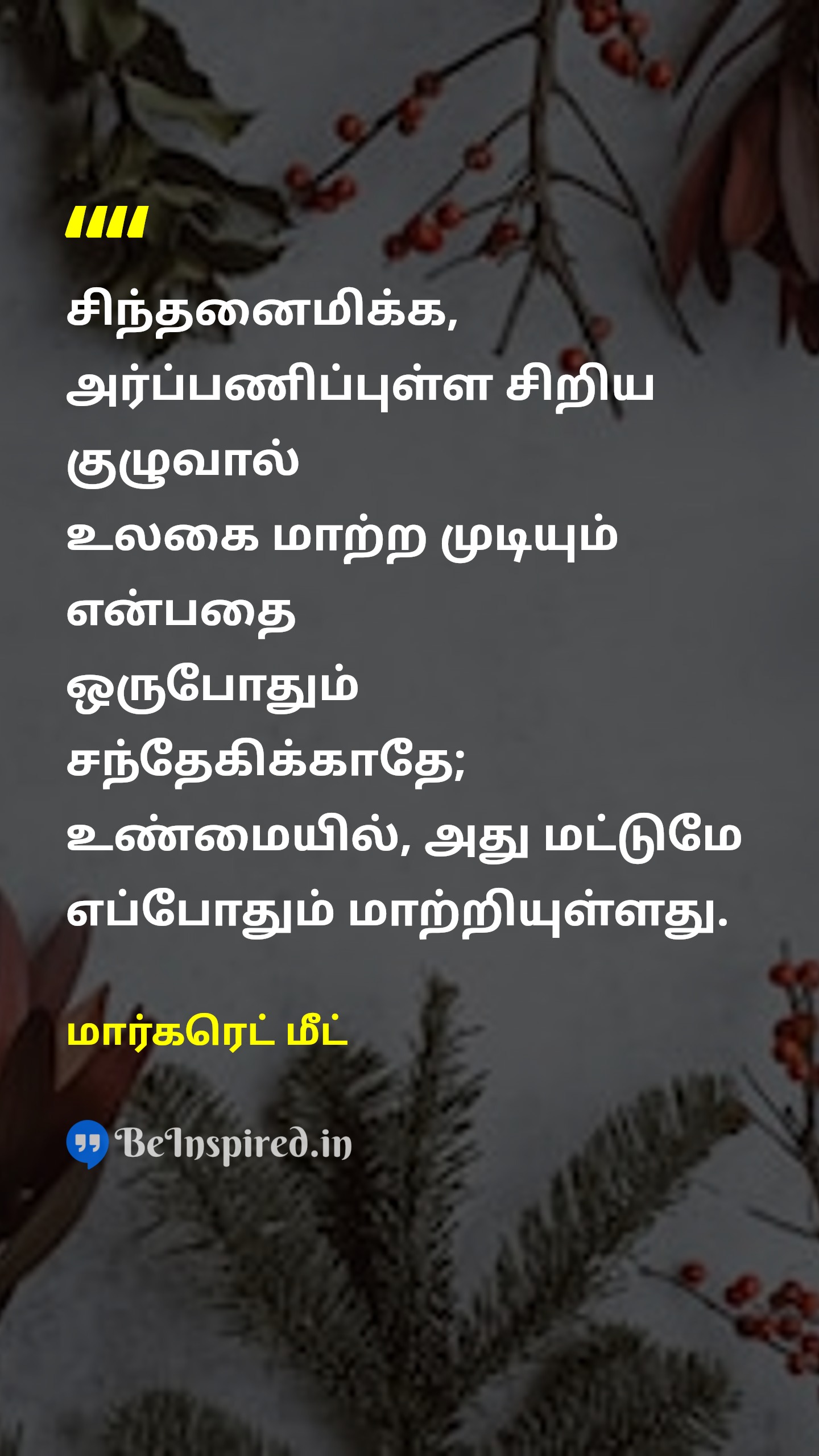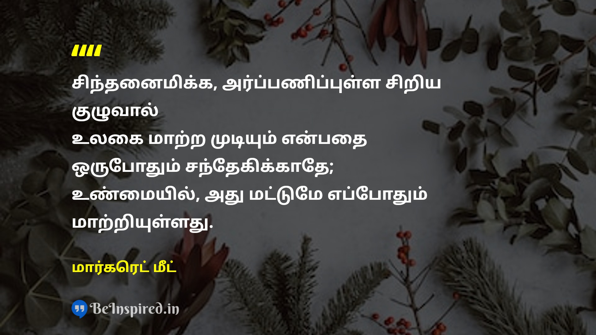 சிந்தனைமிக்க, அர்ப்பணிப்புள்ள சிறிய குழுவால் உலகை மாற்ற முடியும் என்பதை ஒருபோதும் சந்தேகிக்காதே; உண்மையில், அது மட்டுமே எப்போதும் மாற்றியுள்ளது.