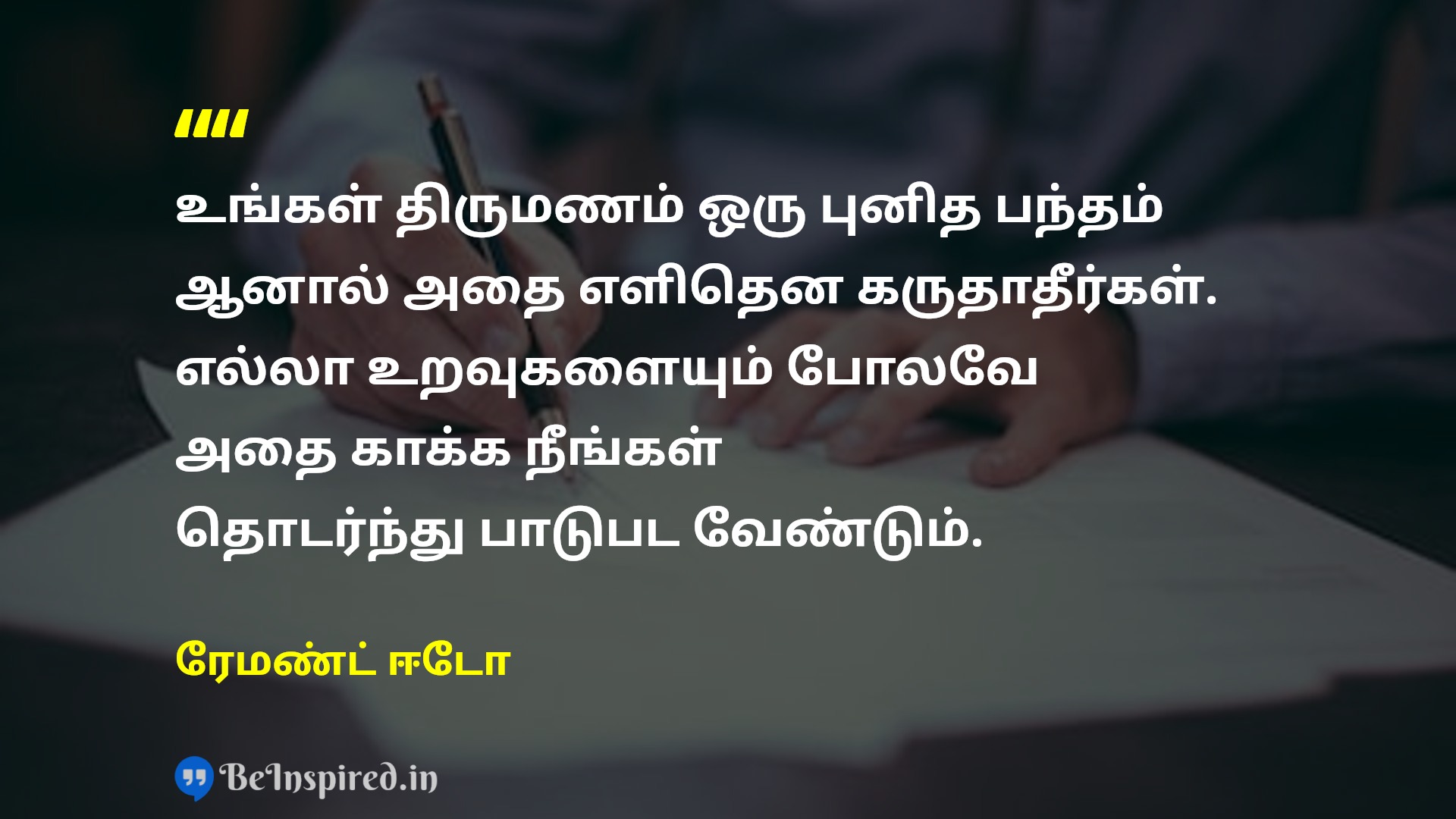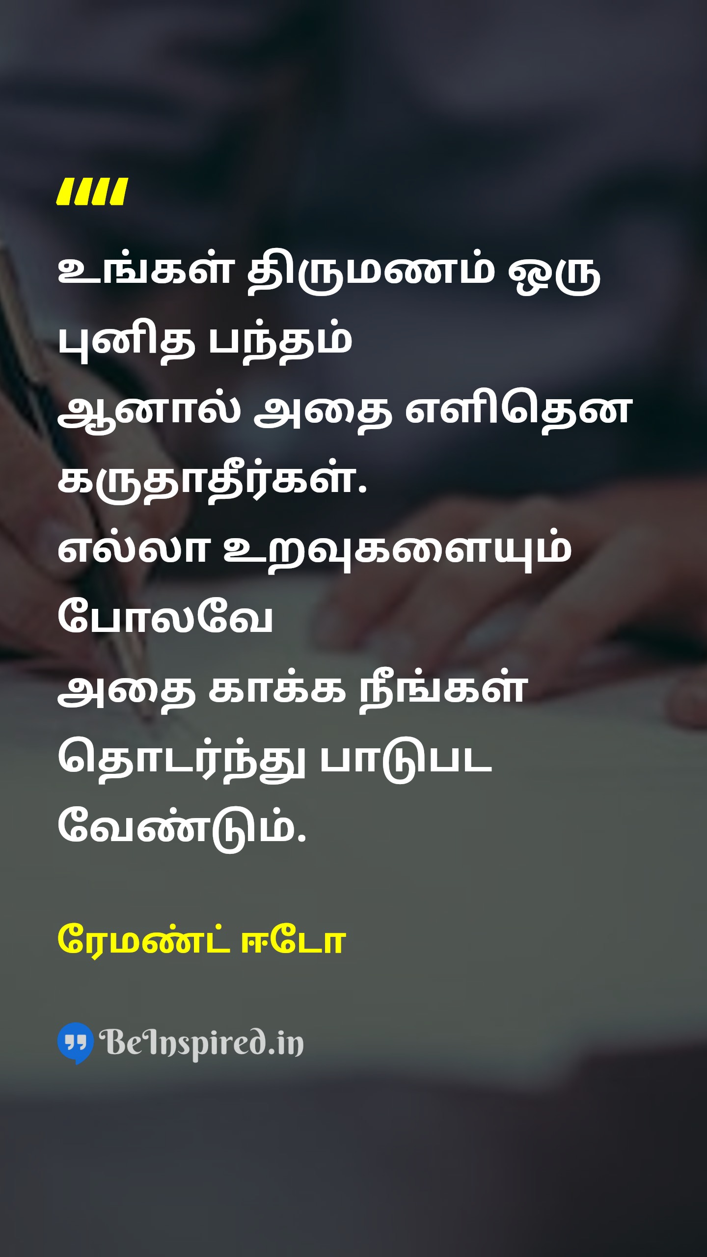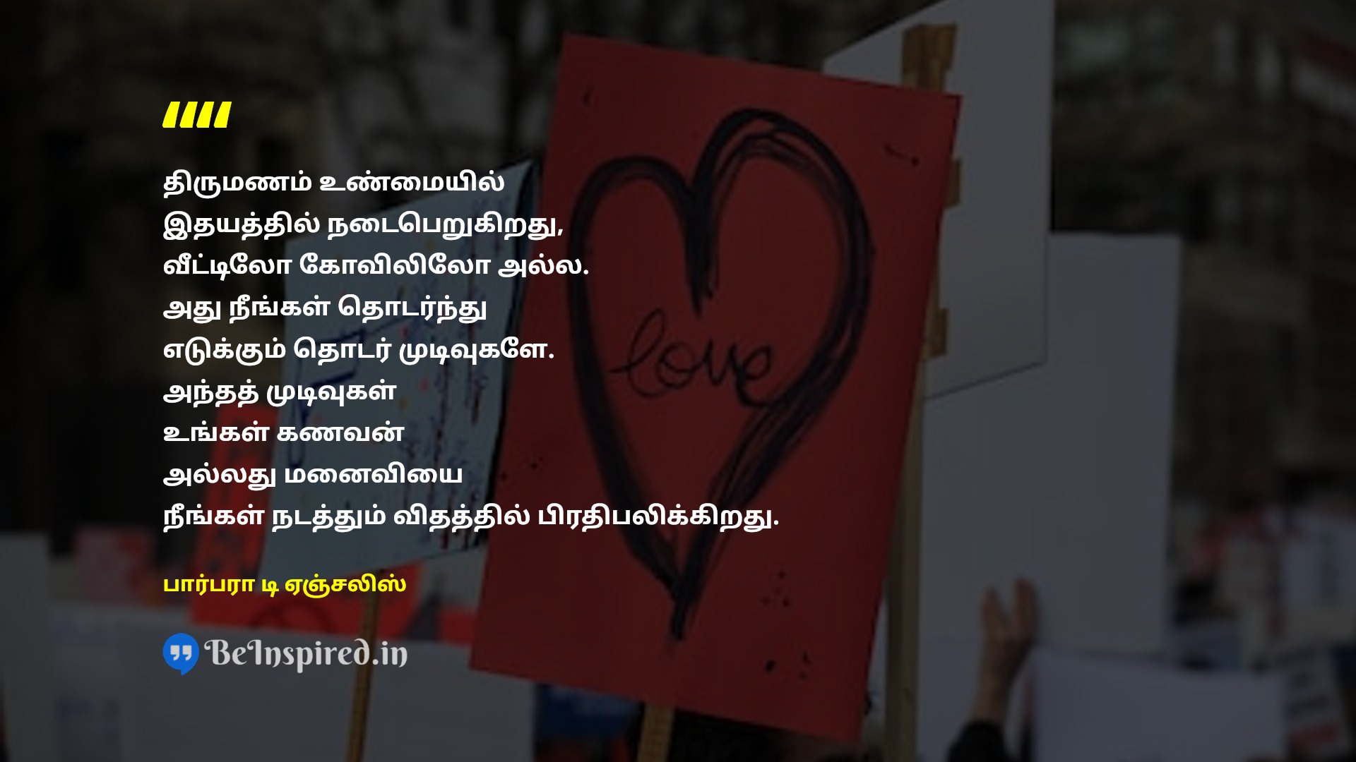 திருமணம் உண்மையில் இதயத்தில் நடைபெறுகிறது, வீட்டிலோ கோவிலிலோ அல்ல. அது நீங்கள் தொடர்ந்து எடுக்கும் தொடர் முடிவுகளே. அந்தத் முடிவுகள் உங்கள் கணவன் அல்லது மனைவியை நீங்கள் நடத்தும் விதத்தில் பிரதிபலிக்கிறது.