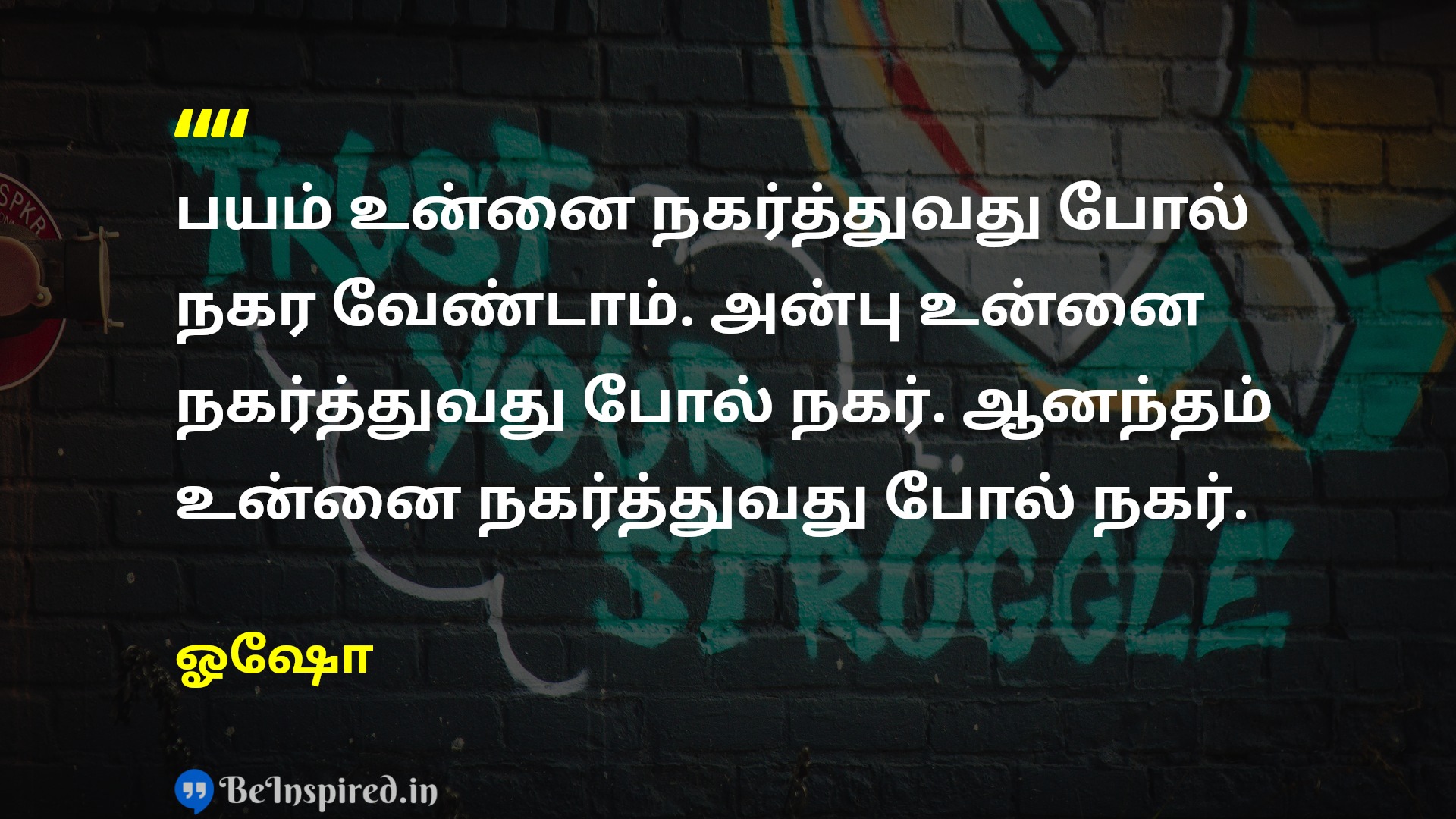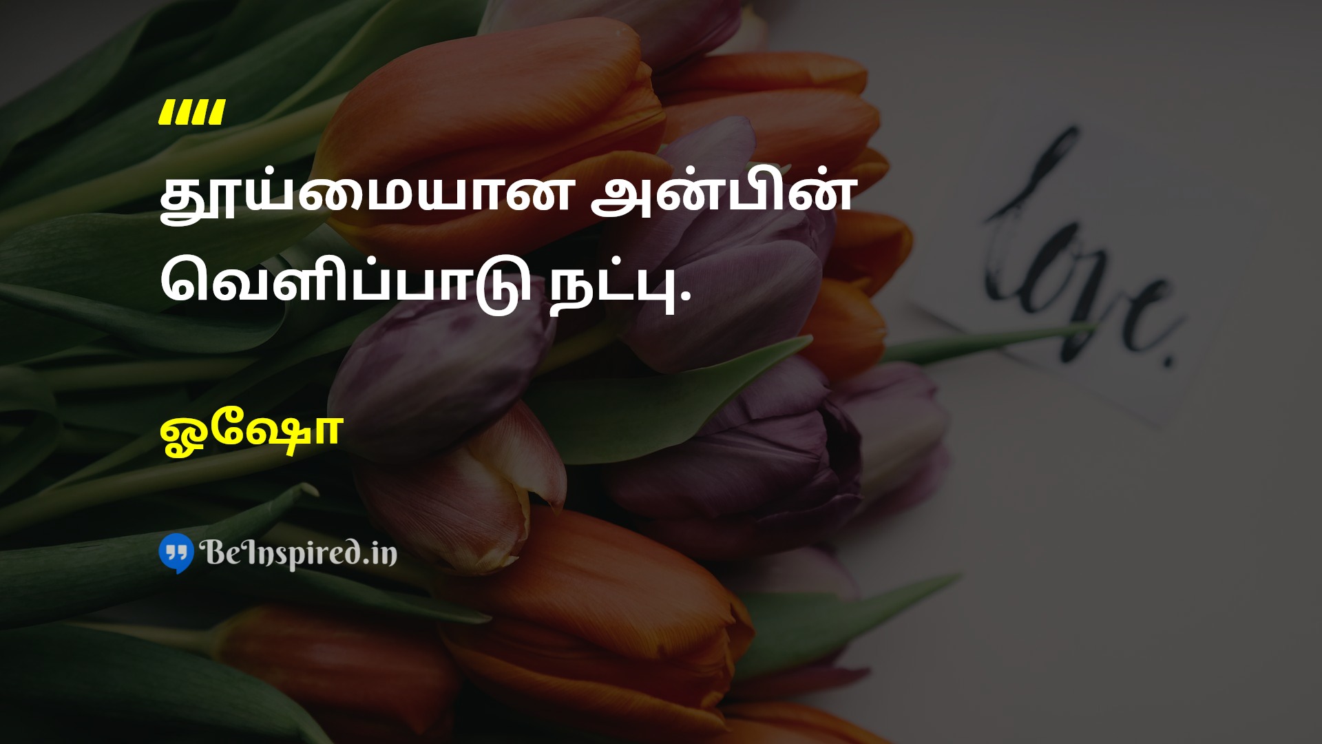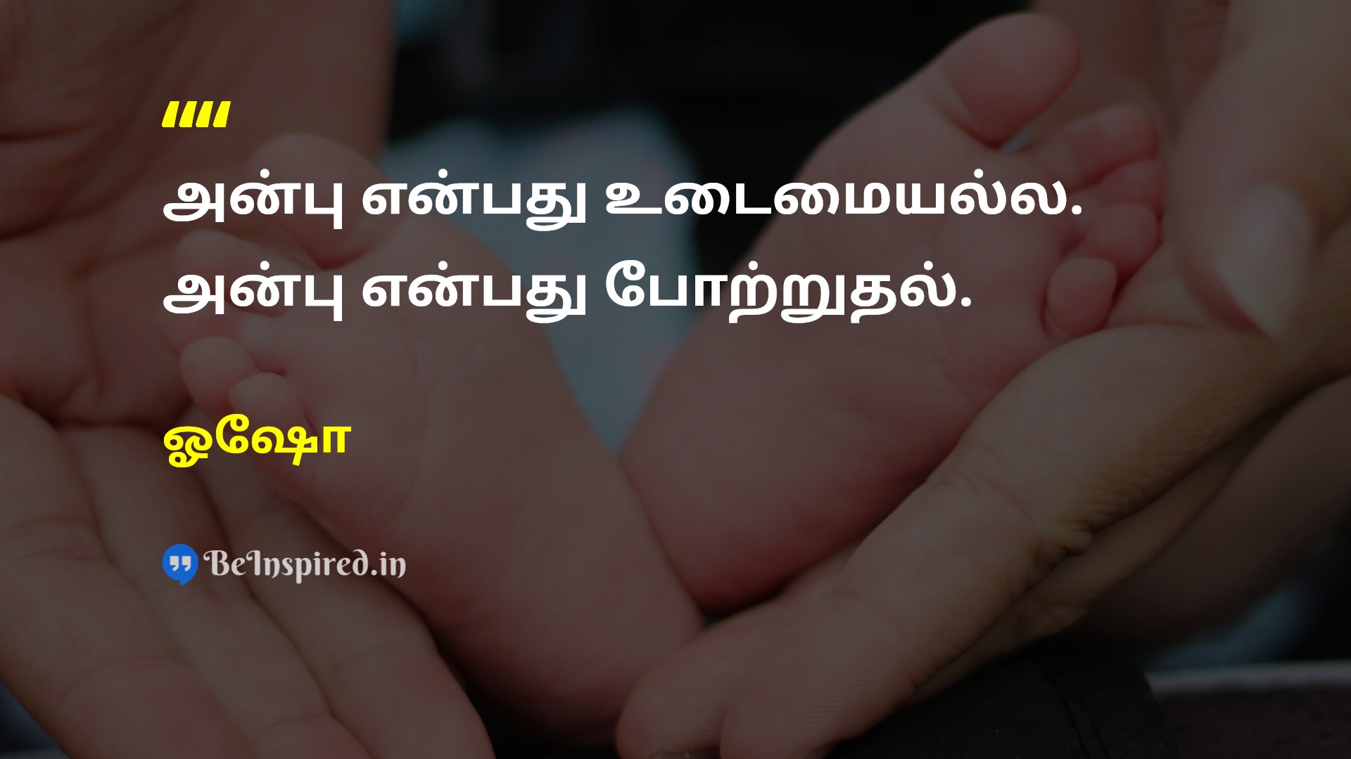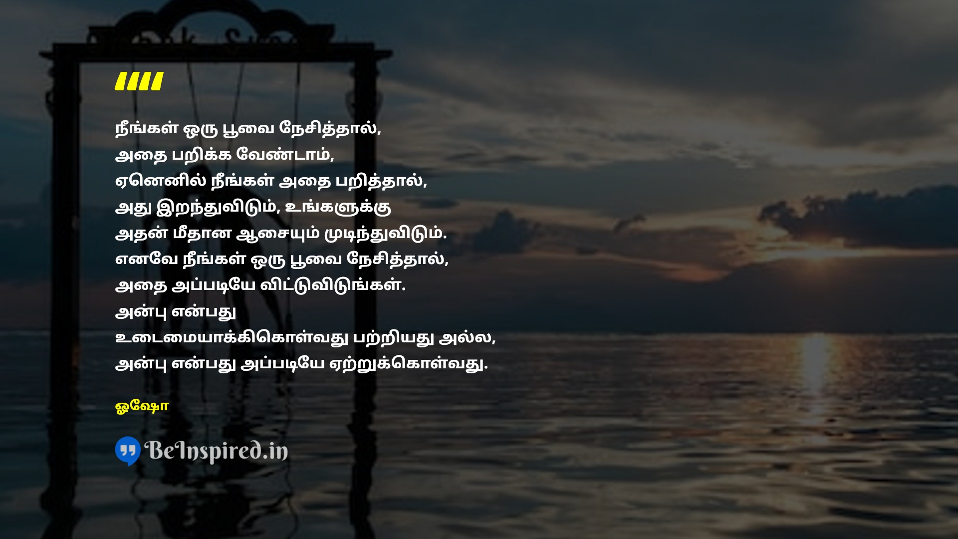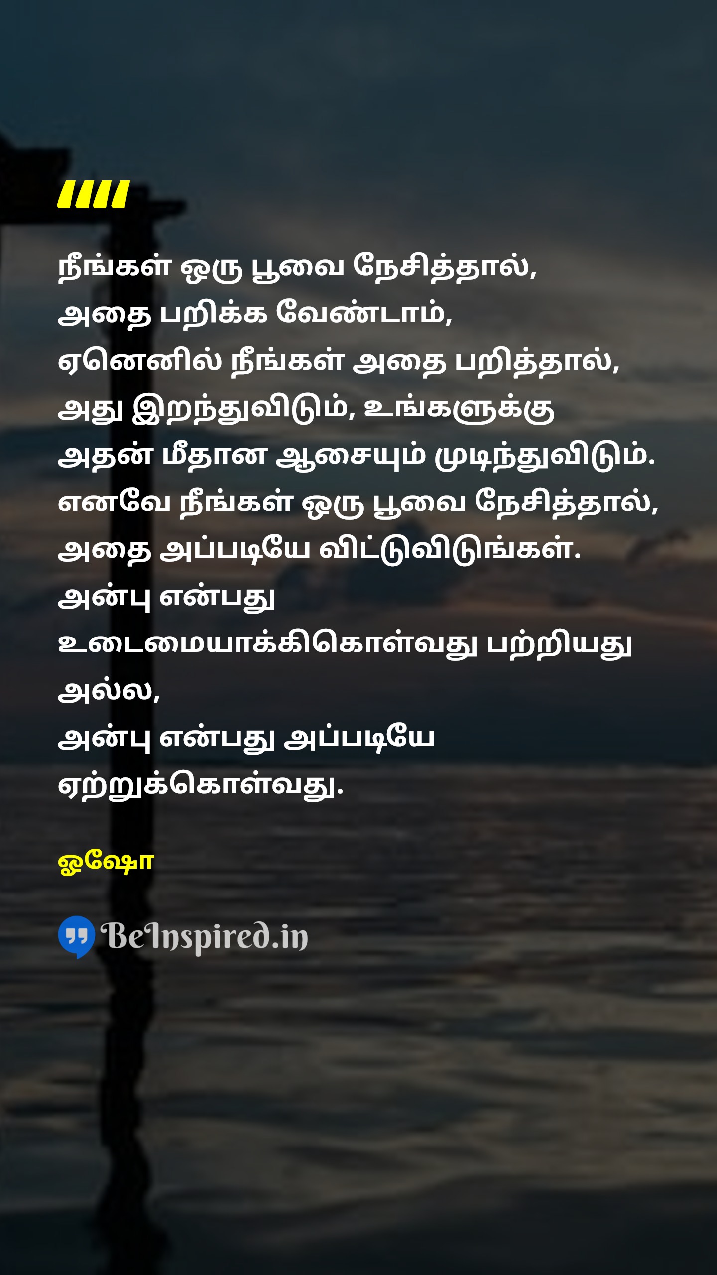 நீங்கள் ஒரு பூவை நேசித்தால், அதை பறிக்க வேண்டாம், ஏனெனில் நீங்கள் அதை பறித்தால், அது இறந்துவிடும், உங்களுக்கு அதன் மீதான ஆசையும் முடிந்துவிடும். எனவே நீங்கள் ஒரு பூவை நேசித்தால், அதை அப்படியே விட்டுவிடுங்கள். அன்பு என்பது உடைமையாக்கிகொள்வது பற்றியது அல்ல, அன்பு என்பது அப்படியே ஏற்றுக்கொள்வது.