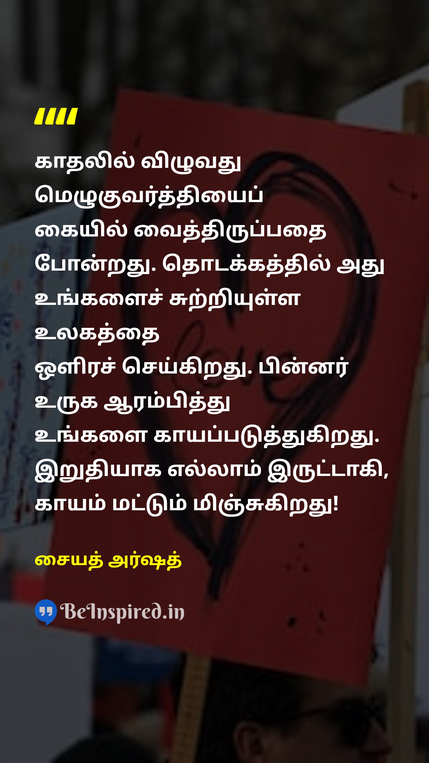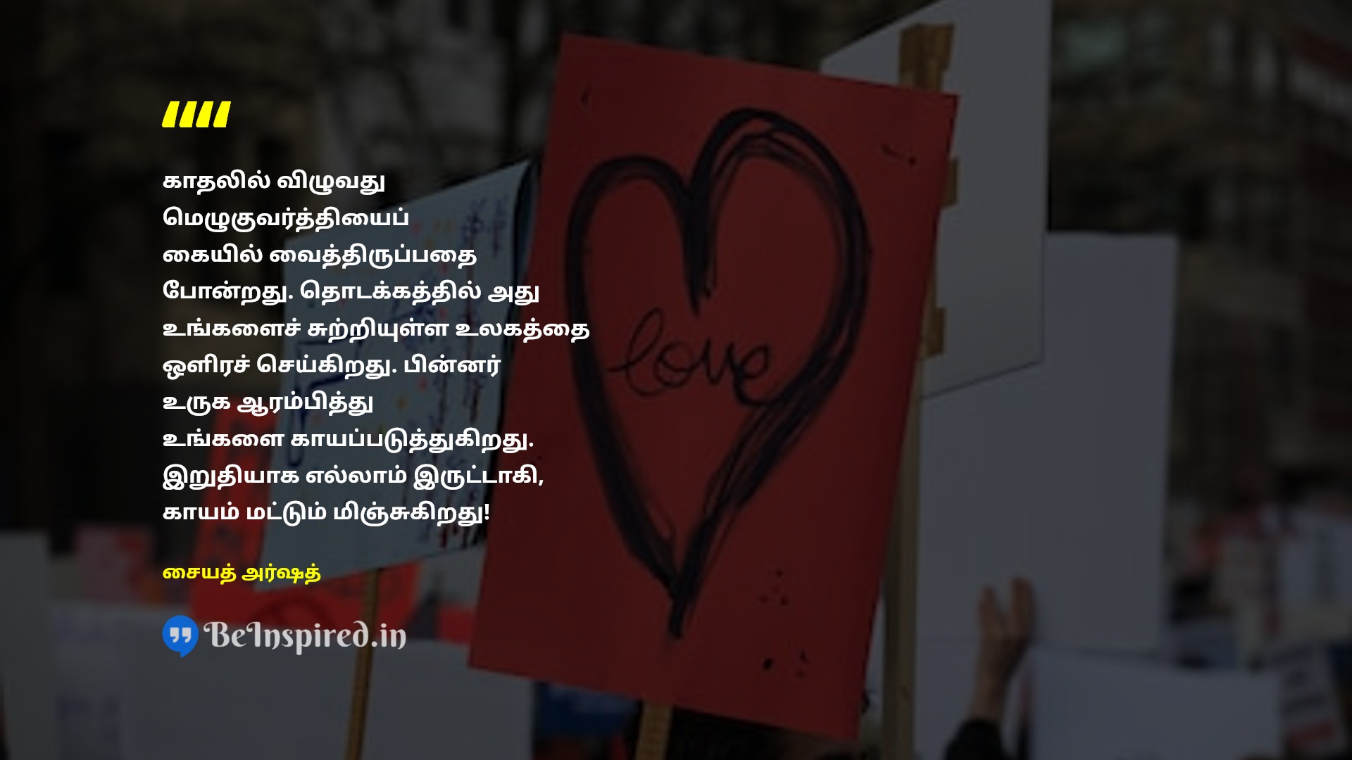 காதலில் விழுவது மெழுகுவர்த்தியைப் கையில் வைத்திருப்பதை போன்றது. தொடக்கத்தில் அது உங்களைச் சுற்றியுள்ள உலகத்தை ஒளிரச் செய்கிறது. பின்னர் உருக ஆரம்பித்து உங்களை காயப்படுத்துகிறது. இறுதியாக எல்லாம் இருட்டாகி, காயம் மட்டும் மிஞ்சுகிறது!