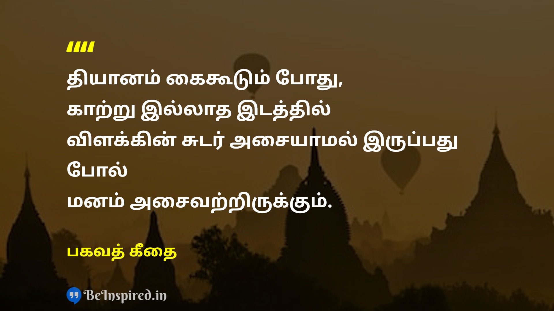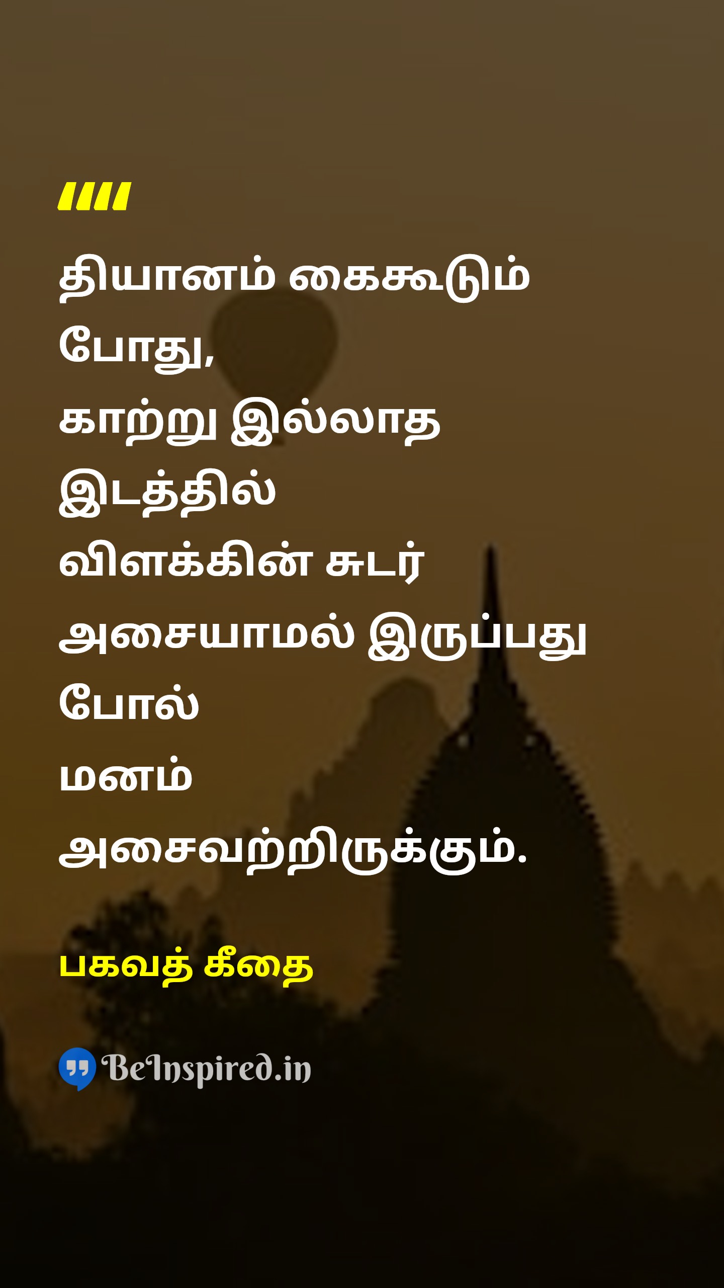 தியானம் கைகூடும் போது, காற்று இல்லாத இடத்தில் விளக்கின் சுடர் அசையாமல் இருப்பது போல் மனம் அசைவற்றிருக்கும்.