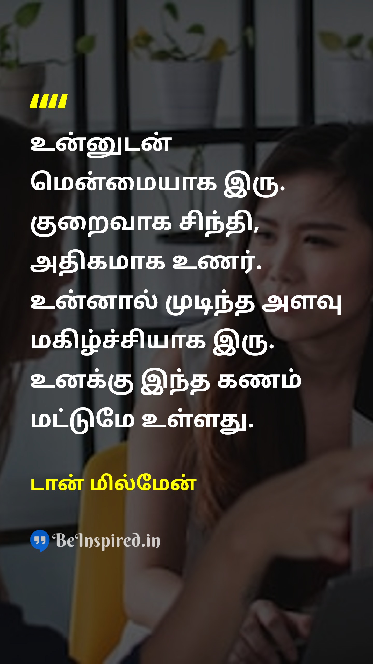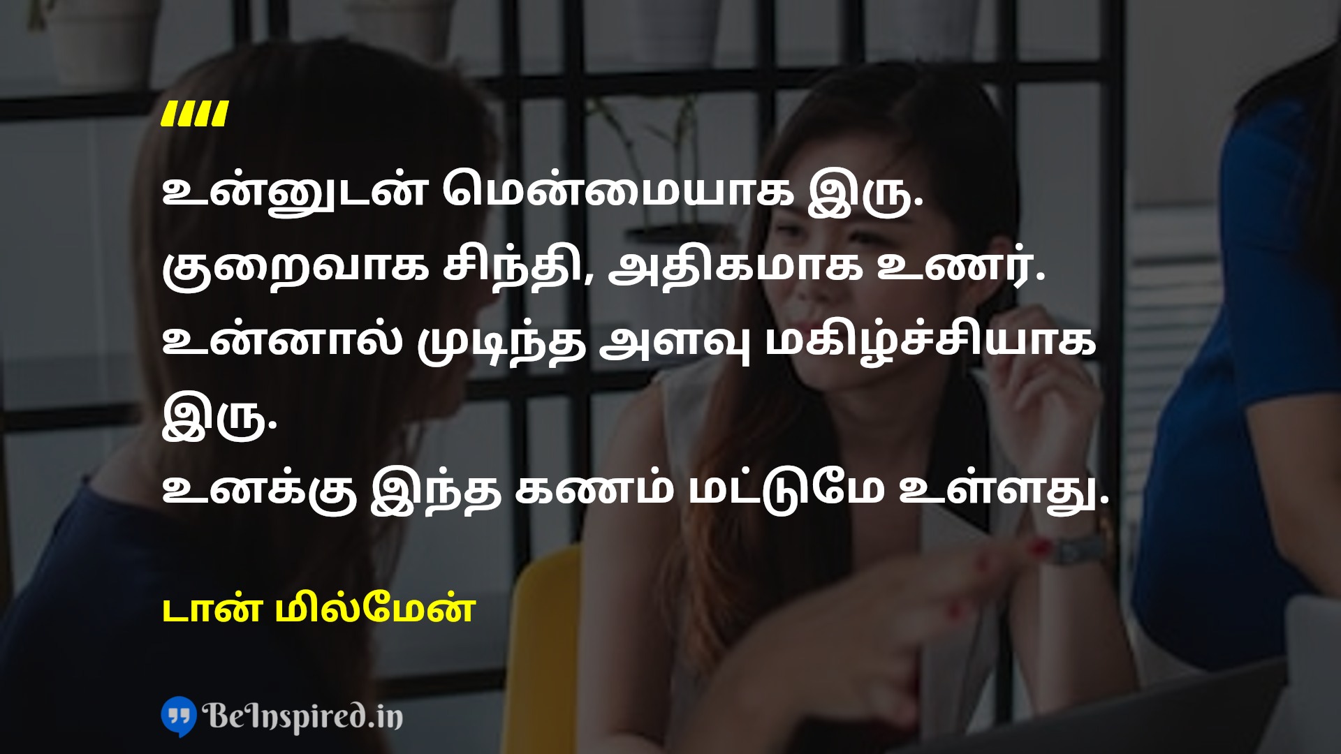 உன்னுடன் மென்மையாக இரு. குறைவாக சிந்தி, அதிகமாக உணர். உன்னால் முடிந்த அளவு மகிழ்ச்சியாக இரு. உனக்கு இந்த கணம் மட்டுமே உள்ளது.