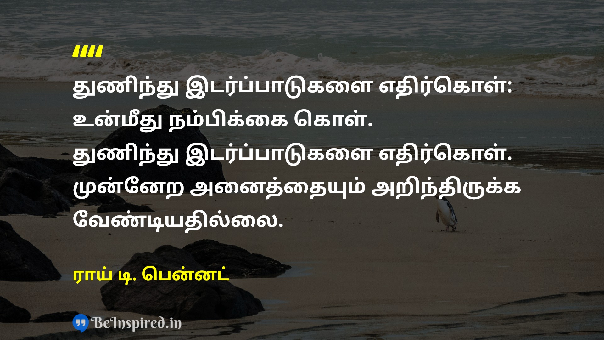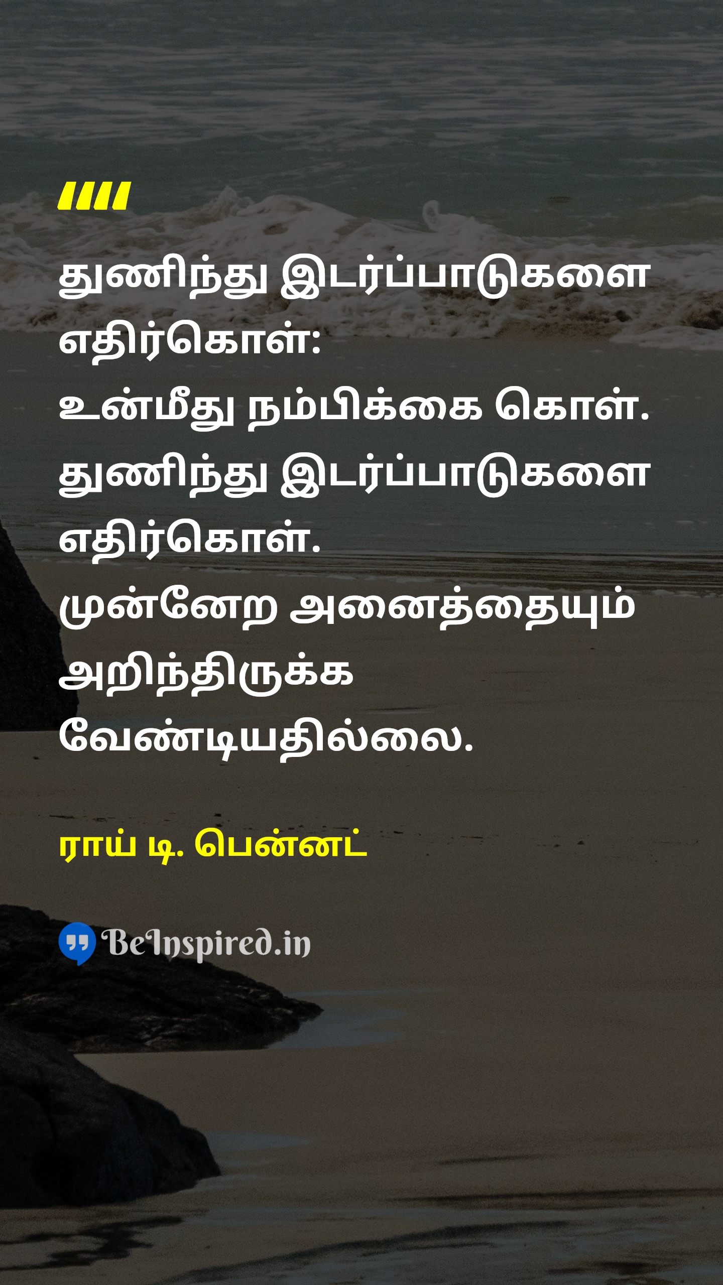 துணிந்து இடர்ப்பாடுகளை எதிர்கொள்: உன்மீது நம்பிக்கை கொள். துணிந்து இடர்ப்பாடுகளை எதிர்கொள். முன்னேற அனைத்தையும் அறிந்திருக்க வேண்டியதில்லை.