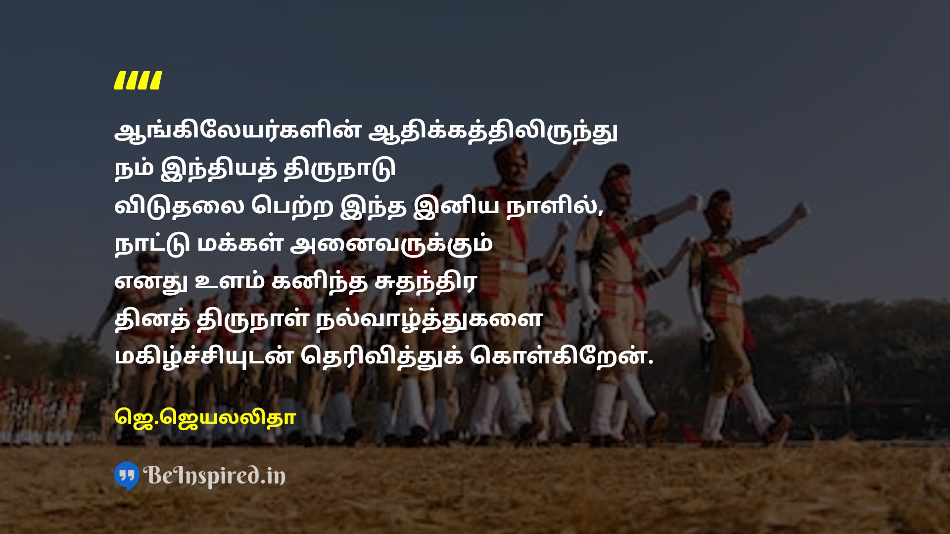 ஆங்கிலேயர்களின் ஆதிக்கத்திலிருந்து நம் இந்தியத் திருநாடு விடுதலை பெற்ற இந்த இனிய நாளில், நாட்டு மக்கள் அனைவருக்கும் எனது உளம் கனிந்த சுதந்திர தினத் திருநாள் நல்வாழ்த்துகளை மகிழ்ச்சியுடன் தெரிவித்துக் கொள்கிறேன்.