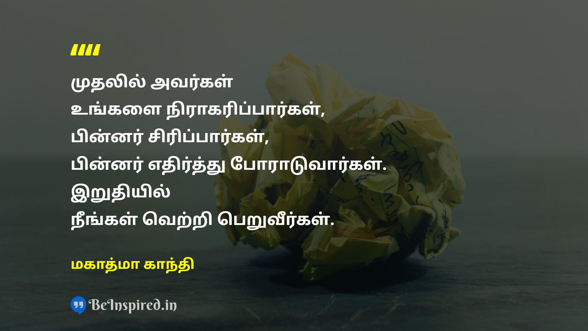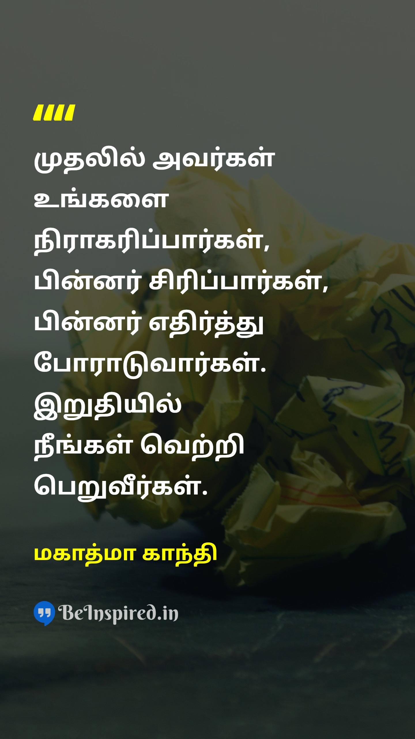 முதலில் அவர்கள் உங்களை நிராகரிப்பார்கள், பின்னர் சிரிப்பார்கள், பின்னர் எதிர்த்து போராடுவார்கள். இறுதியில் நீங்கள் வெற்றி பெறுவீர்கள்.