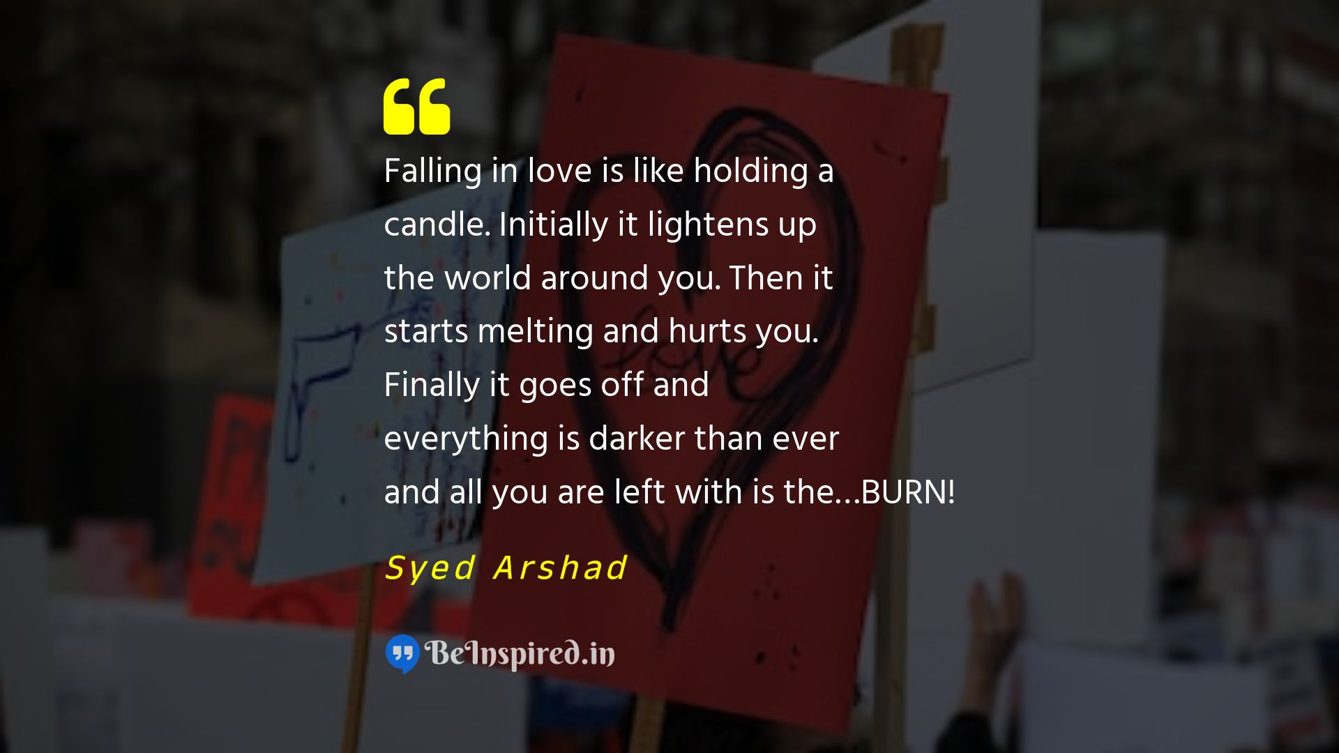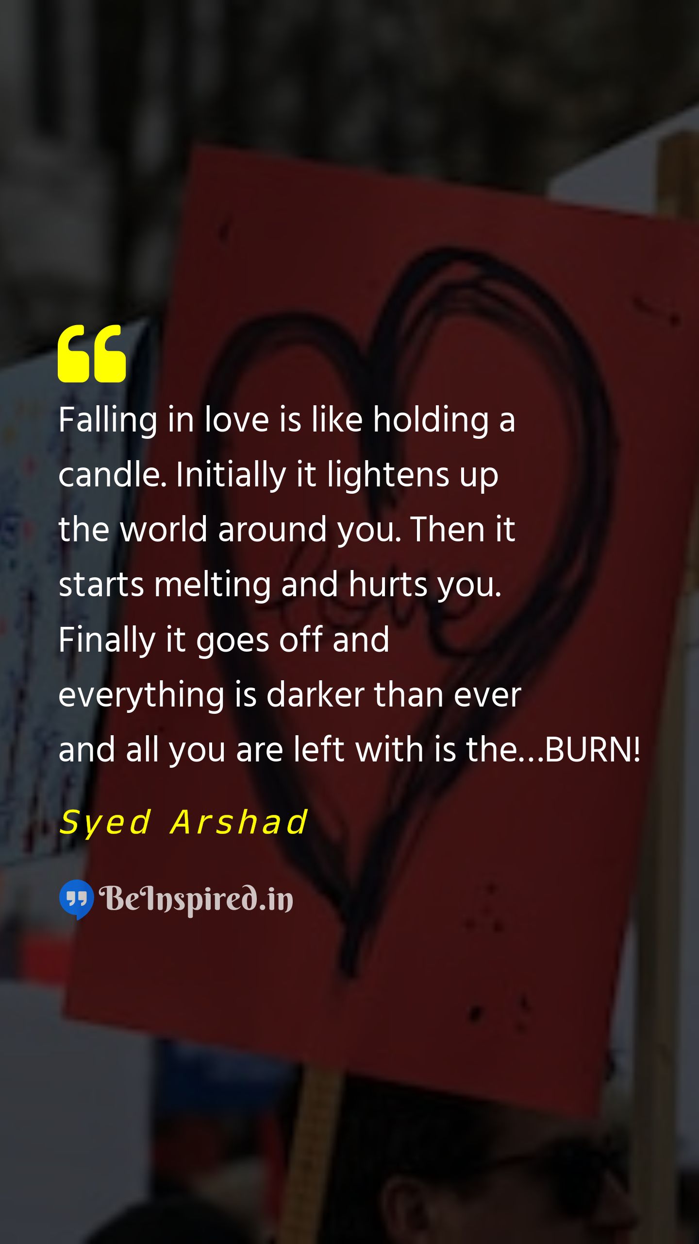 Falling in love is like holding a candle. Initially it lightens up the world around you. Then it starts melting and hurts you. Finally it goes off and everything is darker than ever and all you are left with is the…BURN!
