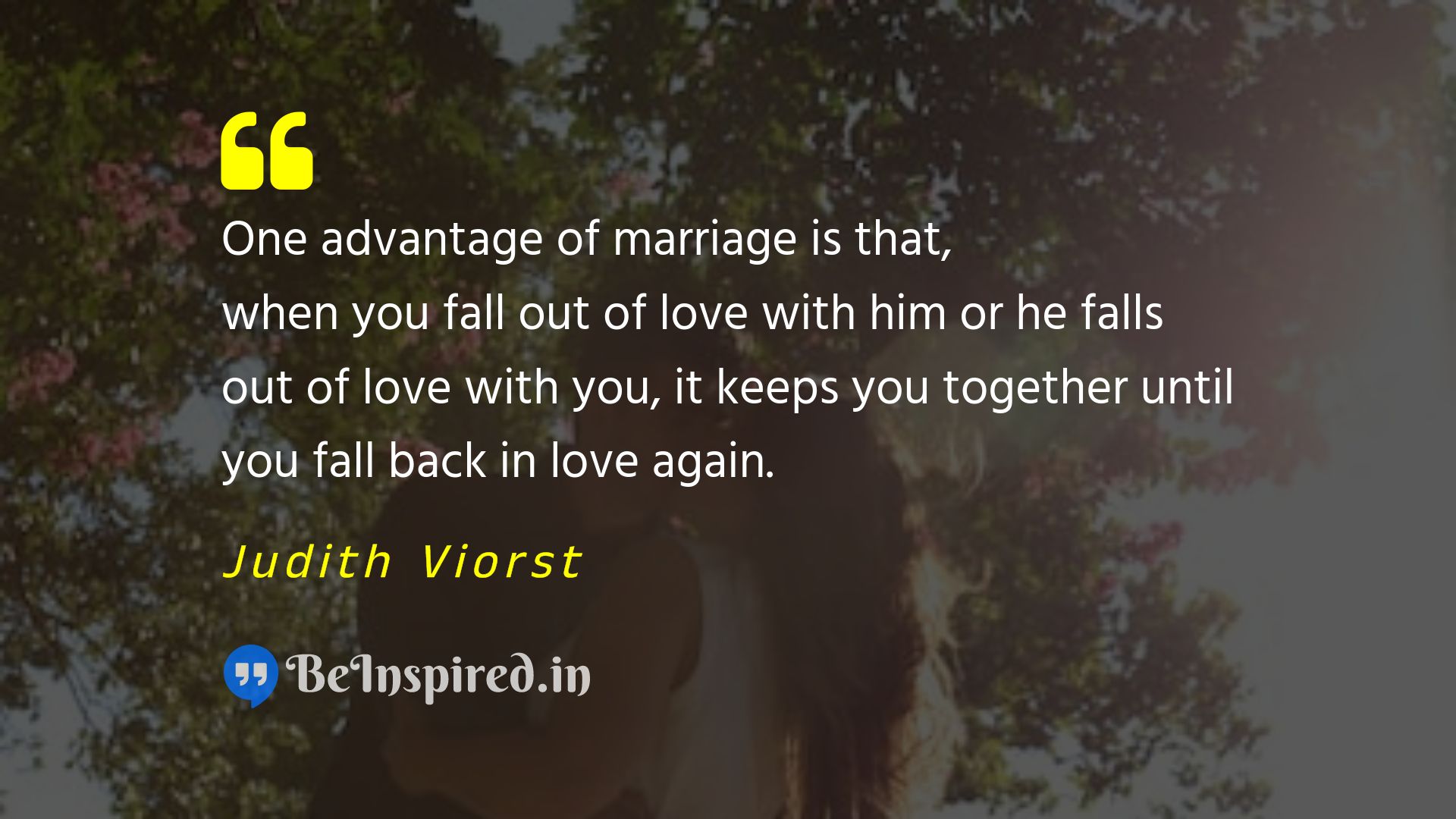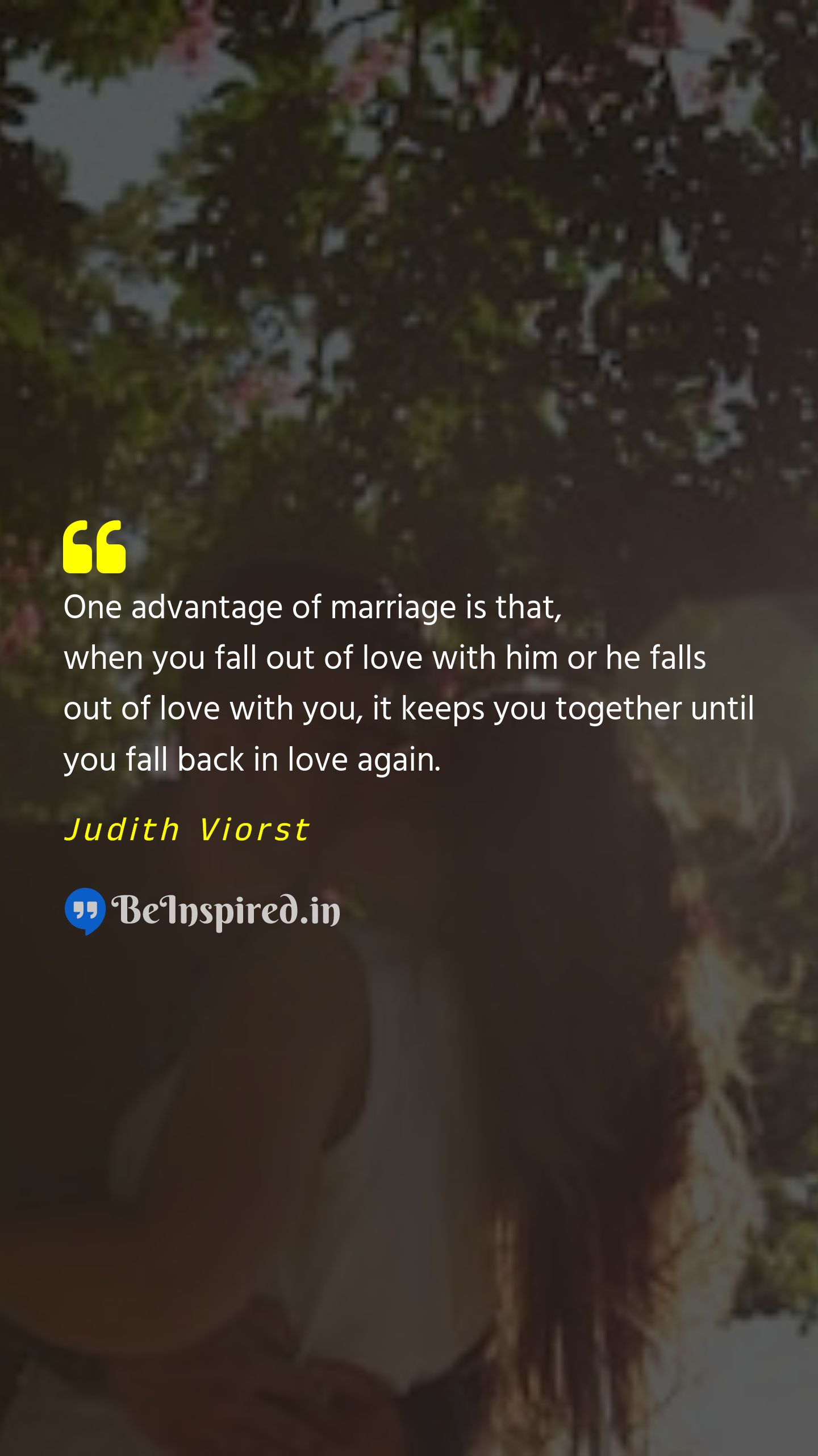 One advantage of marriage is that, when you fall out of love with him or he falls out of love with you, it keeps you together until you fall back in love again.