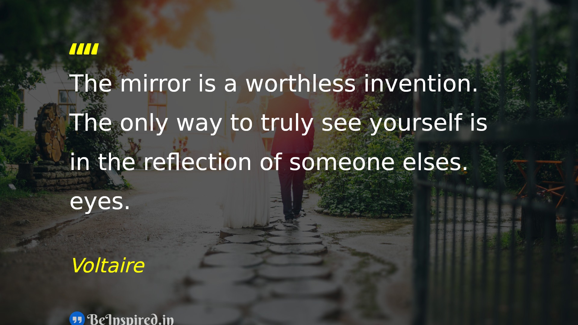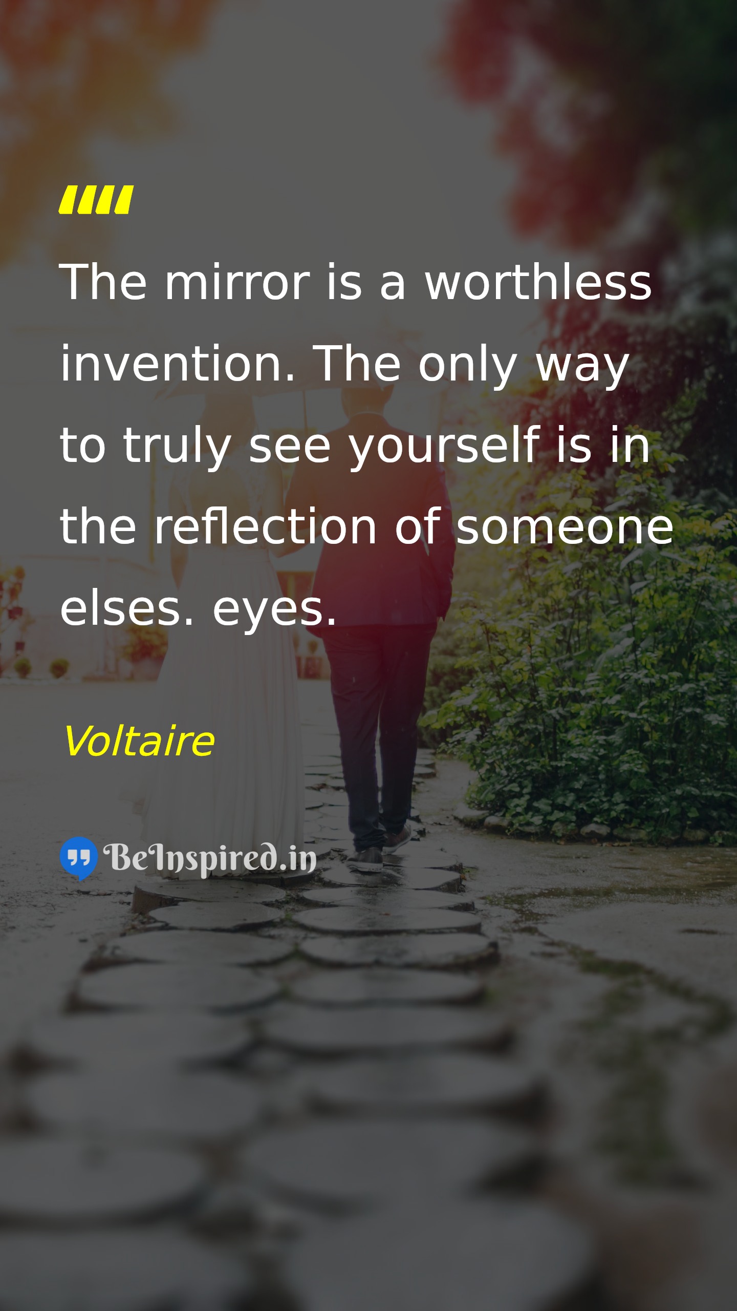 The mirror is a worthless invention. The only way to truly see yourself is in the reflection of someone elses. eyes.