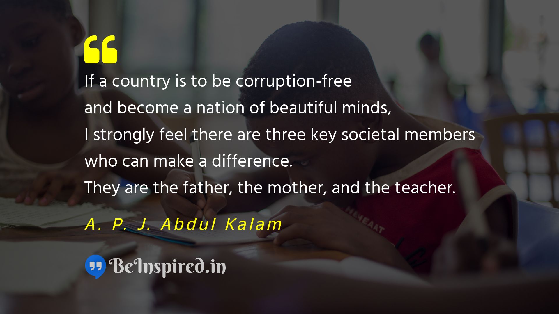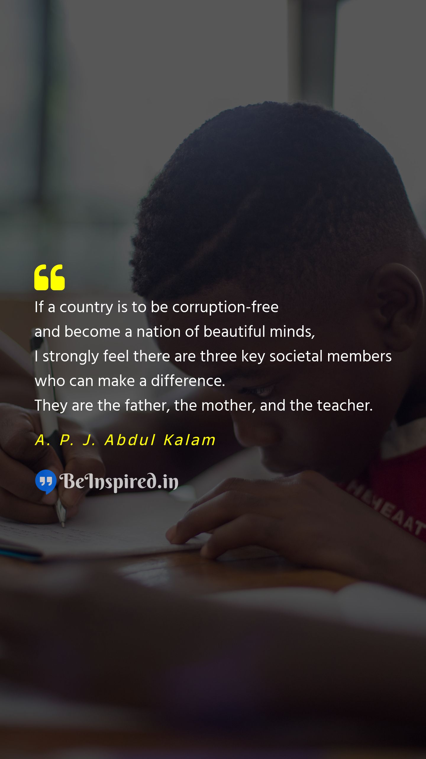 If a country is to be corruption-free and become a nation of beautiful minds, I strongly feel there are three key societal members who can make a difference. They are the father, the mother, and the teacher.
