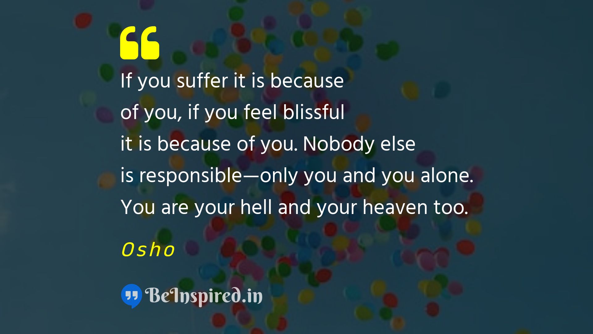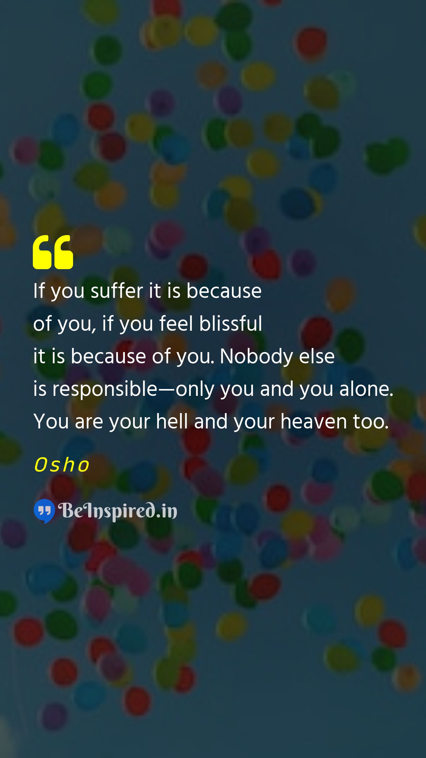 If you suffer it is because of you, if you feel blissful it is because of you. Nobody else is responsible—only you and you alone. You are your hell and your heaven too.
