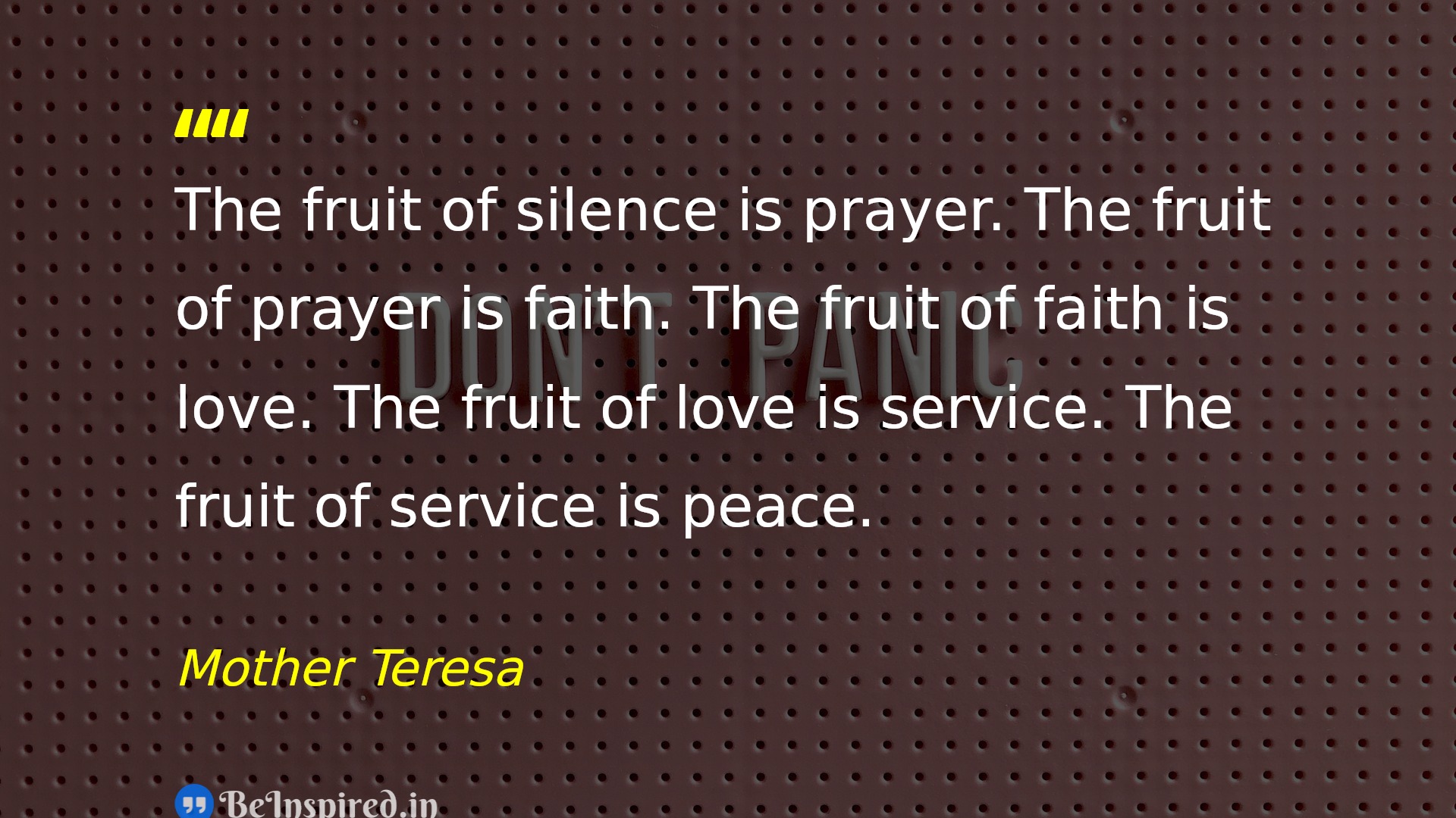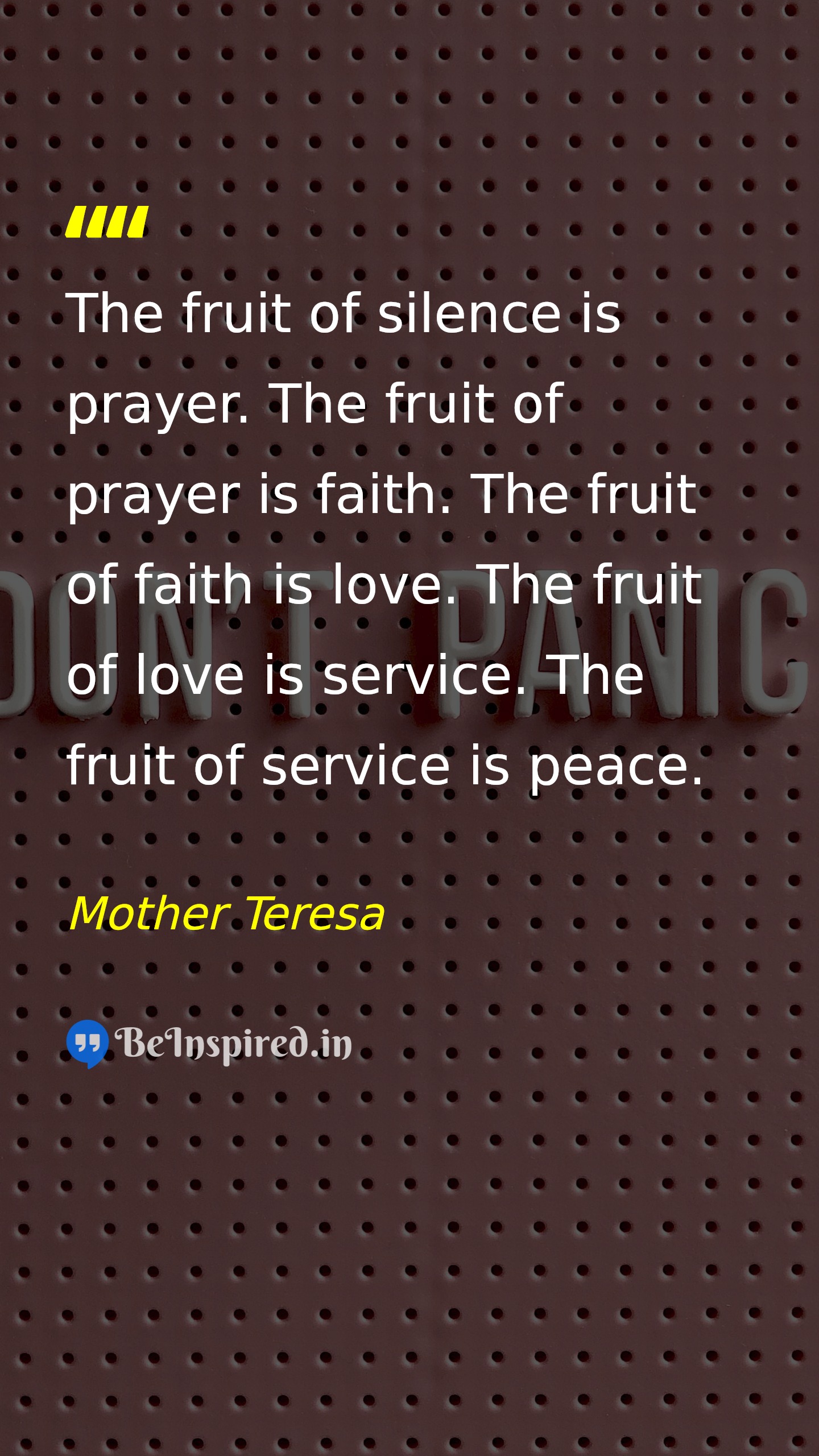 The fruit of silence is prayer. The fruit of prayer is faith. The fruit of faith is love. The fruit of love is service. The fruit of service is peace.